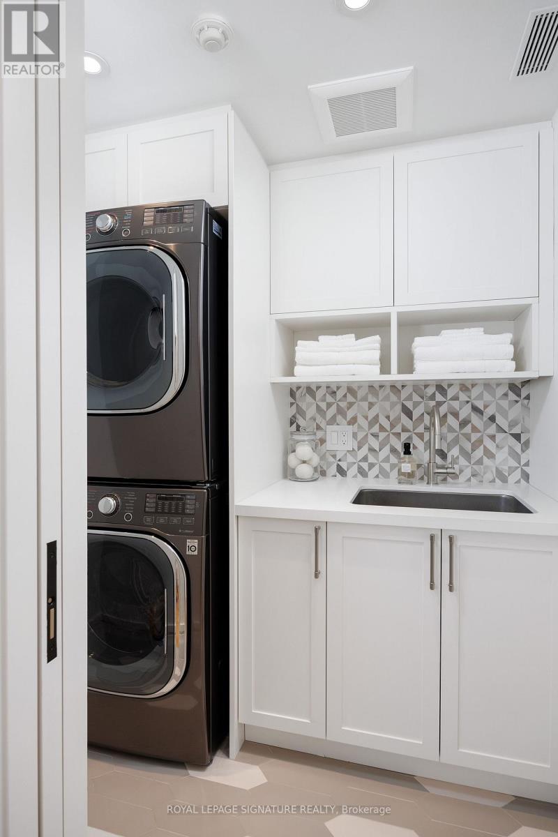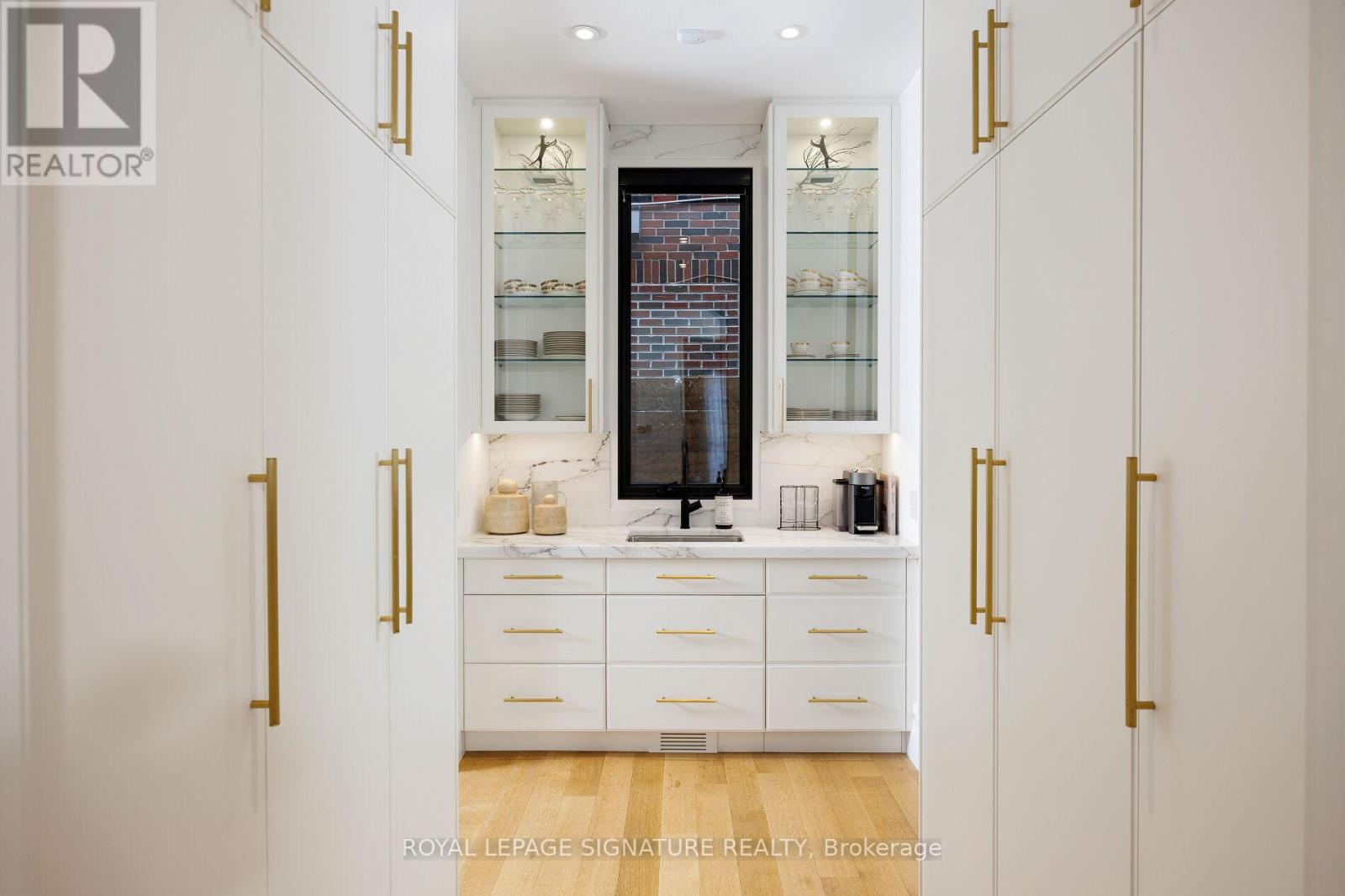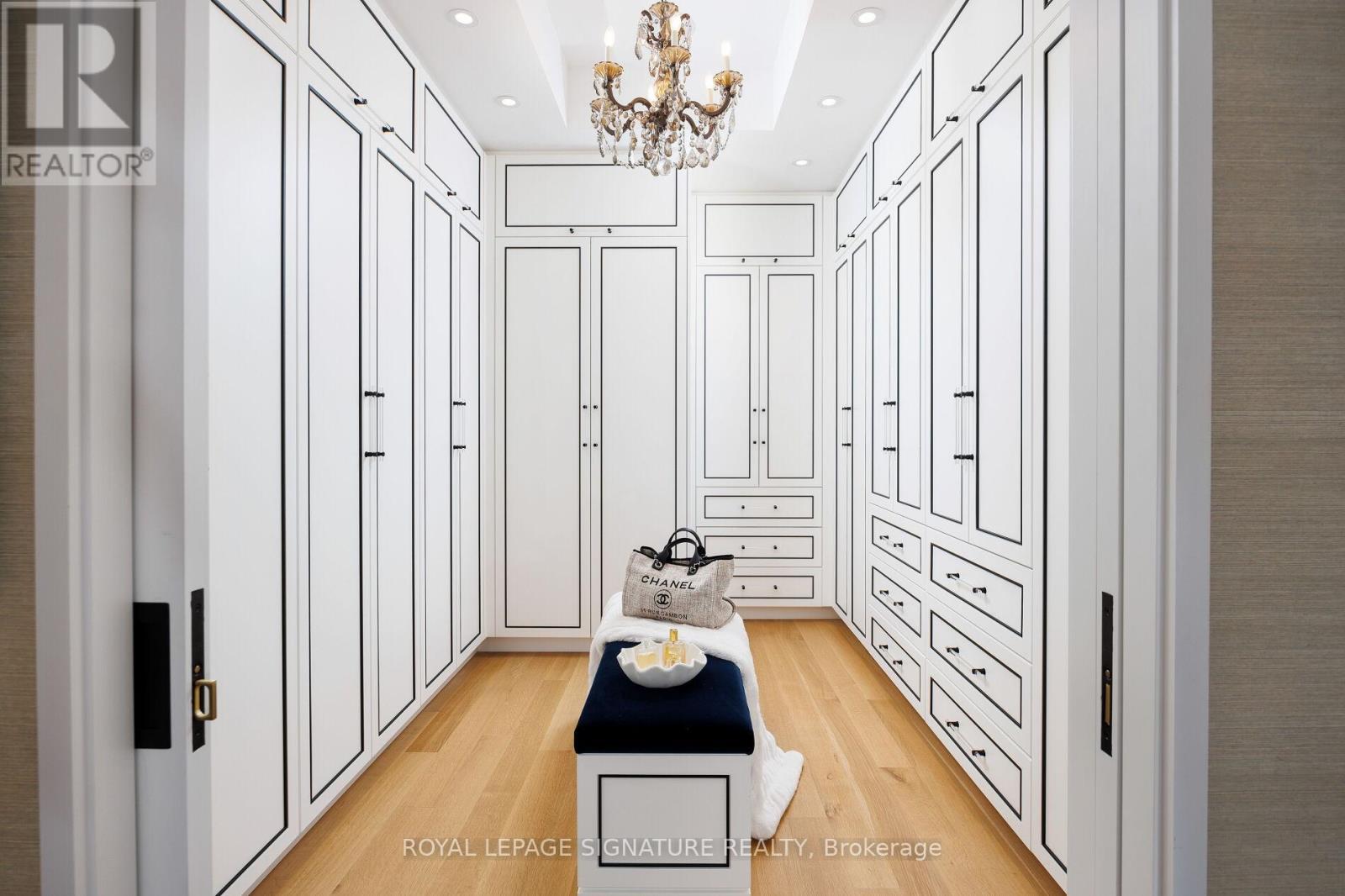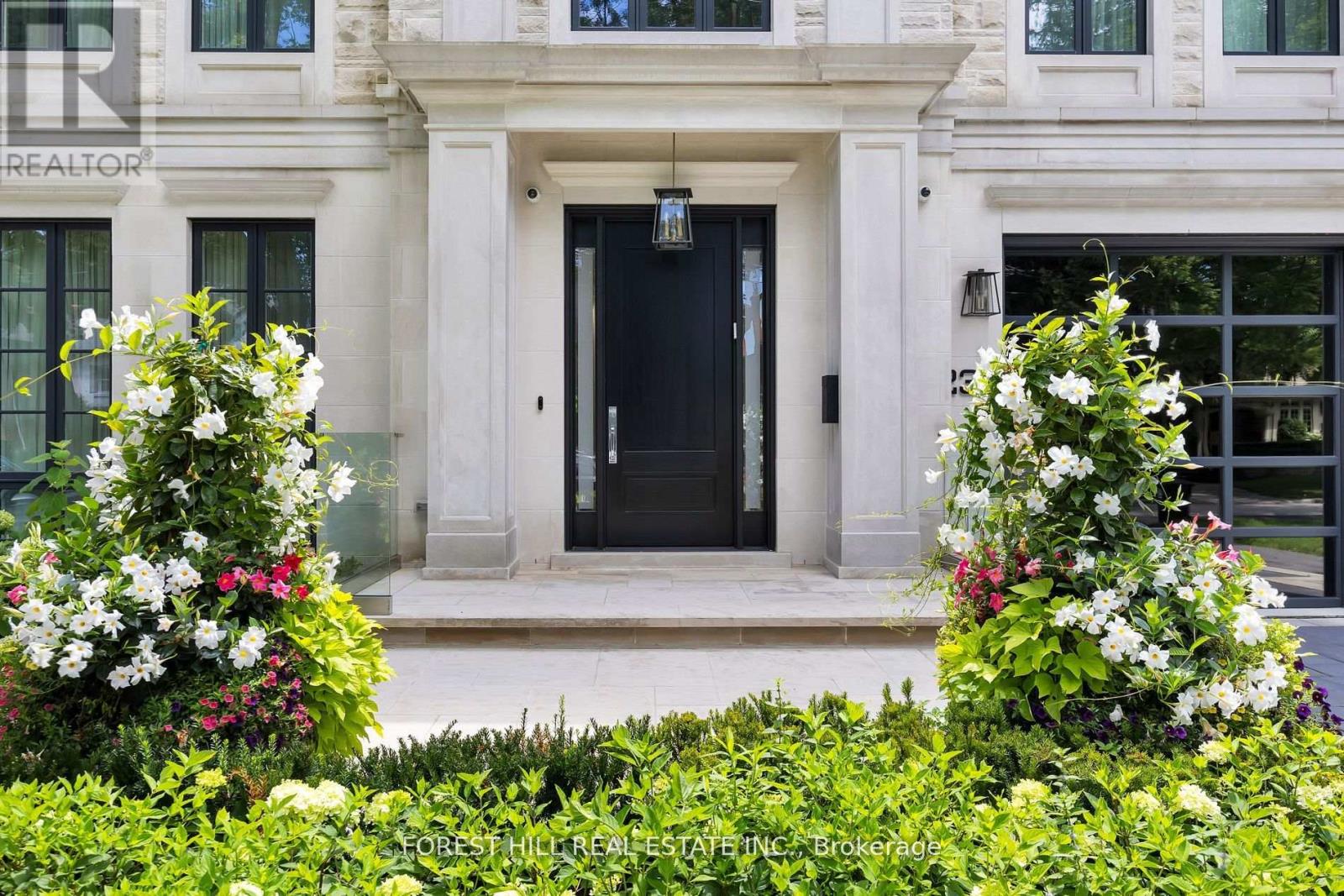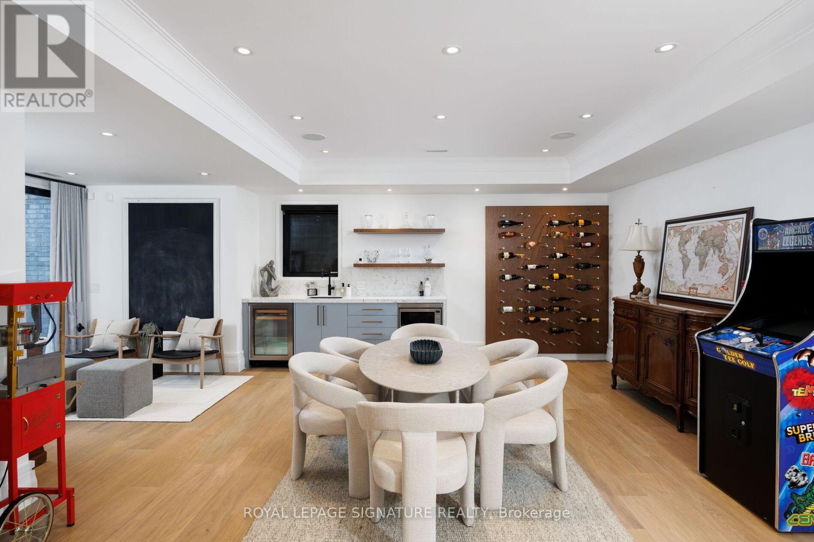 Nestled on a quiet, tree-lined street in Lytton Park, 207 Strathallan Blvd is a bespoke 5+ bedroom residence offering over 6,500 sq.ft. of elegantly crafted total living space. Built in 2019 by Teddington Homes & realized with uncompromising craftsmanship & a refined palette of luxury materials, the home was conceived under the architectural direction of Limor Benmor-Mizrahi (formerly of Peter Higgins Architect) & finished with interiors by Debra Salmoni, embodying a balance of modern sophistication & enduring comfort. A monumental front door opens into a refined foyer with a custom marble-inlay floor. A powder room is conveniently located off the foyer, across from the executive office. White oak & heated stone flooring, soaring ceilings & abundant natural light create an atmosphere of calm refinement. At the front, the executive office is anchored by a sleek see-through gas fireplace that also serves the open-concept formal living & dining areas, where French doors walk out to a flagstone terrace. The centre hall leads into the sun-filled family room with floor-to-ceiling windows & oversized sliders extending the space to the backyard. The south-facing breakfast area enjoys another walk-out. The kitchen, both a design statement & a culinary workspace, features integrated pro-grade appliances, custom Bellini cabinetry, marble countertops & backsplash, an oversized limestone island with seating, extended-height cabinetry & a fully outfitted butler's pantry with access to the mudroom & garage. Upstairs, the primary suite is a private retreat with a gas fireplace, balcony, soaring ceiling & spa-inspired 5pc ensuite. Three additional bedrooms each offer a private ensuite & custom walk-in closet. The 3rd level provides a flexible 5th bedroom suite with a 3pc ensuite & balcony. The lower level features a large entertainment room with kitchenette & walkup, a glass-enclosed fitness studio, a 6th bedroom with 3pc ensuite, the main laundry room, a 2pc bath & a cold room. (id:64974)