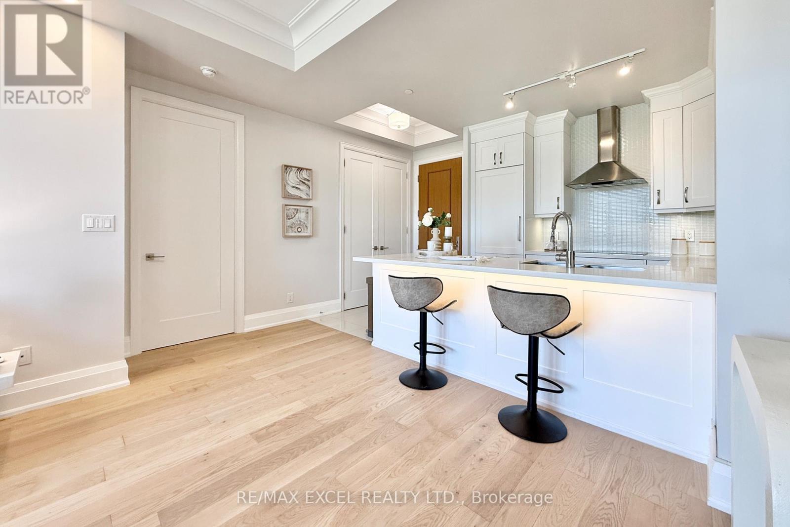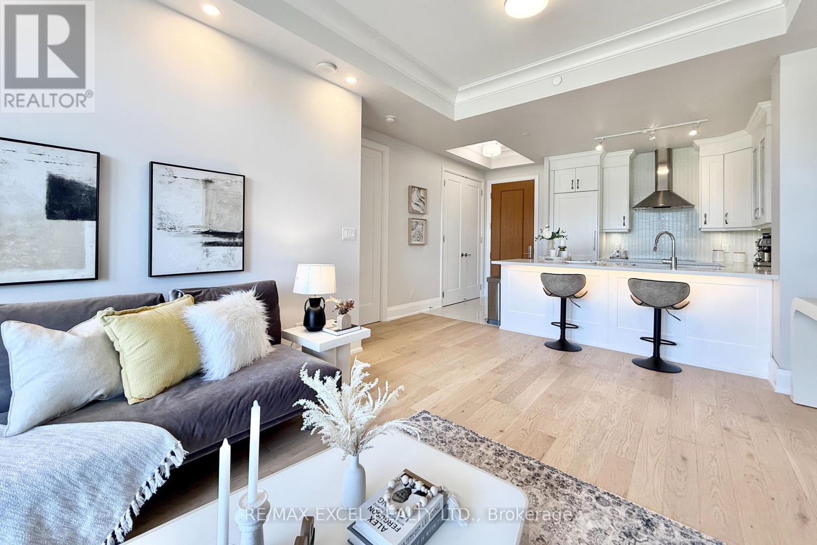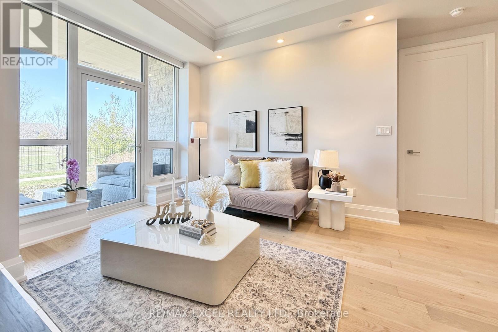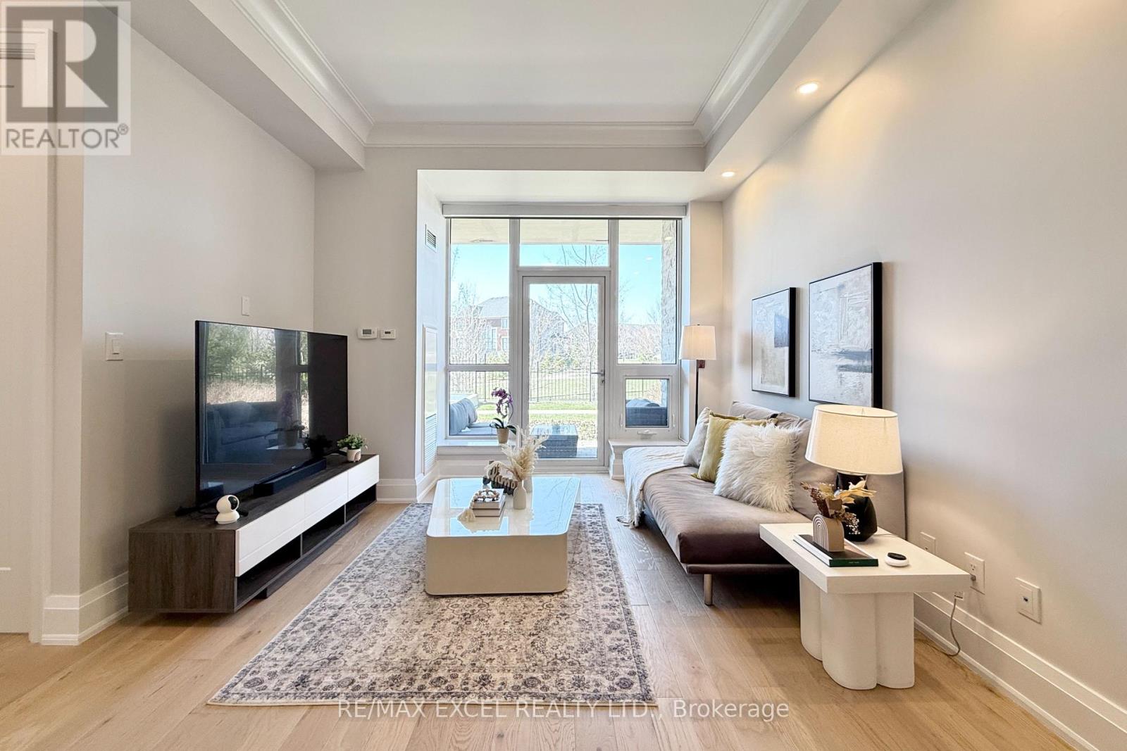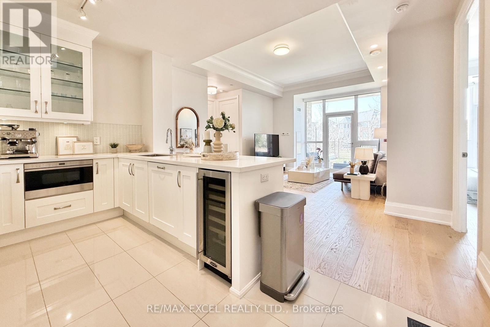 This stunning ground-floor suite offers the rare convenience of bungalow-style living, complete with a walkout to a large, private, tree-lined patio with paved stone. Immaculately maintained and entirely carpet-free, the home showcases extensive modern upgrades and high-end finishes throughout, including soaring 10-foot ceilings, elegant cornice moulding, upgraded 8-foot doors, and 7 1/4-inch baseboards. Rich, engineered hardwood flooring flows seamlessly through the open-concept layout, leading into a beautifully upgraded kitchen with custom extended cabinetry, quartz countertops, a glass backsplash, and premium Sub-Zero and Wolf built-in appliances, including a wine cooler. The suite also features in-suite security and includes one EV parking space and a locker. Residents enjoy access to exceptional building amenities, such as 24/7 concierge service, a two-level lounge with a cozy fireplace and walkout to a large terrace, and five-star resort-style offerings including meticulously maintained grounds, an outdoor infinity pool, and a patio with BBQ area. Additional amenities include a spacious party lounge with bar, kitchen, and dining area, a games room, a fully equipped fitness centre with yoga room, whirlpool and sauna, a guest suite, and both above-ground and underground visitor parking. Conveniently located just minutes from Highway 404 and within the top-ranking Pierre Elliott Trudeau High School district. (id:64974)