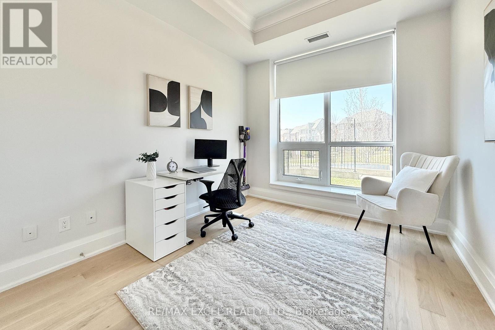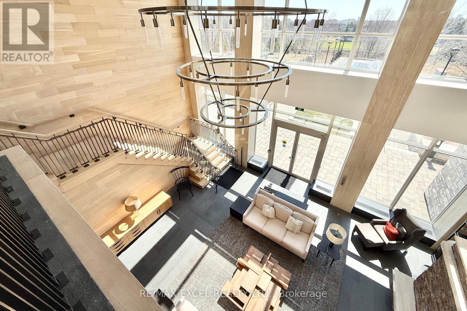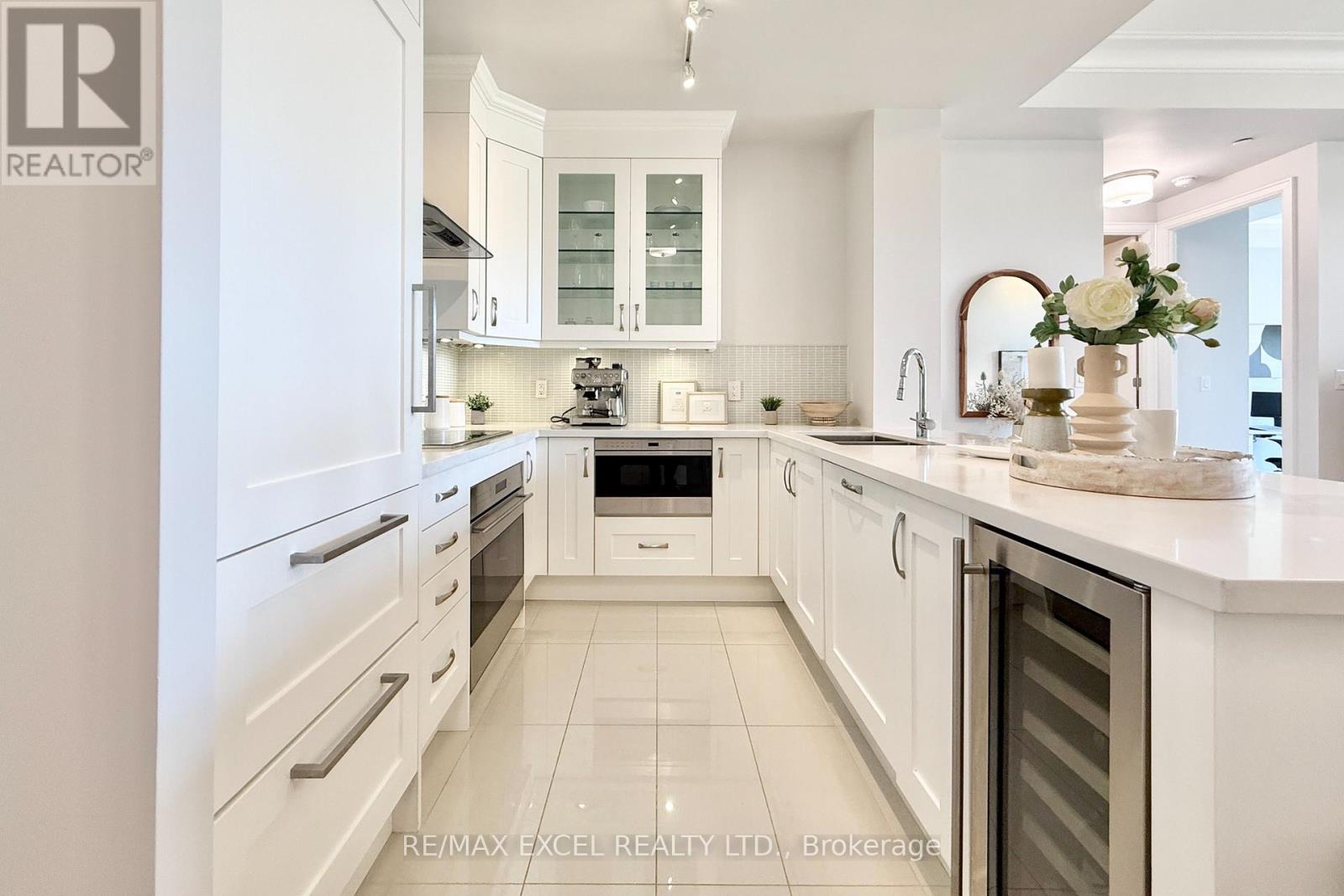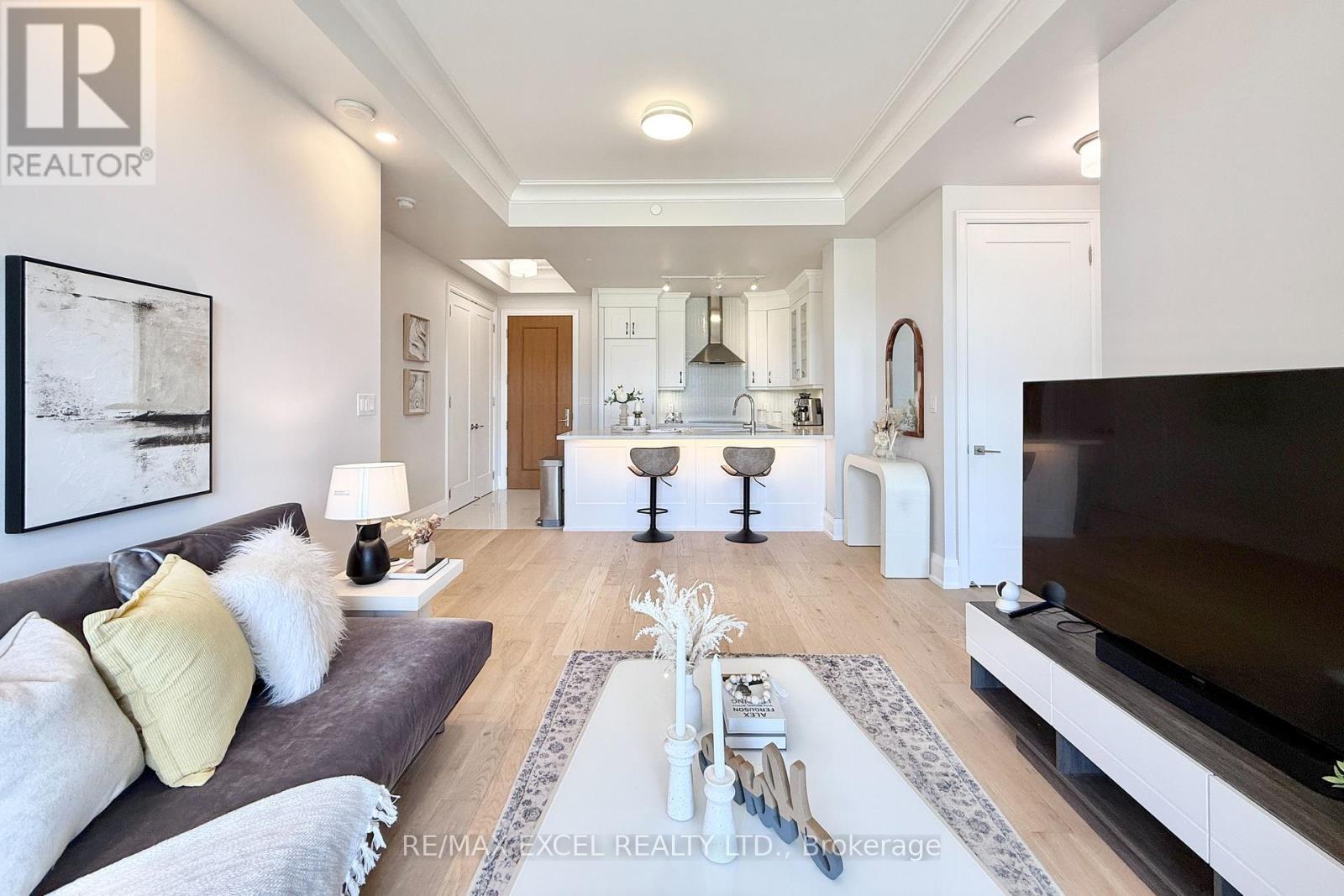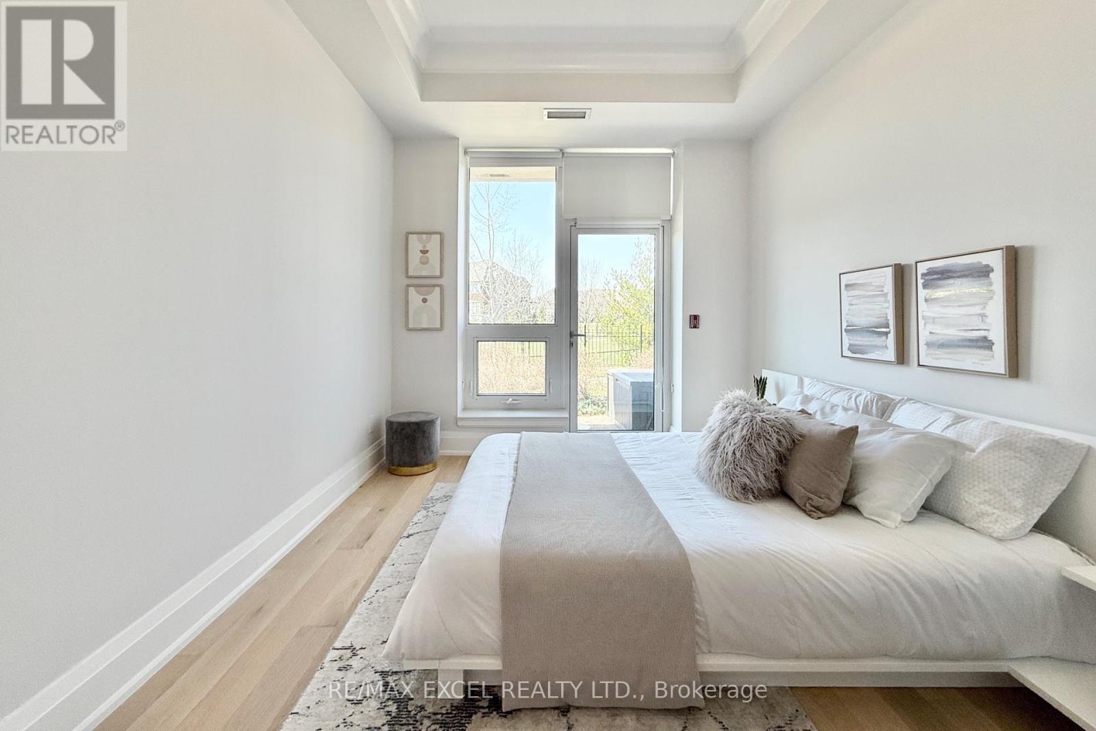 This stunning ground-floor suite offers the rare convenience of bungalow-style living, complete with a walkout to a large, private, tree-lined patio with paved stone. Immaculately maintained and entirely carpet-free, the home showcases extensive modern upgrades and high-end finishes throughout, including soaring 10-foot ceilings, elegant cornice moulding, upgraded 8-foot doors, and 7 1/4-inch baseboards. Rich, engineered hardwood flooring flows seamlessly through the open-concept layout, leading into a beautifully upgraded kitchen with custom extended cabinetry, quartz countertops, a glass backsplash, and premium Sub-Zero and Wolf built-in appliances, including a wine cooler. The suite also features in-suite security and includes one EV parking space and a locker. Residents enjoy access to exceptional building amenities, such as 24/7 concierge service, a two-level lounge with a cozy fireplace and walkout to a large terrace, and five-star resort-style offerings including meticulously maintained grounds, an outdoor infinity pool, and a patio with BBQ area. Additional amenities include a spacious party lounge with bar, kitchen, and dining area, a games room, a fully equipped fitness centre with yoga room, whirlpool and sauna, a guest suite, and both above-ground and underground visitor parking. Conveniently located just minutes from Highway 404 and within the top-ranking Pierre Elliott Trudeau High School district. (id:64974)