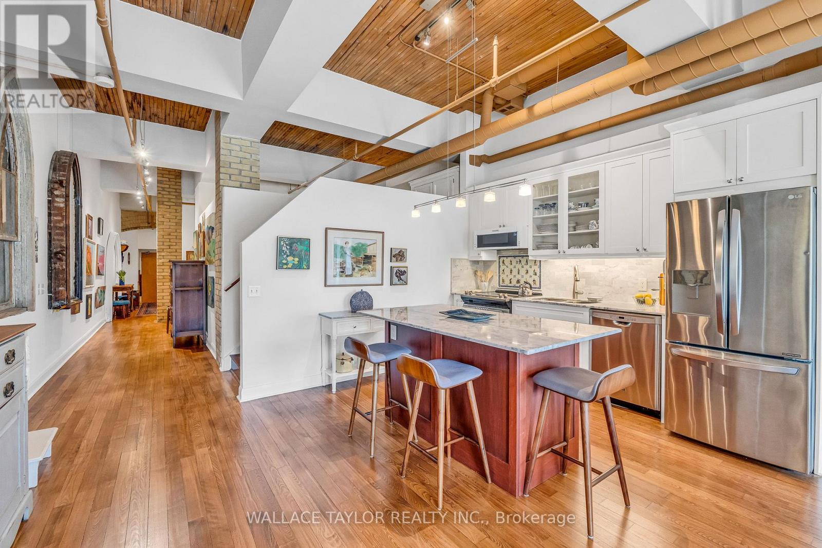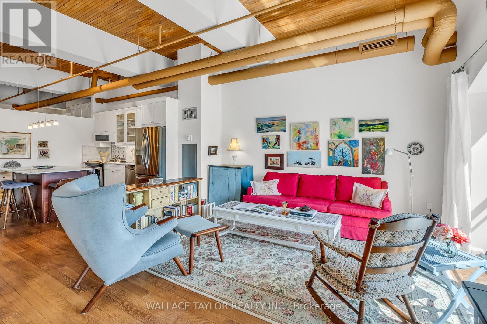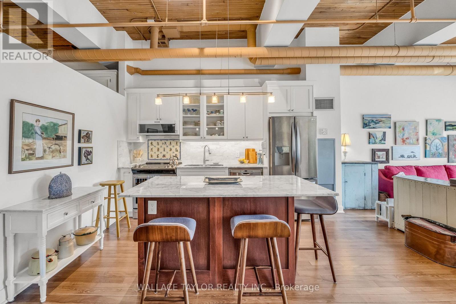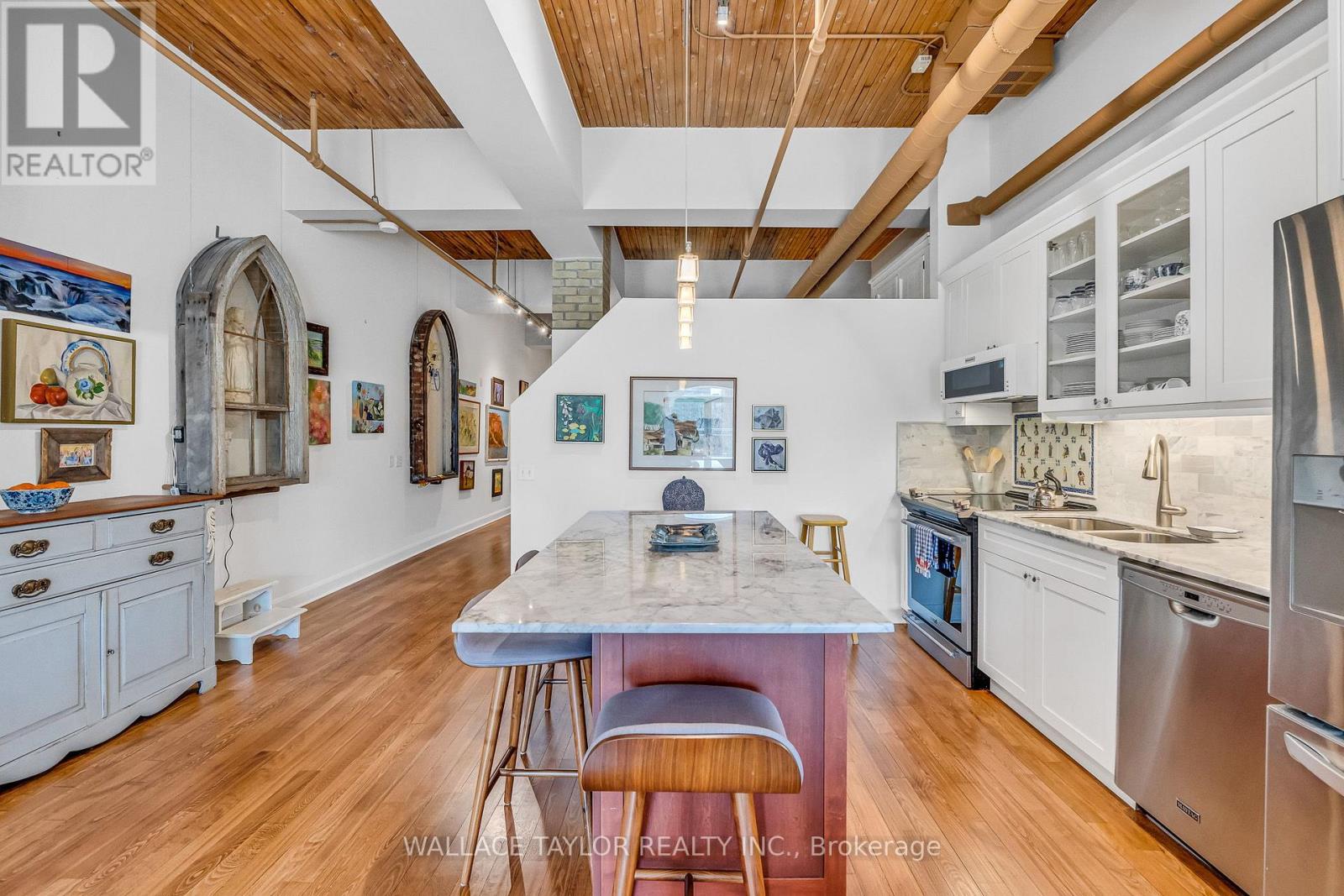 Parks, patios, and pure Queen West energy await. This building is the nucleus of the best Toronto has to offer. Hurry before it sells... as this one has parking! This Candy Factory hard loft on Queen West has a bright 1-bed, 1-bath that combines soaring ceilings with warm timber, exposed brick, ductwork, and expansive factory windows with a Juliet-style walkout framing city views. An elegant kitchen with marble counters, custom cabinetry, and a statement tile backsplash anchors the open living/dining area-perfect for entertaining or studio work. The serene bedroom comfortably fits a king, and the crisp 4-piece bath completes the space, with clever storage throughout. Steps to Trinity Bellwoods Park, cafes, galleries, boutiques, and the 501 streetcar, the suite includes coveted underground parking-authentic hard loft character in Toronto's most coveted creative corridor with a guest suite on the penthouse level! (id:64974)