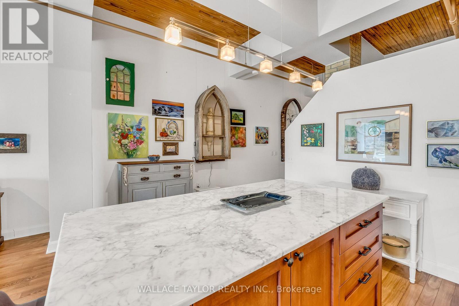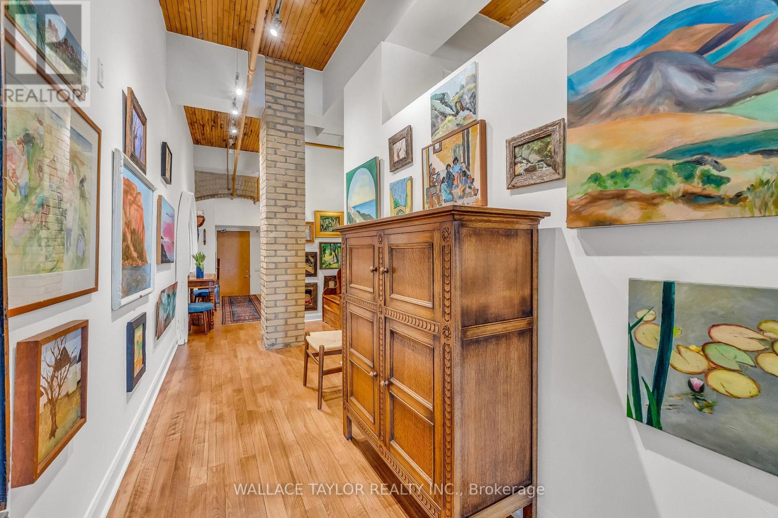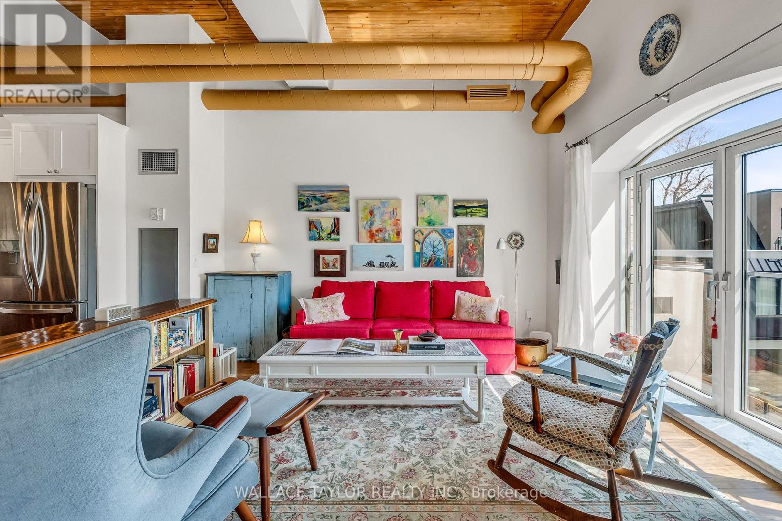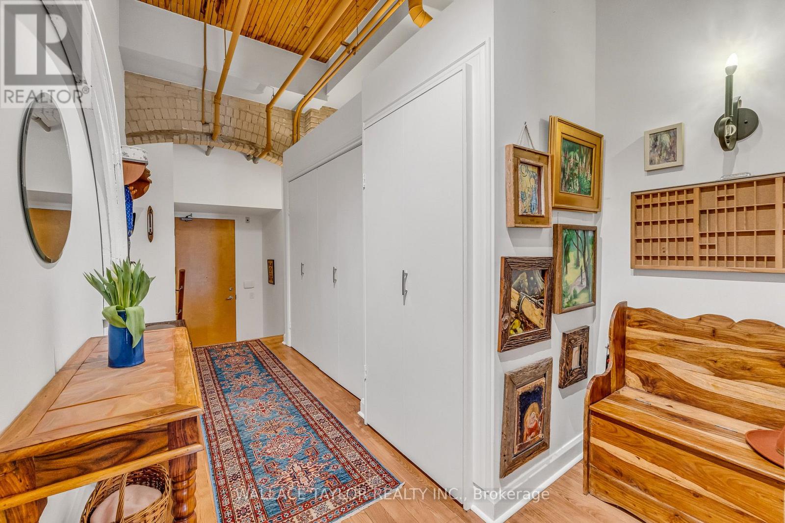 Parks, patios, and pure Queen West energy await. This building is the nucleus of the best Toronto has to offer. Hurry before it sells... as this one has parking! This Candy Factory hard loft on Queen West has a bright 1-bed, 1-bath that combines soaring ceilings with warm timber, exposed brick, ductwork, and expansive factory windows with a Juliet-style walkout framing city views. An elegant kitchen with marble counters, custom cabinetry, and a statement tile backsplash anchors the open living/dining area-perfect for entertaining or studio work. The serene bedroom comfortably fits a king, and the crisp 4-piece bath completes the space, with clever storage throughout. Steps to Trinity Bellwoods Park, cafes, galleries, boutiques, and the 501 streetcar, the suite includes coveted underground parking-authentic hard loft character in Toronto's most coveted creative corridor with a guest suite on the penthouse level! (id:64974)