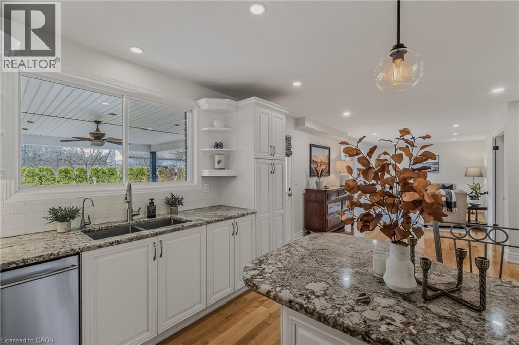 Gorgeous and spacious 2-storey home set on a large, beautifully treed raised private lot, offering 5 bedrooms, 5 bathrooms, and an impressive layout ideal for families or multi-generational living. The main floor features a stunning kitchen with granite countertops, high-end Viking gas stove, stylish backsplash, large island, and plenty of cupboard and prep space, along with a bright dining area perfect for entertaining. Walk out to the 18' x 23' covered patio complete with an outdoor kitchen and gas line for the BBQ, perfect for hosting and outdoor living. The inviting living area flows into a sunroom with a cozy gas fireplace overlooking the private backyard. The second floor offers generous bedrooms, including a spacious primary bedroom with a walk-in closet and private ensuite, plus a potential in-law setup with 1 bedroom, bathroom, laundry room, and kitchenette. The basement adds additional living space with a 2-piece bath, rec room/exercise room, theatre room, and walk-up access to the garage. Enjoy the private backyard oasis with hot tub, landscaping, mature trees, and a front and back yard irrigation sprinkler system. Recent updates include new CertainTeed Landmark Pro lifetime fibreglass shingles (2019), blown-in attic insulation (2020), electrical updates throughout, new triple and double-pane windows to 3 dormers (2024), new siding and soffits to dormers (2024), and driveway sealant (2025). Complete with a 2-car attached garage with multiple entries into the home, located close to schools, churches, shopping, amenities, breweries, vineyards, and just a short drive to Port Dover Beach. (id:64974)