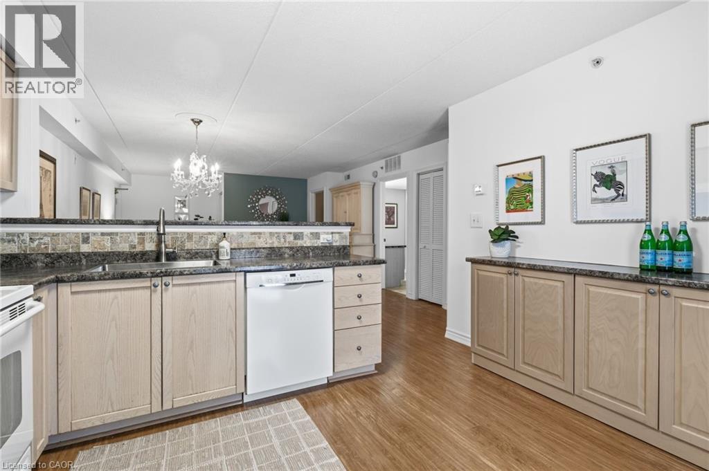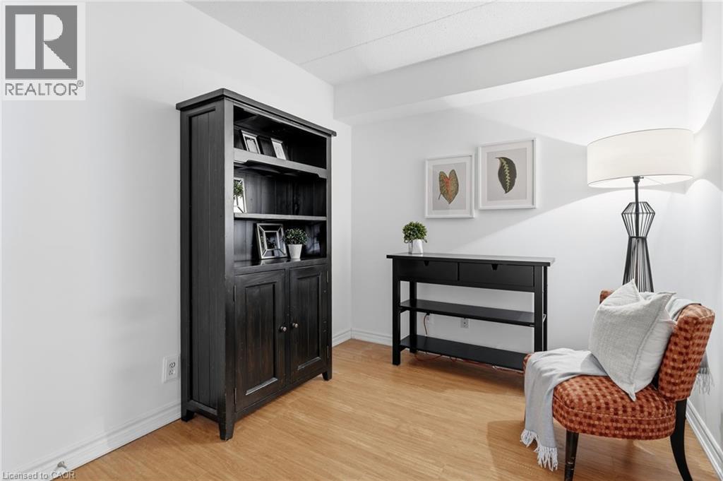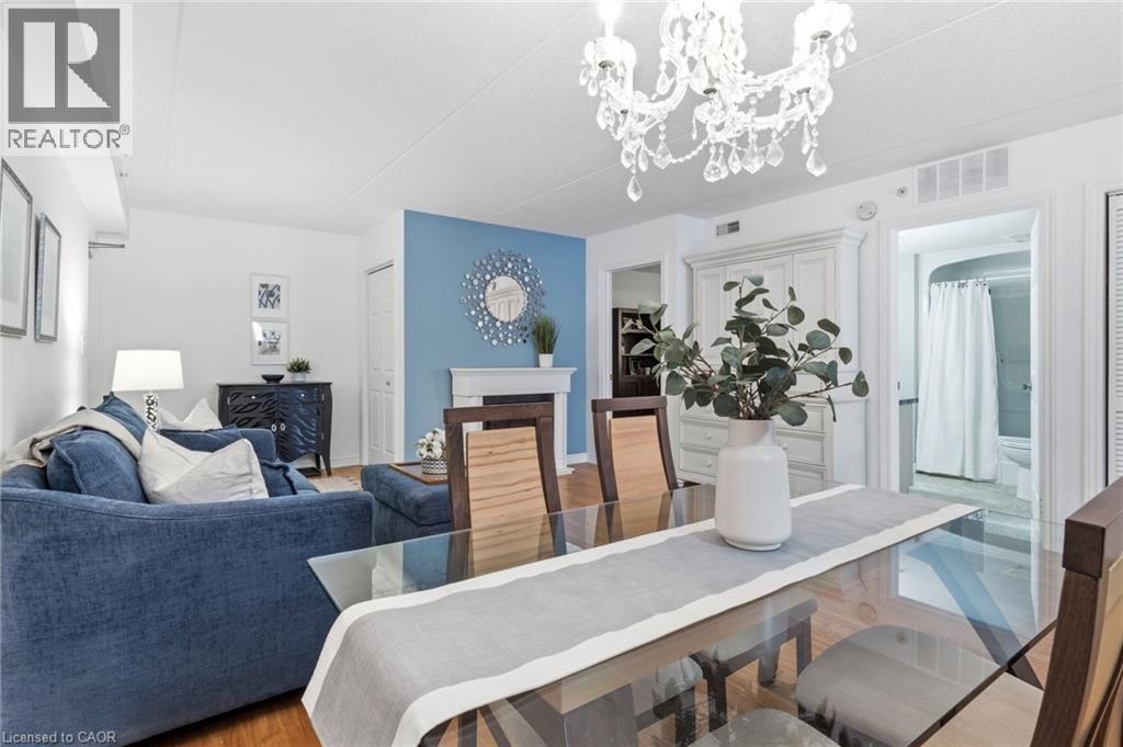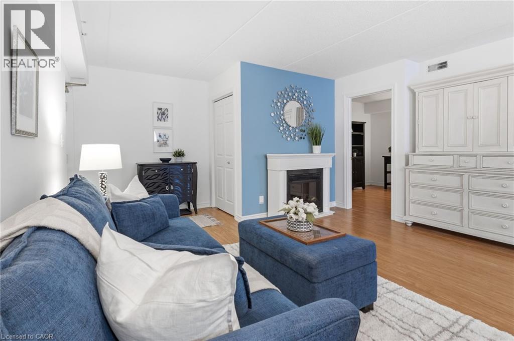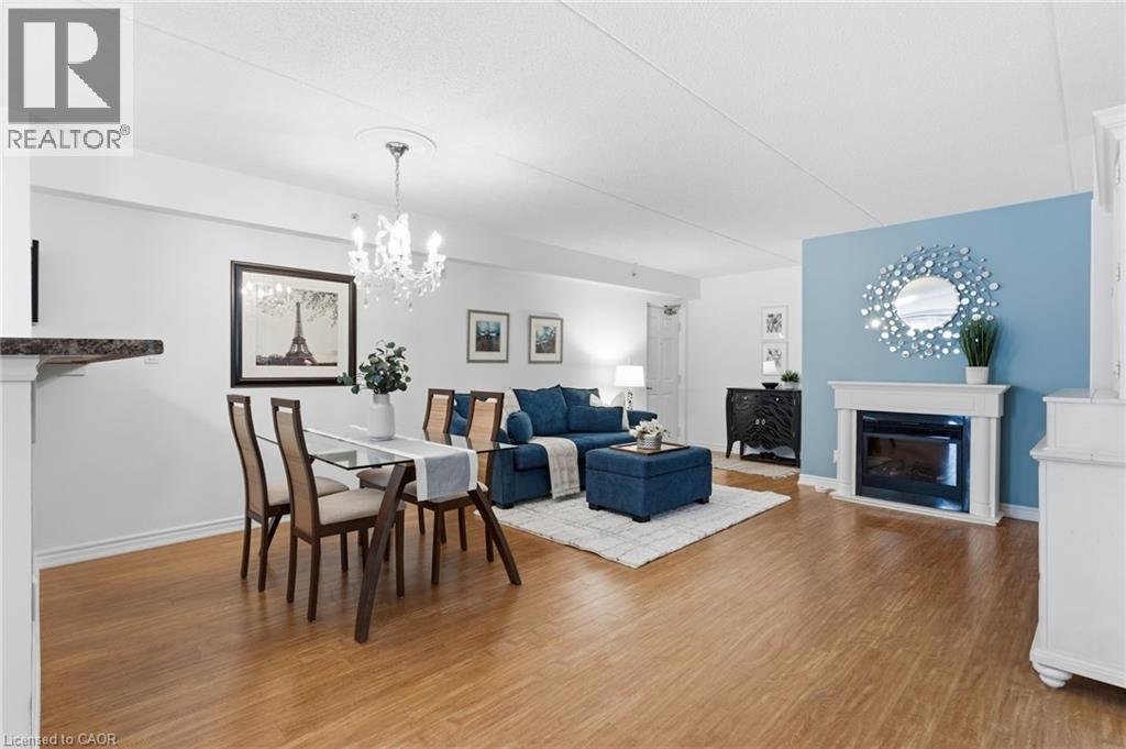 Spacious one-bedroom plus den, Hampton Model, in the highly desirable Uptown Orchard Condominium, offering over 800 sq. ft. of thoughtfully designed living space. This ground-floor suite features a walkout to a private patio backing onto a protected, treed ravine, the perfect setting for peaceful morning coffee or evening relaxation. Open-concept living and dining area, is complete with an electric fireplace, and flows seamlessly into the bright eat-in kitchen featuring ample cabinetry and generous counter space. The primary bedroom includes a double closet and a charming alcove ideal for enjoying the ravine views. The versatile den, complete with a walk-in closet, is ideal for a home office or guest bedroom. A four-piece bathroom conveniently incorporates an in-suite laundry. This suite includes one underground parking space and a storage locker. The clubhouse, just steps from your door, offers exceptional amenities including a gym, sauna, and party room with kitchen. Ample visitor parking is also available. Ideally located within walking distance to grocery stores, shops, restaurants, daycare, fitness centres, and public transit. Situated in North Burlington’s Orchard community, with easy access to the GO Station, QEW, 407, and Bronte Park. Urban convenience meets tranquil ravine living. (id:64974)