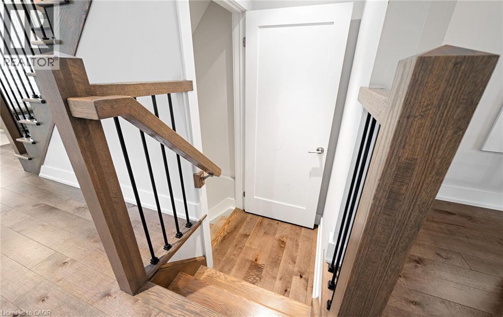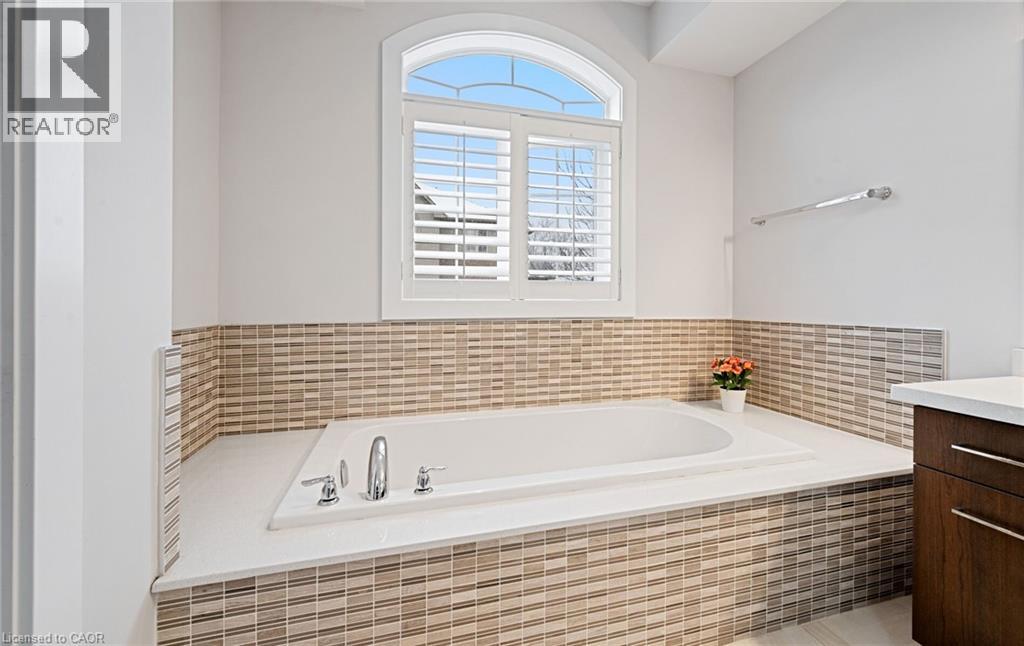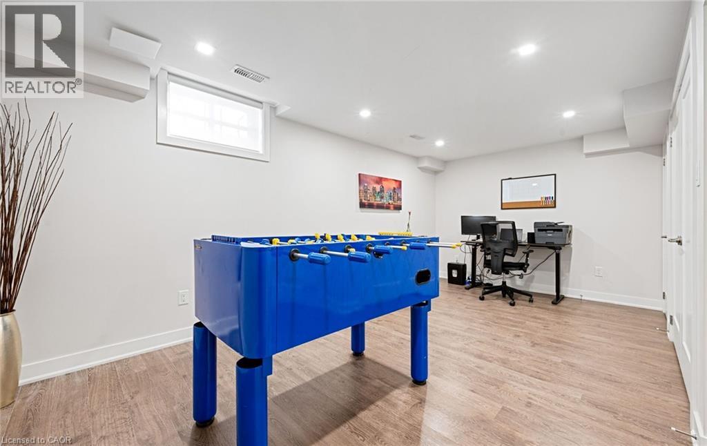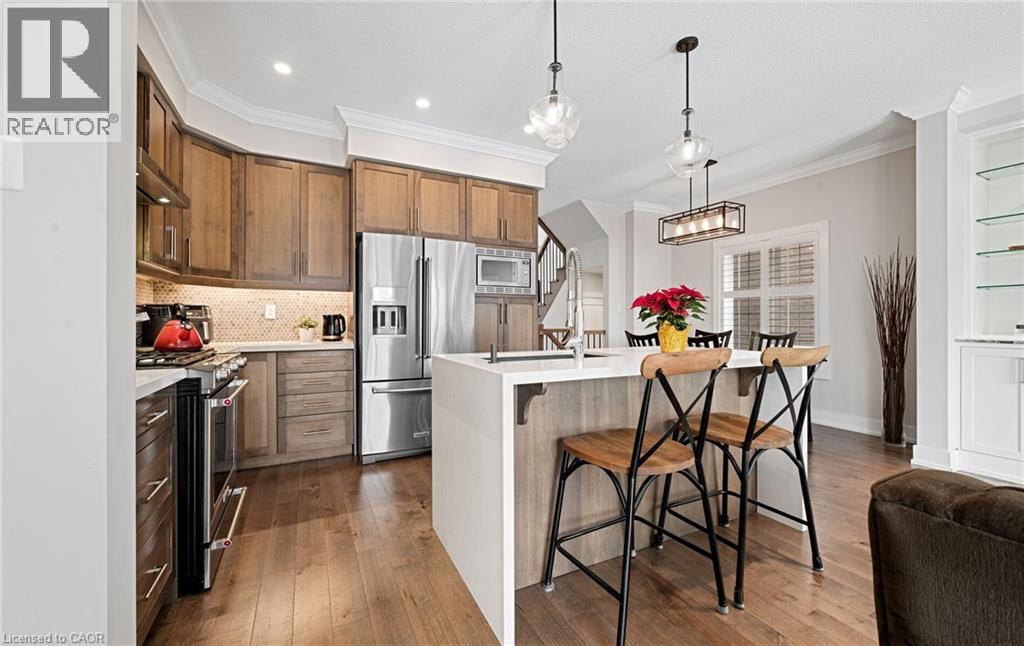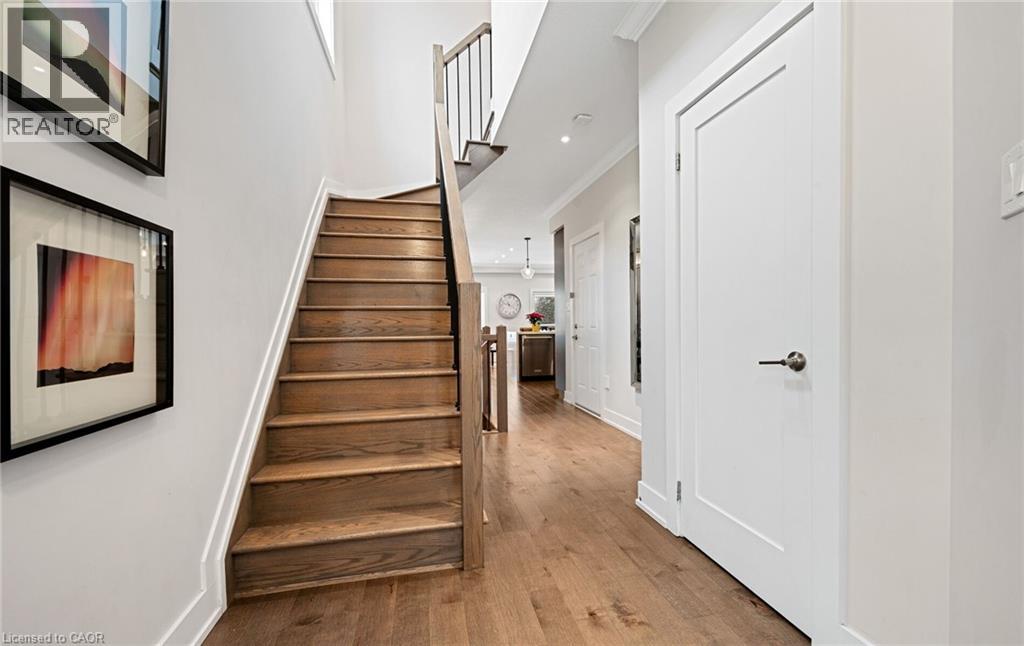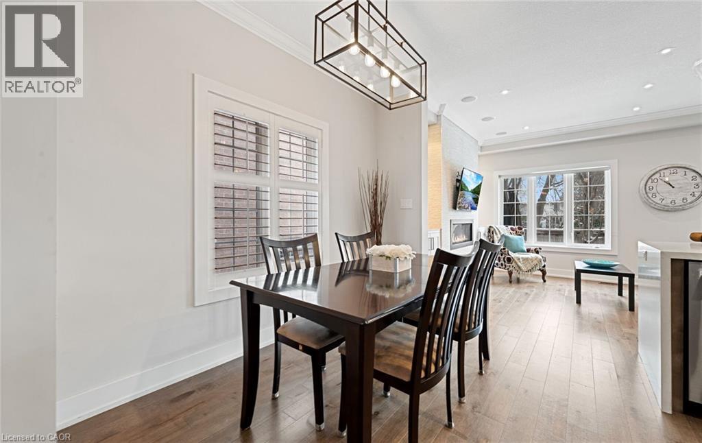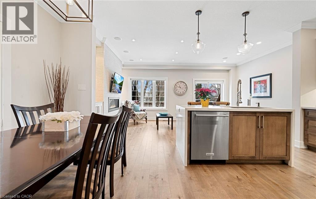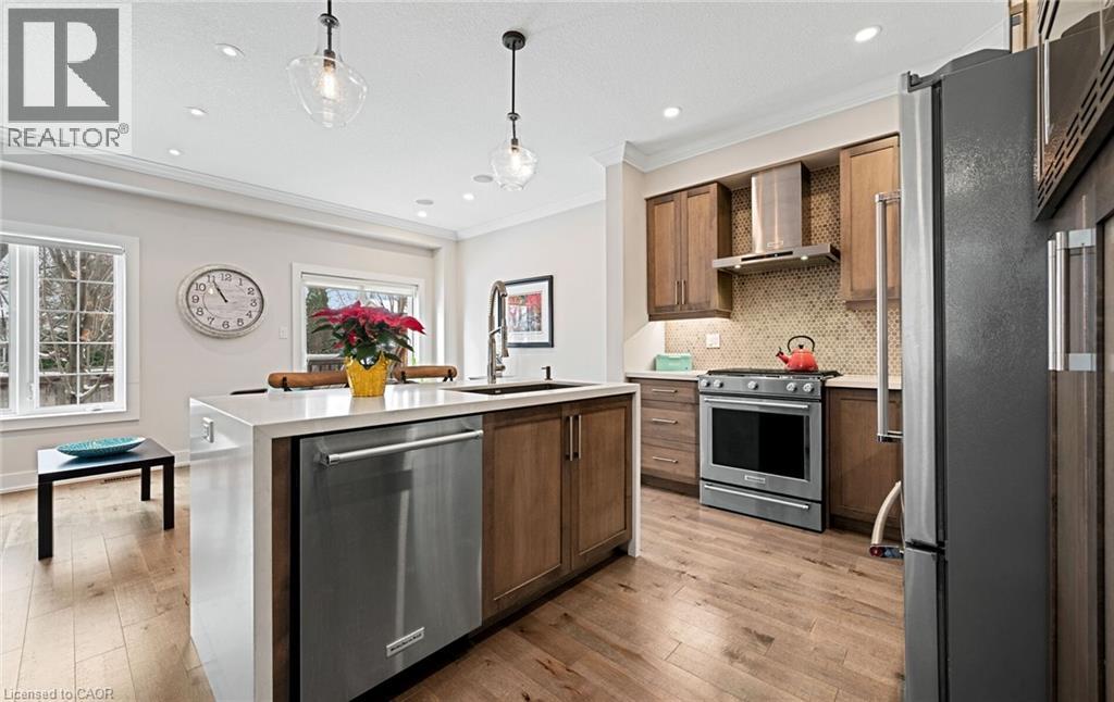 Welcome to refined executive living just moments from Downtown Burlington and the vibrant Brant Street corridor. This rare end-unit condo townhouse offers approx. 2,000 sq. ft. of beautifully finished space (1,473 sq. ft. above grade + 527 sq. ft. below), blending upscale design with unmatched urban convenience near the lakefront, boutique shops, dining, Spencer Smith Park, GO Transit, and major highways. The bright, open-concept main level features 9-ft ceilings, rich flooring, designer lighting, and expansive windows that maximize natural light—an advantage of the premium end-unit location. The chef-inspired KitchenAid kitchen impresses with custom cabinetry, a waterfall quartz island, and a 5-burner gas range, all flowing into the elegant dining and living areas. A striking stone gas fireplace with custom built-ins, a convenient 2-piece powder room, and whole-home audio with integrated home theatre elevate the space for everyday comfort and high-end entertaining. Upstairs, three generous bedrooms include a serene primary retreat with walk-in closet and spa-like ensuite. A stylish 4-piece main bath and second-floor laundry add to the thoughtful executive design. The fully finished lower level extends the lifestyle with a refined recreation room featuring wood-look flooring, LED pot lights, frosted glass doors, and a spa-inspired 3-piece bath with heated floors—ideal for a media room, office, gym, or guest suite. Smart home upgrades include Lutron lighting and Google Nest controls, providing modern comfort and efficiency. Set within a top-rated school district and close to parks, trails, and Burlington’s signature waterfront, this home delivers the perfect blend of luxury, location, and lifestyle—ideal for professionals, downsizers, and families seeking executive living near Burlington’s most coveted amenities. (id:64974)