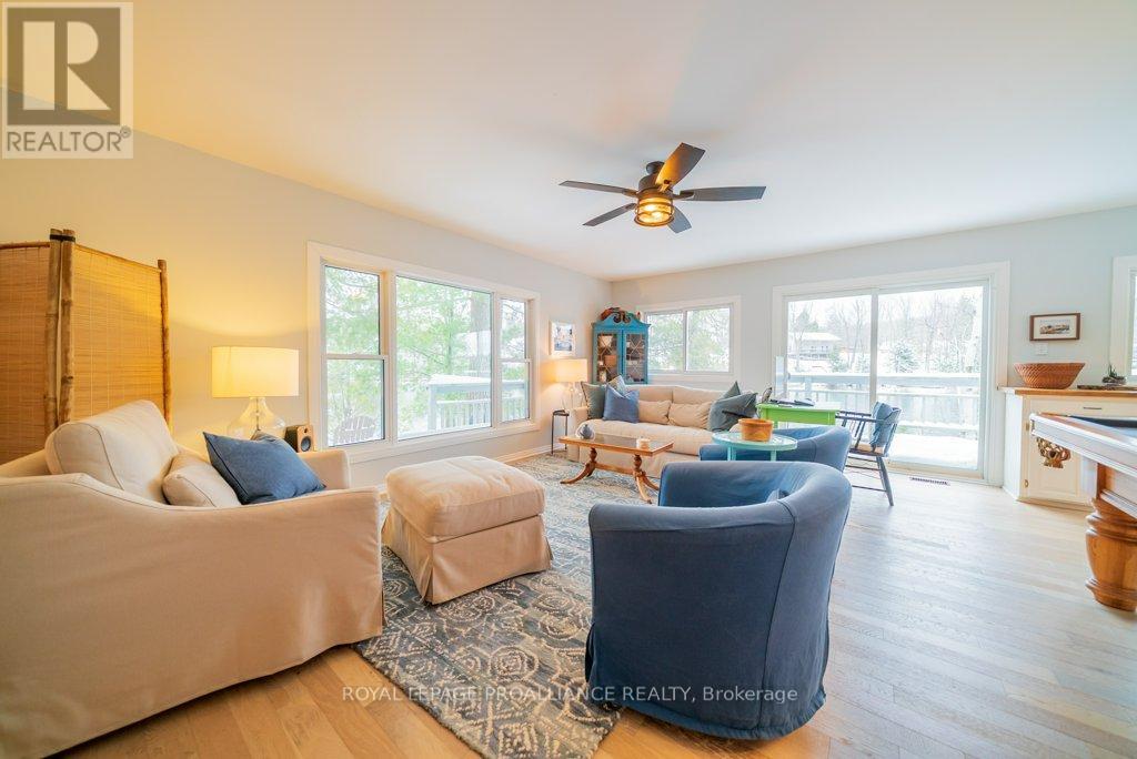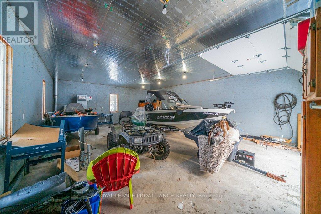 Embrace the beauty of every season at this exceptional four-season recreational retreat on Grindstone Lake. Set on a private 1.2-acre lot with an impressive 245 feet of pristine shoreline, this turnkey waterfront residence offers the perfect balance of comfort, nature, and effortless enjoyment.The beautifully renovated and fully furnished 1,700 sq. ft. open-concept home is designed for connection and relaxation. A spacious wrap-around deck captures sweeping lake views-ideal for morning coffee, sunset dinners, and memorable gatherings with family and friends. Inside, warm hardwood floors flow throughout, complemented by an inviting kitchen, dining area, cozy lakeside nooks, and a dedicated games space that make the home feel both functional and welcoming.The layout features two generous bedrooms, including a primary suite with a private en-suite, + 2nd stylish guest bathroom. Extensive upgrades completed in 2020 include updated kitchen and bathrooms, new windows and sliding doors, a propane furnace, and spray-foam insulation throughout the 1,500 sq. ft. crawlspace/utility room-ensuring year-round comfort and efficiency. The roof was replaced in 2016, and the fully insulated, heated detached garage with loft adds valuable storage and flexible space.Step outside to enjoy excellent swimming along a sandy-bottom shoreline, your own private boat launch, and endless recreational trails access. Whether you dream of casting a line for bass or trout, exploring crystal-clear waters by boat, or simply savoring peaceful days in the heart of cottage country, this turnkey sanctuary is ready for your next chapter-no renovations required. With year-round road access and thoughtful updates throughout, every detail has been designed to ensure effortless enjoyment and lasting memories. A serene retreat surrounded by nature's tranquility, this property is your canvas for unforgettable moments all year round. Step into a life where every season inspires!Your lake side adventure awaits. (id:64974)