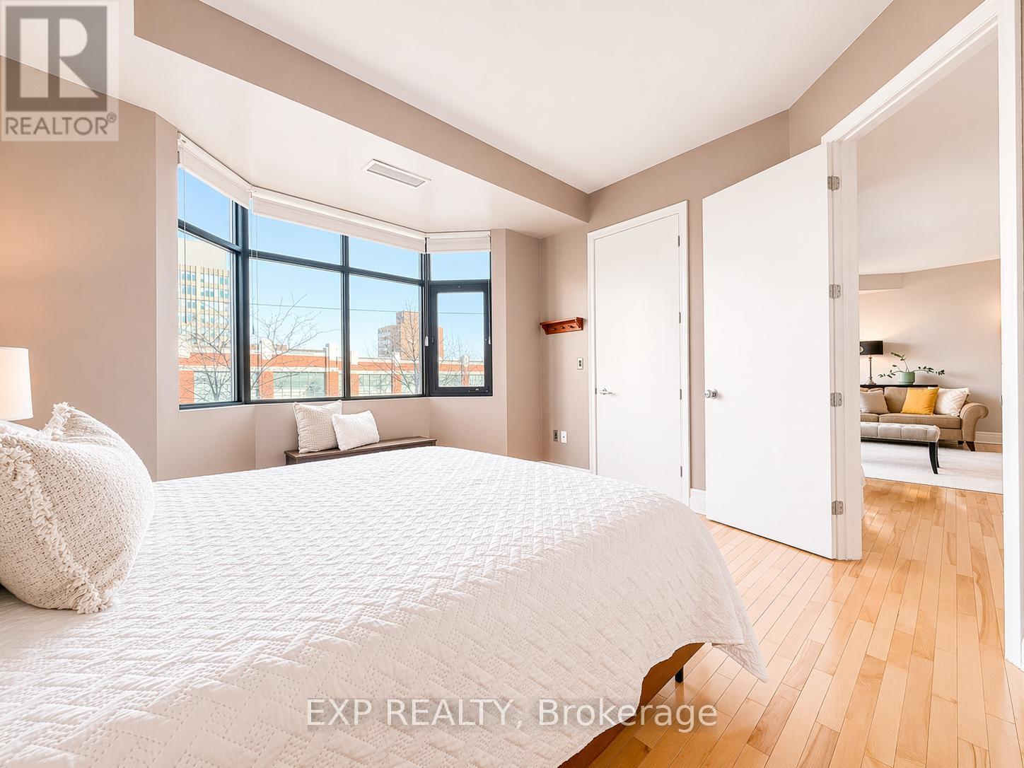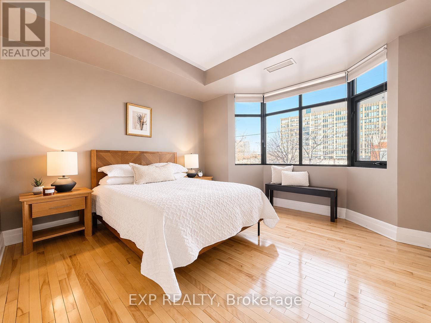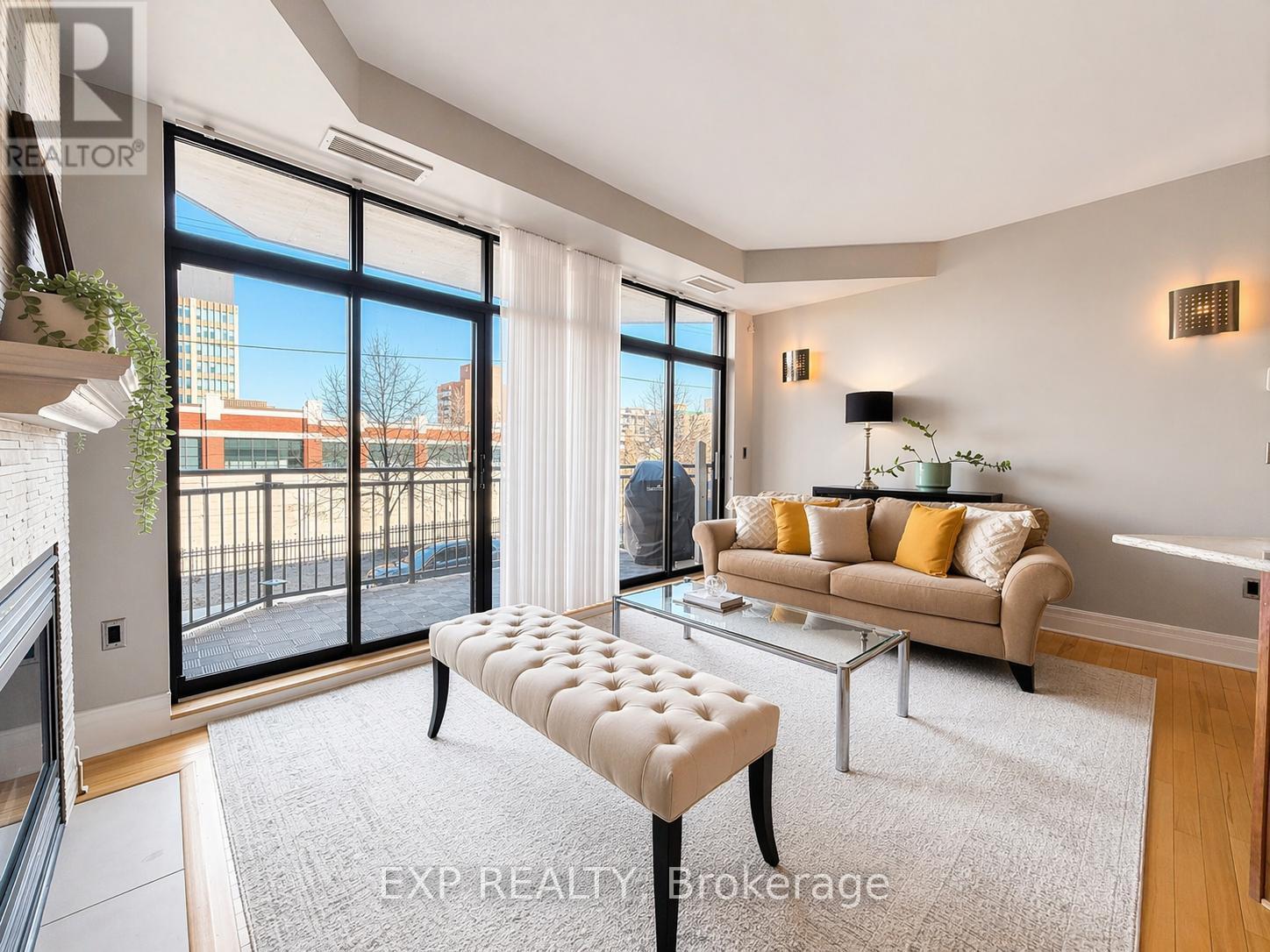 Welcome to The Lanesborough, a refined Domicile-built residence in the heart of Sandy Hill, one of Canada's most desirable and walkable urban communities. This beautifully designed 1,005 sq. ft. open-concept condo offers an exceptional blend of space, comfort, and sophistication. Featuring soaring 10-foot ceilings and expansive windows, the unit is filled with natural light, creating a bright and airy atmosphere throughout. Elegant hardwood and tile flooring, granite countertops, a gas stove, and a cozy gas fireplace add both warmth and timeless appeal. The thoughtfully designed split-bedroom layout ensures maximum privacy and functionality, offering two generously sized bedrooms and two full bathrooms, a rare and highly sought-after configuration. The spacious living and dining areas are ideal for entertaining, complete with a dedicated dining space that is increasingly uncommon in newer condo designs. Step onto the large private balcony and take in the surrounding cityscape, perfect for relaxing, entertaining guests, or enjoying outdoor dining. Surrounded by cafés, restaurants, entertainment, and everyday amenities, this residence delivers an unmatched urban lifestyle. Sandy Hill has recently been recognized as one of Canada's best places to live, placing you exactly where you want to be. (id:64974)
