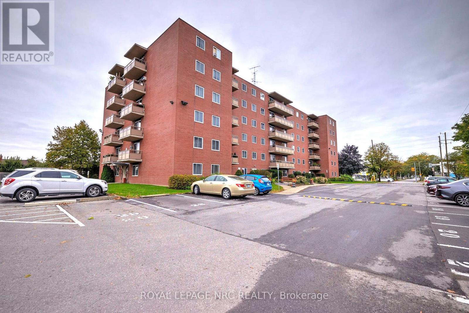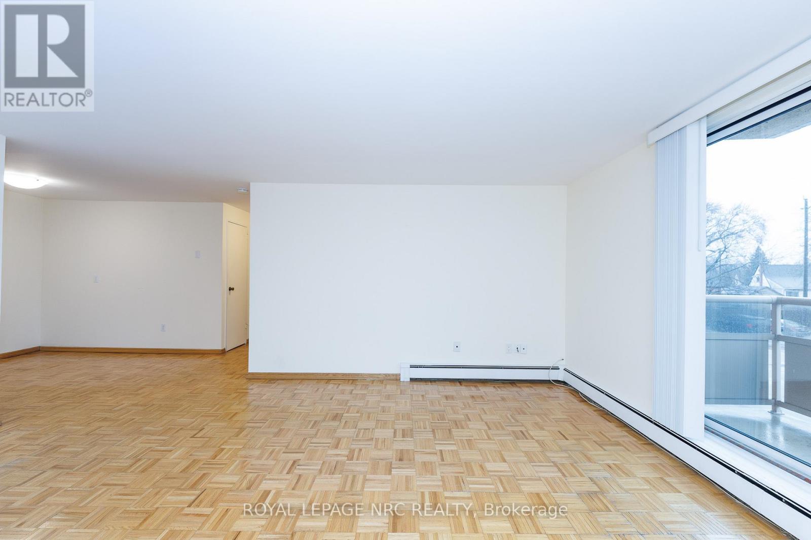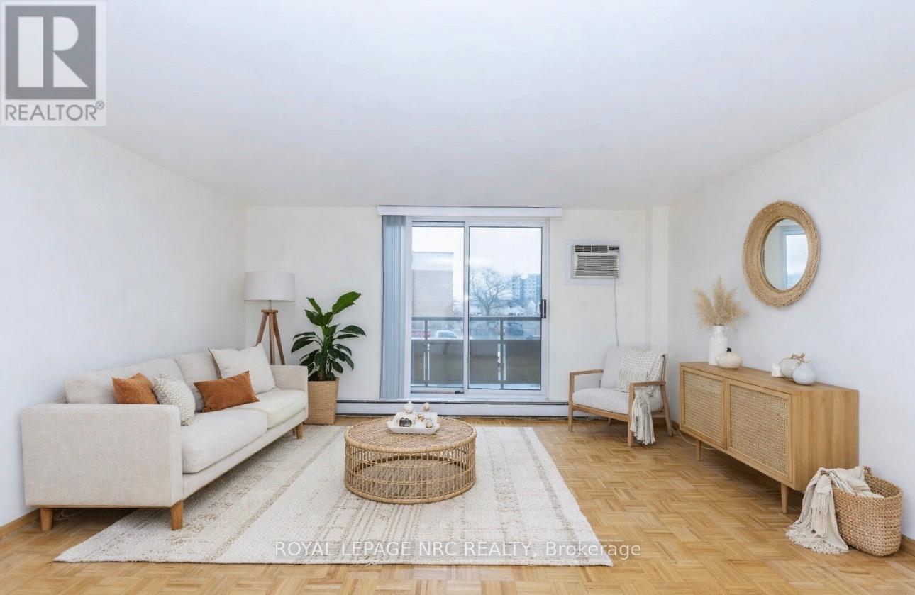 Welcome to Grantham Square! This beautifully maintained second-floor corner unit offers comfortable, low-maintenance living in a clean and well-managed building. Featuring two spacious bedrooms with generous closet space, this bright and inviting condo boasts immaculate parquet flooring throughout, a large living room perfect for relaxing or entertaining, and a separate dining room ideal for hosting family and friends. The kitchen is equipped with warm maple cabinetry and comes complete with included appliances, while air conditioning ensures year-round comfort. Step out onto your private balcony and enjoy the added benefit of a desirable corner unit location, offering extra natural light and privacy. Condo fees of $556/month truly cover it all-heat, hydro, water, building insurance, exterior maintenance, and even one conveniently located assigned parking space (#55) near the side entrance for quick and easy access. This well-cared-for building features two elevators, a main-floor laundry room, and is ideally situated directly on a bus route, with close proximity to shopping, amenities, and quick QEW access. Windows were updated in 2022, adding further value and peace of mind. An excellent opportunity for those seeking a carefree lifestyle in a prime, convenient location! Check out video tour! (id:64974)