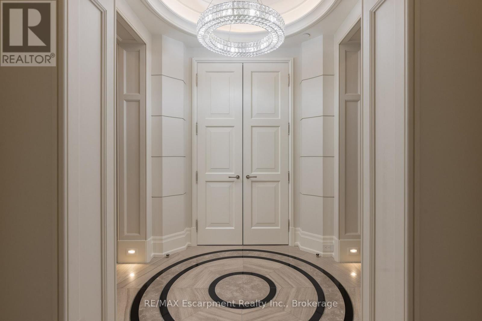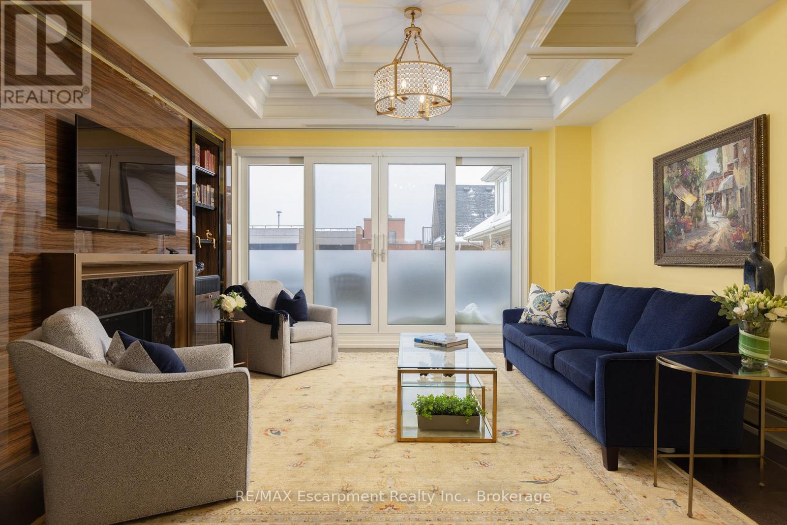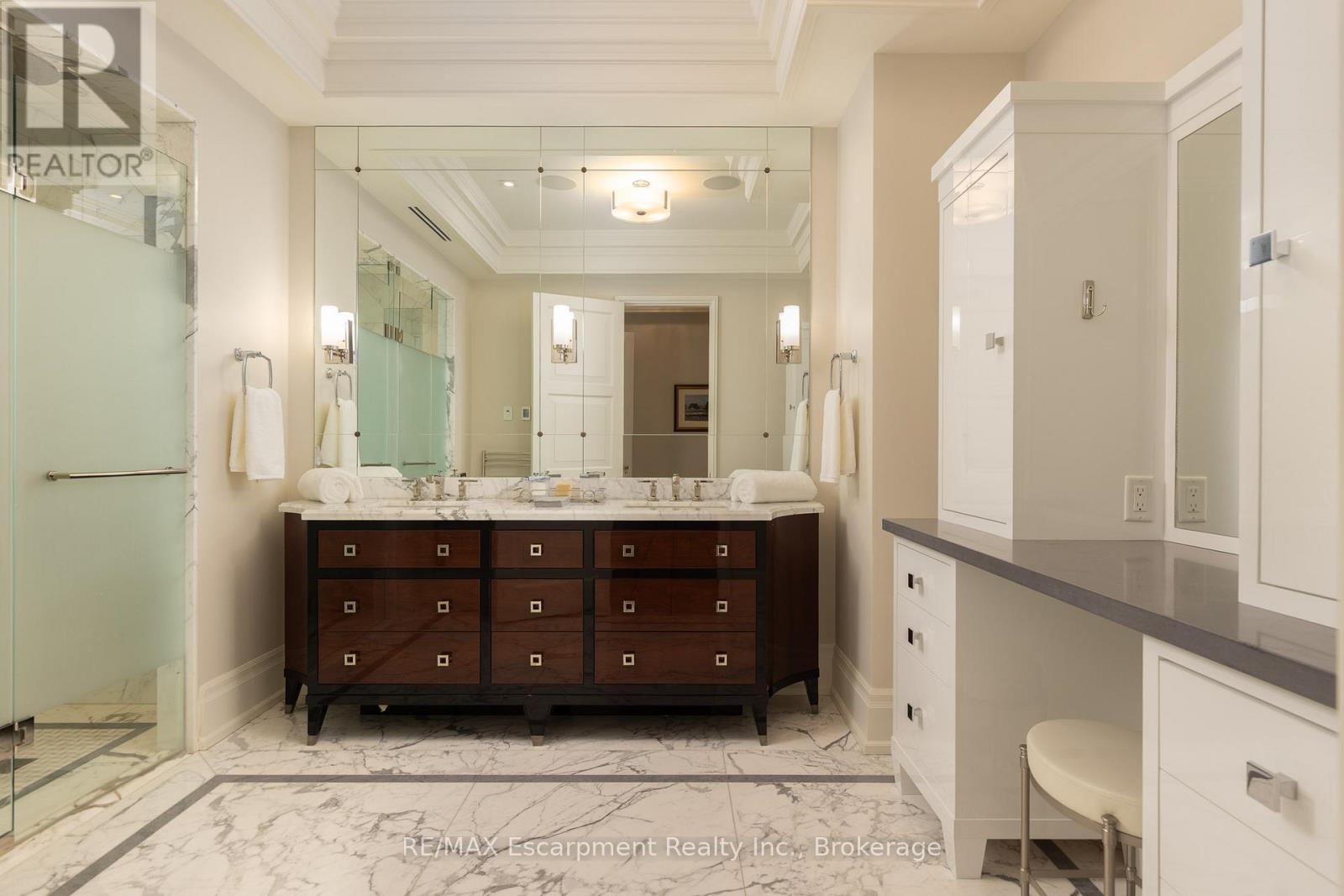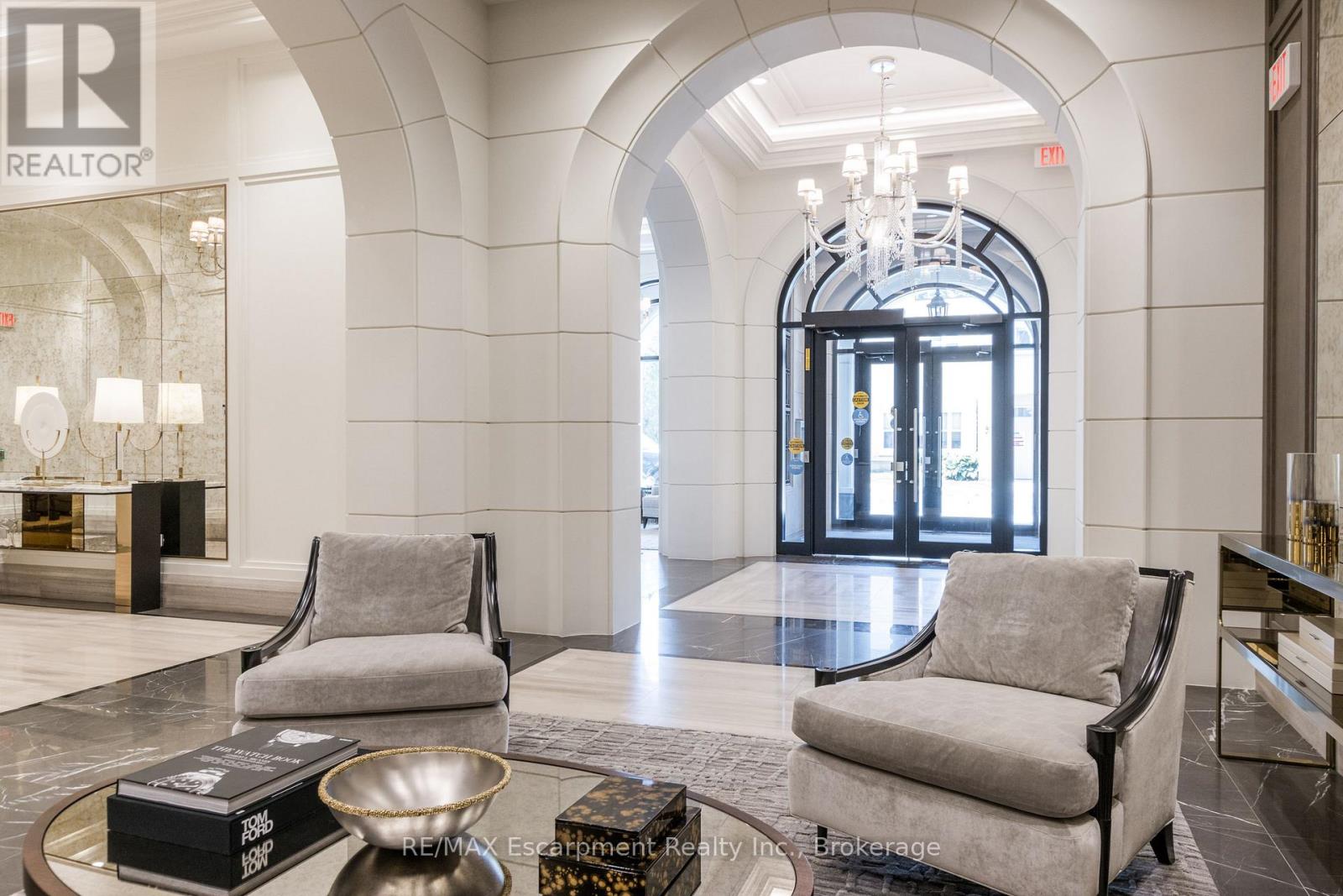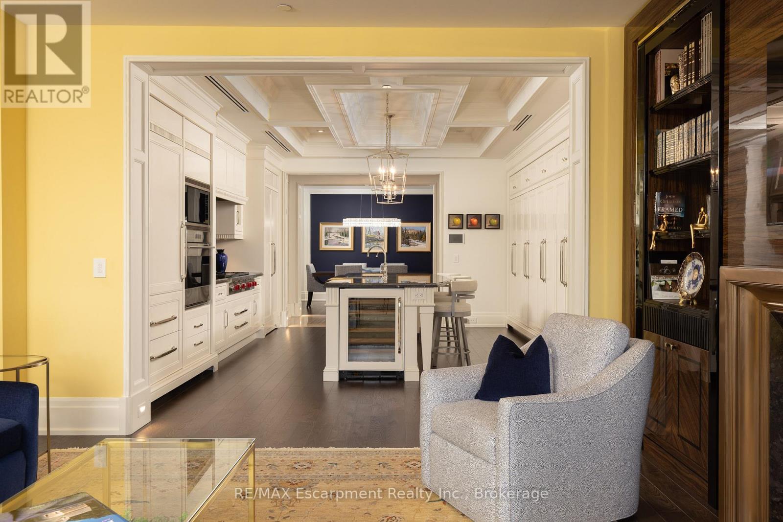 Discover True Luxury Living in This Exceptional Oakville Suite. Welcome to an extraordinary residence that redefines sophisticated condominium living. This stunning two-bedroom suite encompasses an impressive 2,290 square feet of meticulously designed living space, where every detail has been carefully curated to create an atmosphere of refined elegance. Upon entering through the grand rotunda, you are immediately greeted by exquisite slab marble flooring that establishes the tone for the opulence that awaits within. The thoughtful design continues throughout, featuring rich hardwood flooring, intricate millwork, and striking zebra wood accents that speak to the exceptional craftsmanship found in this home. The gourmet kitchen presents a culinary enthusiast's dream, complete with top-of-the-line Wolf,Subzero, and Miele appliances, a generous island for meal preparation and casual gatherings, plus an entire wall of pantry cupboards, and walk-in pantry for additional storage. The Great Room beckons relaxation with built-in cabinetry, and a warm gas fireplace. Step through to the private 335 sq ft terrace for morning coffee or evening contemplation. Entertain graciously in the separate dining room, showcasing zebra wood built-in cabinetry with dedicated wine storage. The primary bedroom suite offers terrace access, a walk-in closet, and a luxurious 4 pc ensuite featuring a vanity area, radiant heated floors and a pampering Kohler toilet ($8500 value). The 2nd bedroom functions beautifully as a home office with custom built-ins and its own three-piece ensuite. Modern convenience abounds with the integrated Crestron system controlling music, lighting, and motorized blinds throughout. 2 side-by-side parking spaces and a storage locker complete this offering. Built by the acclaimed Rosehaven Homes, this residence sits moments from Lake Ontario, fine dining, boutique shopping, & provides effortless access to major transportation routes including the nearby transit station. (id:64974)