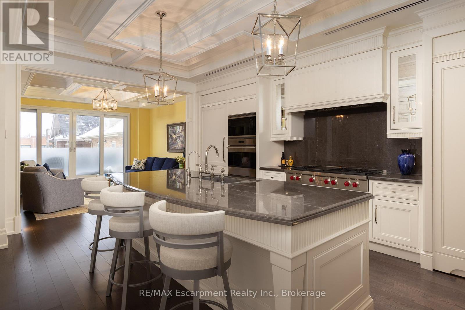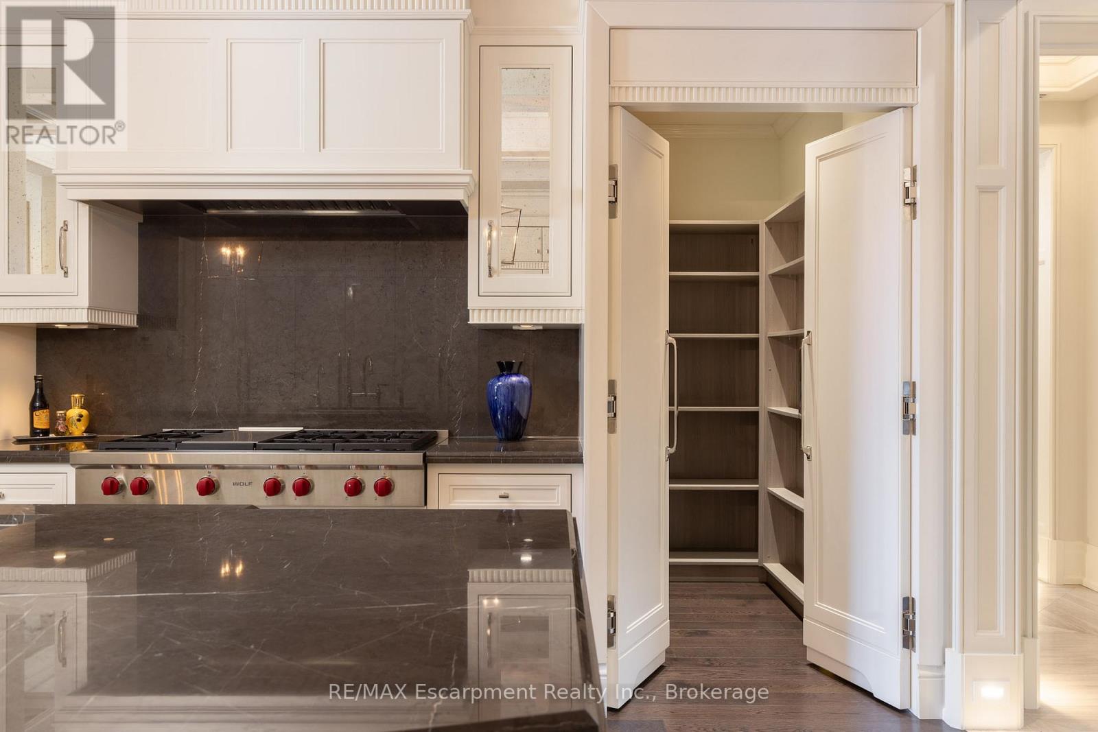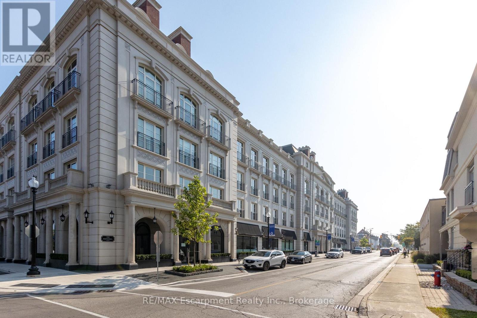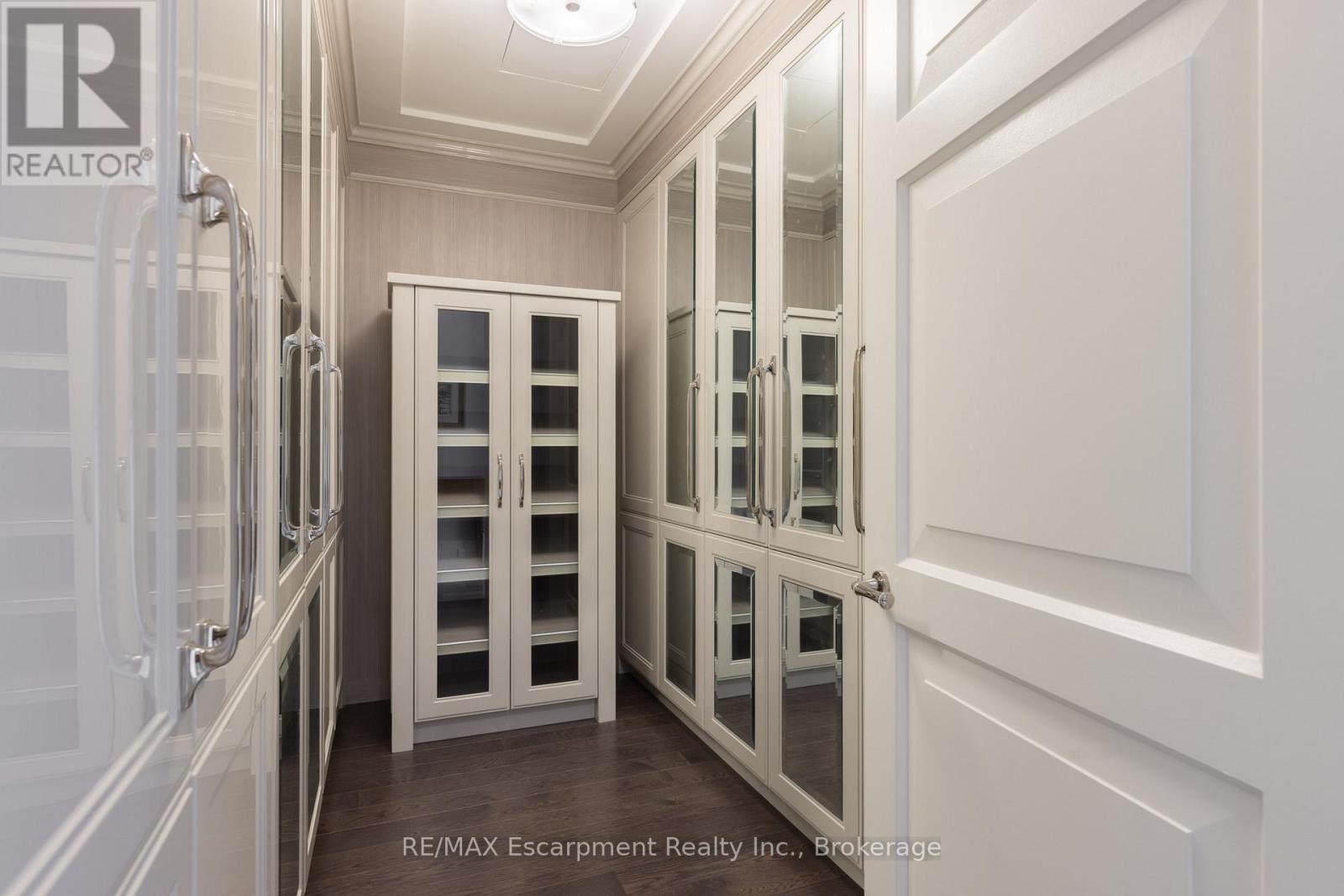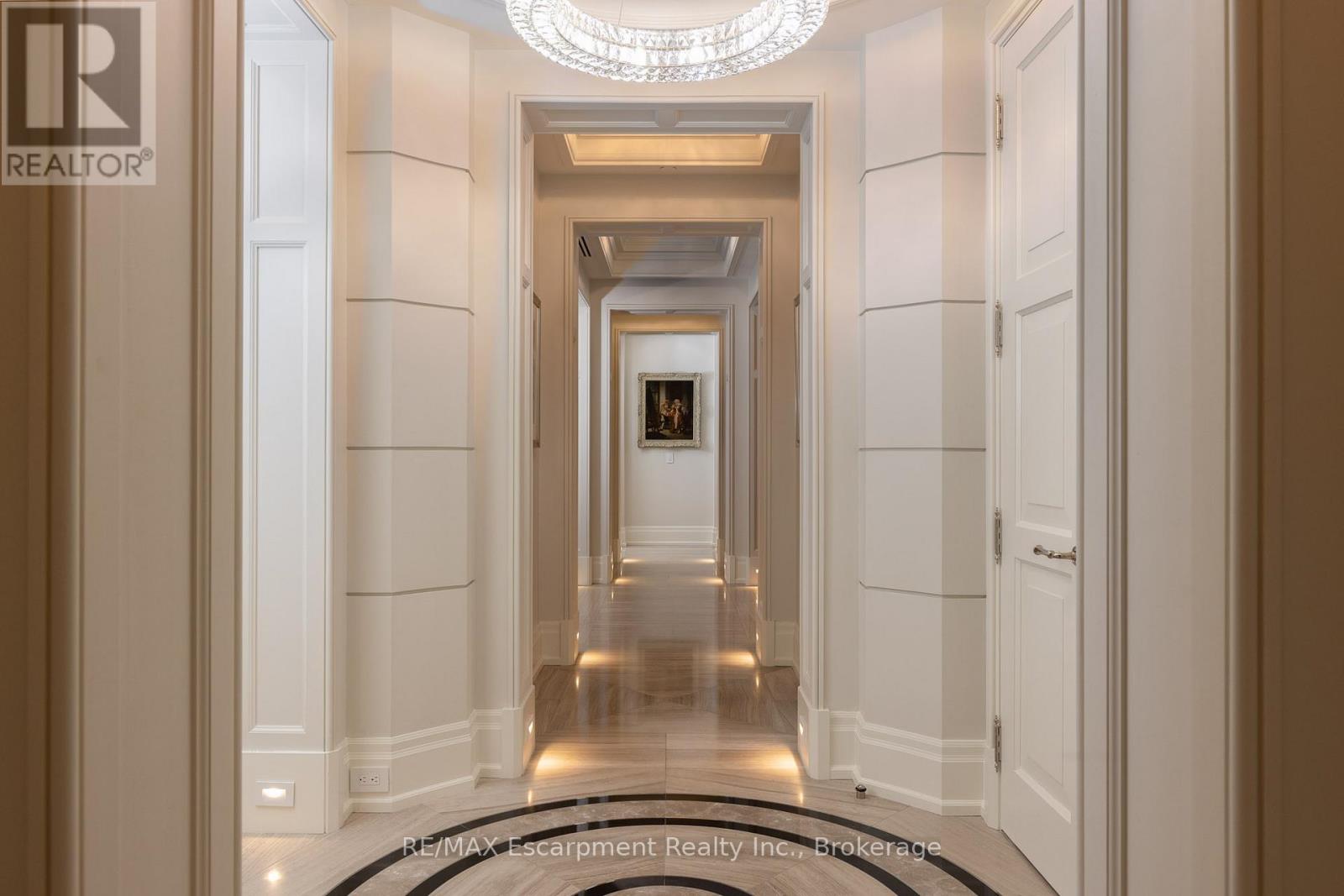 Discover True Luxury Living in This Exceptional Oakville Suite. Welcome to an extraordinary residence that redefines sophisticated condominium living. This stunning two-bedroom suite encompasses an impressive 2,290 square feet of meticulously designed living space, where every detail has been carefully curated to create an atmosphere of refined elegance. Upon entering through the grand rotunda, you are immediately greeted by exquisite slab marble flooring that establishes the tone for the opulence that awaits within. The thoughtful design continues throughout, featuring rich hardwood flooring, intricate millwork, and striking zebra wood accents that speak to the exceptional craftsmanship found in this home. The gourmet kitchen presents a culinary enthusiast's dream, complete with top-of-the-line Wolf,Subzero, and Miele appliances, a generous island for meal preparation and casual gatherings, plus an entire wall of pantry cupboards, and walk-in pantry for additional storage. The Great Room beckons relaxation with built-in cabinetry, and a warm gas fireplace. Step through to the private 335 sq ft terrace for morning coffee or evening contemplation. Entertain graciously in the separate dining room, showcasing zebra wood built-in cabinetry with dedicated wine storage. The primary bedroom suite offers terrace access, a walk-in closet, and a luxurious 4 pc ensuite featuring a vanity area, radiant heated floors and a pampering Kohler toilet ($8500 value). The 2nd bedroom functions beautifully as a home office with custom built-ins and its own three-piece ensuite. Modern convenience abounds with the integrated Crestron system controlling music, lighting, and motorized blinds throughout. 2 side-by-side parking spaces and a storage locker complete this offering. Built by the acclaimed Rosehaven Homes, this residence sits moments from Lake Ontario, fine dining, boutique shopping, & provides effortless access to major transportation routes including the nearby transit station. (id:64974)