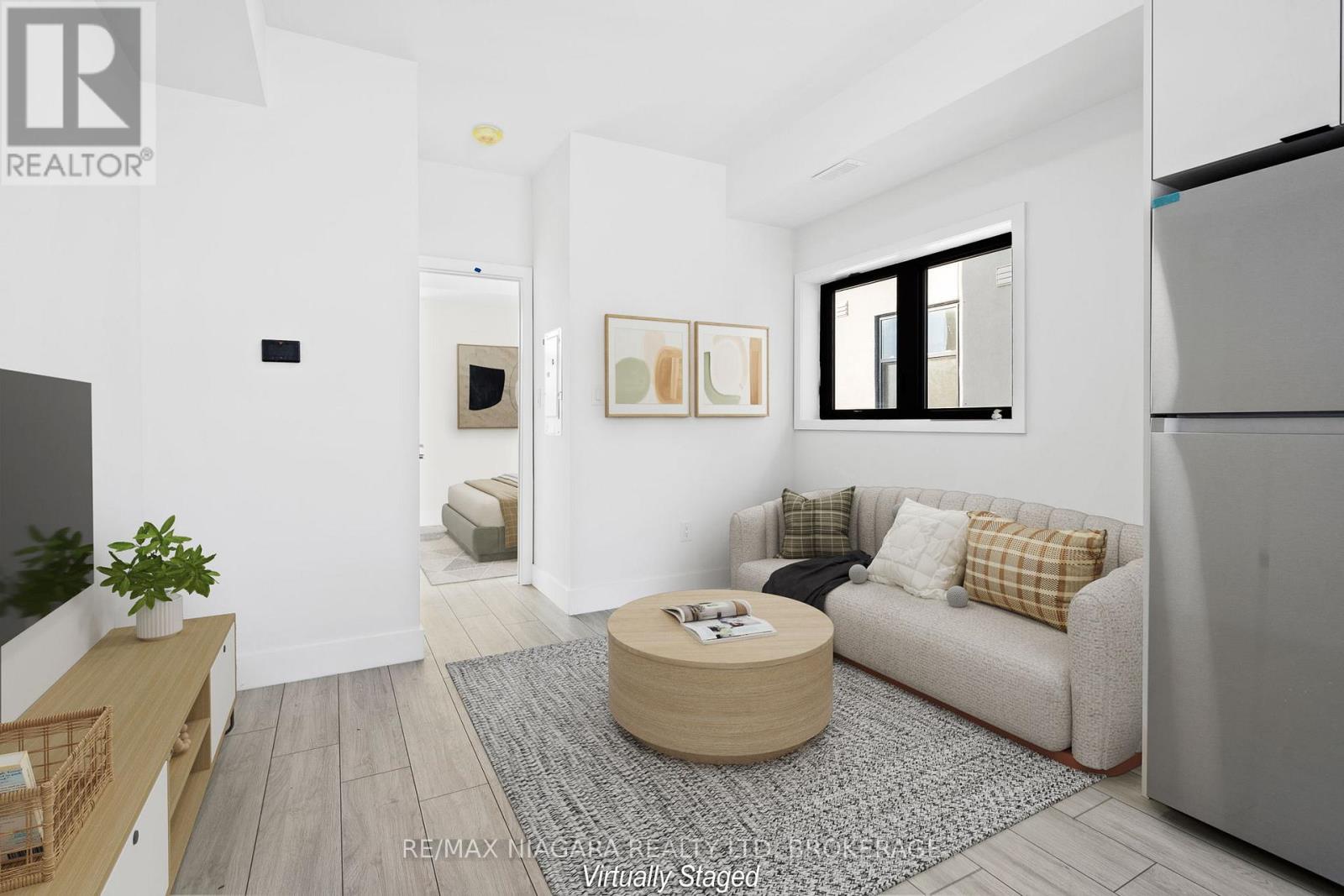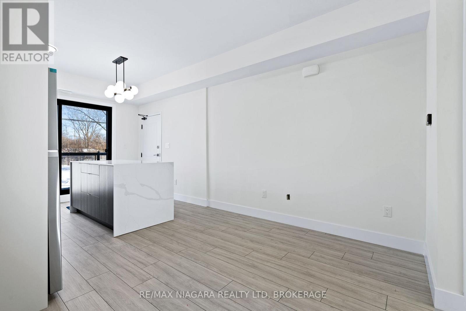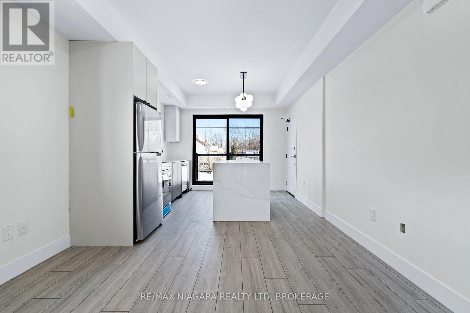 Welcome to Niagaras Latest Urban Retreat! Experience modern living in this pristine 480 sq ft condominium, ideally positioned in the heart of Niagara Falls. This never-lived-in unit boasts an efficient one-bedroom, one-bathroom layout, perfect for professionals or those seeking a stylish, low-maintenance lifestyle.Step into a world of elegance with high-end finishes throughout this contemporary space. The open-plan living area is bathed in natural light, featuring 9-foot smooth ceilings that enhance the sense of space. The sleek, modern kitchen is equipped with stainless steel appliances, quartz countertops, flat-panel cabinetry that extends to the ceiling, and a stylish tiled backsplash. Wide plank designer flooring flows seamlessly throughout the unit, adding a touch of luxury and durability.Relax in the cozy bedroom designed with wood flooring and a spacious closet, providing ample storage solutions. The bathroom echoes the units modern aesthetic with porcelain tiles, an undermount sink, and premium fixtures.This condo offers ultimate convenience, located steps from public transit and just minutes from major retail stores such as Costco, Winners, Walmart, and Metro. With the exciting new Niagara Falls hospital nearby and the iconic Falls just a short drive away, this location is as practical as it is appealing.Ideal for those who value design and convenience, this condo is a perfect blend of style and functionality. Make it yours today and step into the vibrant Niagara lifestyle! **EXTRAS** Brand New Appliances including Washer/Dryer combination unit for the ultimate in convenience. (id:64974)