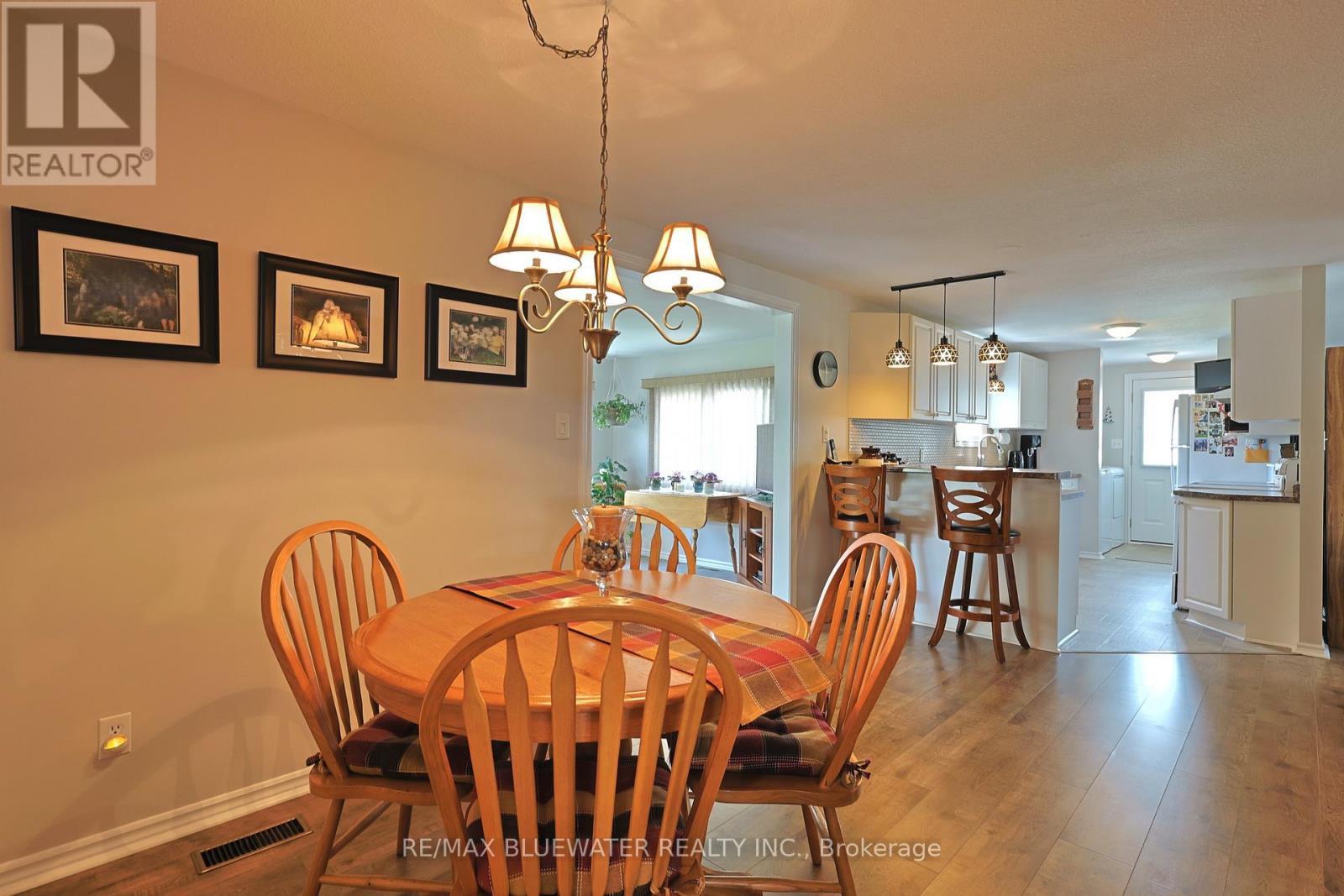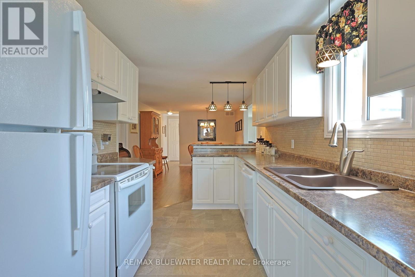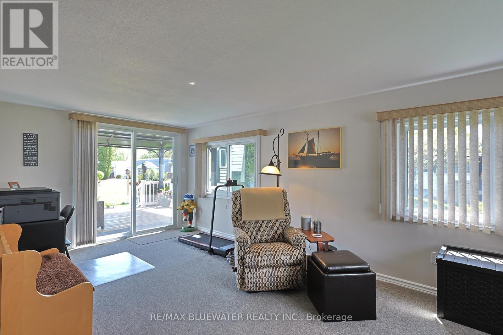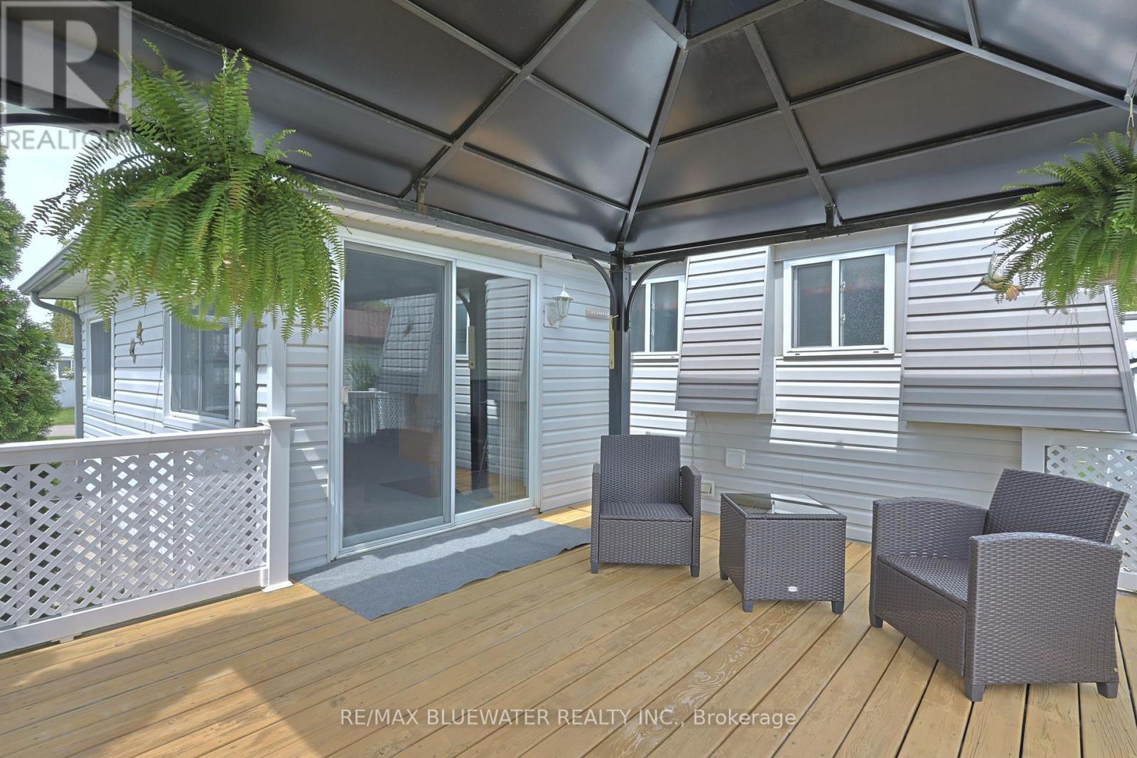 Updated one floor living in the gated leased land community of Grand Cove. Located on a quiet cul-de-sac this home shows of its great curb appeal the moment you turn down the street. Landscaped gardens provide color and beauty around the home while the vinyl siding, metal roof with gutter guards, front and side porches with vinyl railings and composite decking provide a low maintenance great looking appearance. Outside in the backyard you have a large deck with a covered gazebo overlooking your back lawn. Inside, the home was professionally updated in 2004 by Rice Homes featuring drywalled ceilings and walls throughout and constantly improved over the years with recent updates including the furnace and AC in 2019 and new flooring throughout about 9 years ago. The spacious design of the floor plan and large windows allow for large principle rooms flowing with natural light. The living room at the front of the home includes a large picture window overlooking the front entrance, gas fireplace and high quality laminate flooring that flows into the front foyer and dining area off the kitchen. Galley style kitchen with white cabinetry, tile backsplash and eat up countertop. The cabinetry from the kitchen extends into the adjacent laundry area for extra storage and closet space. Added living space in the family room that overlooks the back yard with patio doors leading to the back deck. Main floor primary bedroom with walk through closet and ensuite. Guest room for family and friends and a full bath off the bedroom hall completes the floor plan. Grand Cove Estates is a land lease community located in the heart of Grand Bend. Grand Cove has activities for everybody from the heated salt water pool, tennis courts, wood working shop, garden plots, lawn bowling, nature trails and so much more. All this and your only a short walk to downtown Grand Bend and the sandy beaches of Lake Huron with the world famous sunsets. Come view this home today and enjoy life in Grand Bend! (id:64974)