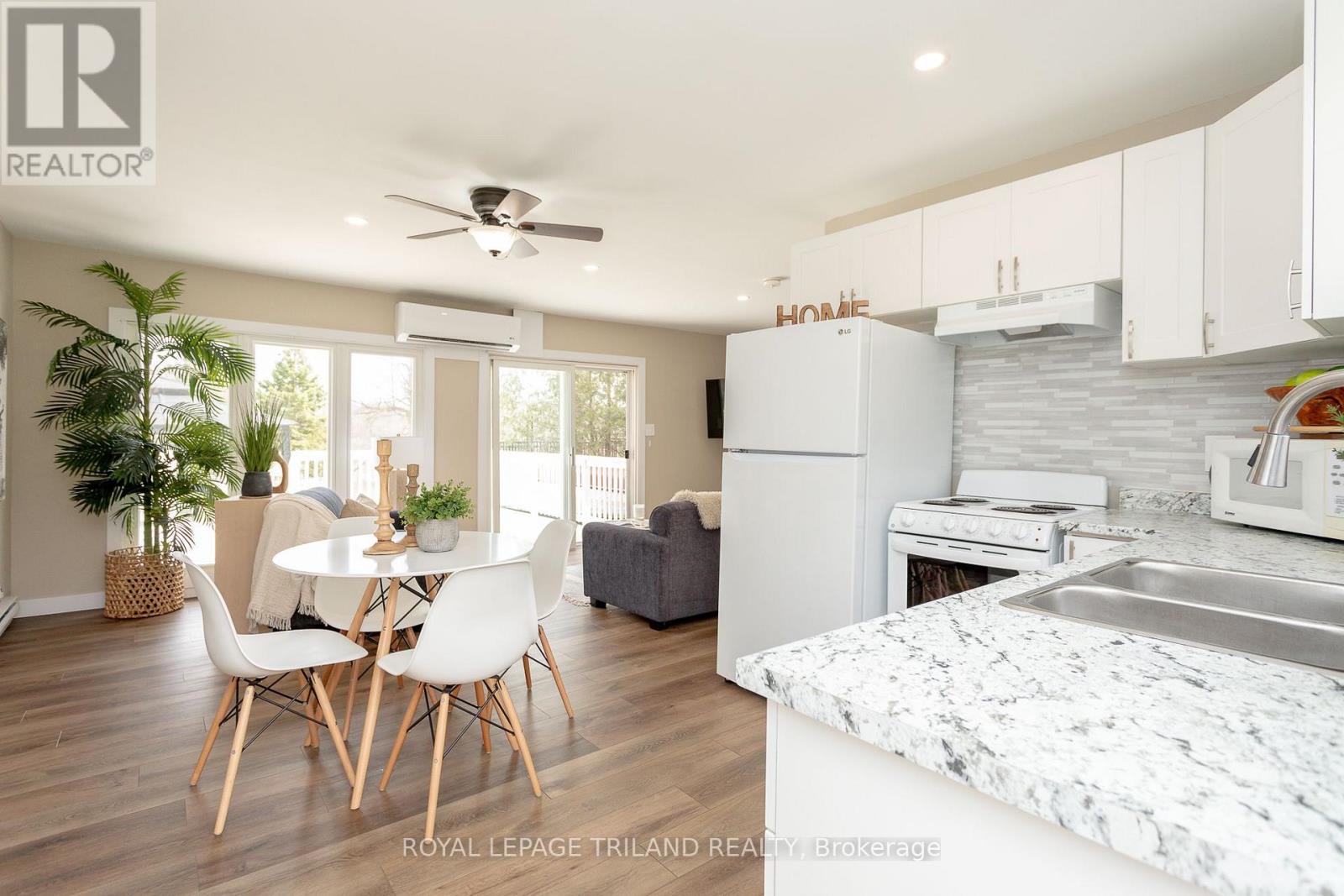 Welcome to lakeside living on beautiful Fanshawe Lake in the charming community of Thorndale. This well-maintained 4-bedroom, 1.5-bath cottage offers the perfect blend of comfort, functionality, and year-round enjoyment-ideal as a full-time residence or a relaxing weekend escape. Set in a welcoming, close-knit community, this property delivers a lifestyle that's hard to match. Enjoy morning walks to the water, afternoons spent swimming or canoeing, and peaceful hikes through the nearby Fanshawe Conservation Area. Every season offers its own unique charm. The home features a number of valuable updates, including windows (approx. 12 years), roof shingles (approx. 9 years), HVAC system (2022), heat pump rated to -20C, kitchen update (2022) with new counter (2023), and a septic system recertified in 2022. Additional highlights include an owned on-demand water heater and an electric vehicle charging station, bringing modern convenience to this lakeside retreat. A spacious rear deck provides the perfect setting for entertaining or simply unwinding outdoors. With four bedrooms, there's plenty of room for family and guests-making it easy to create lasting memories in a peaceful, nature-filled setting. Offered as a leased land cottage with monthly fees of $243.21 (Jan-Feb) and $248.32 (Mar-Dec), this is an excellent opportunity to enjoy affordable lakeside living.Don't miss your chance to experience the Fanshawe Lake lifestyle-where comfort, community, and nature come together. Please note photos were taken when property was staged, which is no longer the case. (id:64974)