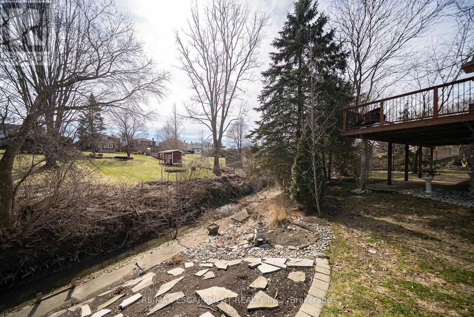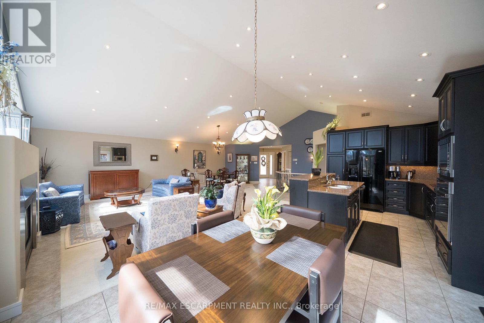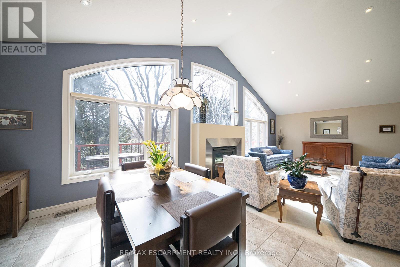 Welcome home to 422 Powerline Road, Unit 21, a detached all-brick bungalow condo in the highly sought-after Rosedale Estates, backing onto a peaceful ravine in Brantford's north-end Rosedale neighbourhood. This well-appointed home offers 1+2 bedrooms, 2.5 bathrooms, 1,734 sq ft on the main level and a 1,513 sq ft finished basement. A 2-car garage and interlocking brick walkway lead to the front entrance, while landscaped grounds offer low-maintenance condo living. The tiled foyer features recessed lighting, built-in shelving, a 2pc bathroom, inside access to the garage and an updated (2021) laundry room. The main level opens to a bright open-concept great room with soaring ceilings, recessed lighting and large windows filling the space with natural light. The great room features formal dining space and a living room with gas fireplace & focal-point ravine windows. The updated (2012) kitchen features shaker-style cabinetry with crown moulding, granite countertops & matching backsplash. Built-in appliances include a wall oven, microwave and cooktop set into the granite. A granite island with seating and storage anchors the space. The breakfast area features patio doors to an expansive wraparound deck with gas BBQ rough-in overlooking the ravine. The primary bedroom features California shutters, recessed lighting, dual closets and a updated (2017) 4pc ensuite with double sinks, shower, heated tile floors and plenty of storage. The finished basement includes a recreation room with built-in shelving, speakers & recessed lighting, plus a walk-out to a rear patio. This level also offers 2 bedrooms, a den and a 3pc bathroom with California shutters throughout. The rear yard features an interlocking patio surrounded by mature trees, with no rear neighbours & a peaceful ravine view. Located in the prestigious and sought-after Rosedale Estates, this well-maintained bungalow condo offers quiet living in one of Brantford's most desirable communities close to everyday amenities. (id:64974)