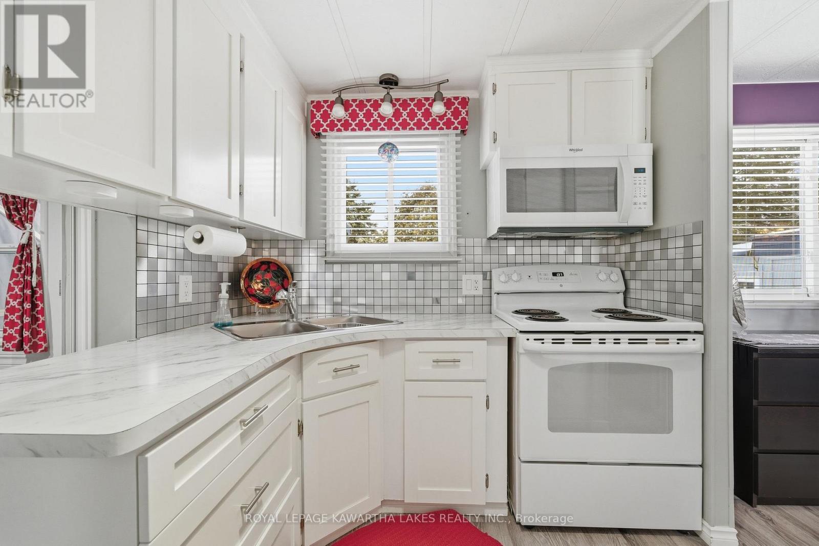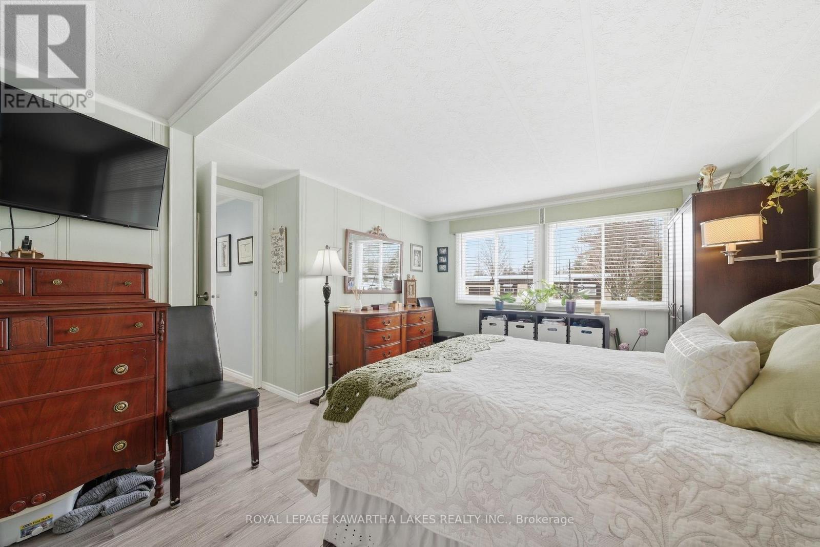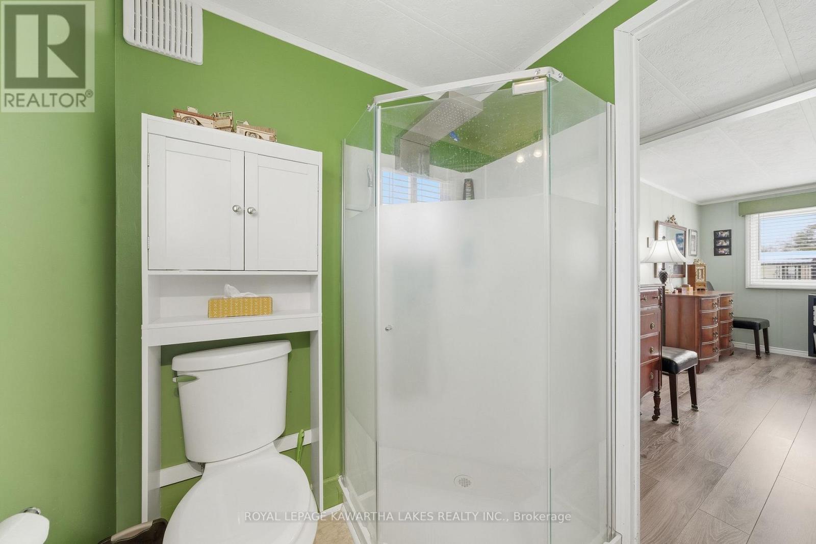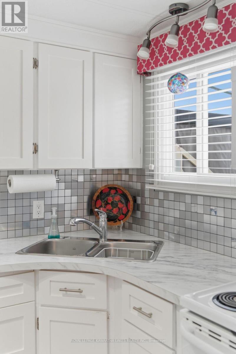 Welcome to Joy Vista Estates-a peaceful, friendly, and affordable adult lifestyle community in beautiful Kawartha Lakes, just 10 minutes from Lindsay. This well-maintained home truly shows pride of ownership and offers 2 bedrooms and 2 bathrooms, thoughtfully updated throughout. Enjoy new flooring, upgraded bathrooms, and a refreshed kitchen featuring new countertops and backsplash, with convenient laundry and pantry space just off the kitchen. The spacious primary bedroom includes a walk-in closet and a 3-piece ensuite. Outside, you'll find a single-car garage, paved laneway, and a garden shed for extra storage. Recent exterior upgrades include 2021 fiberglass shingles with a 20-year transferable warranty, new siding with added 1.5" foam board for improved R-value, new exterior doors, and most windows replaced. Relax and unwind on the maintenance-free deck with a screened gazebo-perfect for enjoying the outdoors. Embrace a low-maintenance lifestyle in this vibrant community. Lease fees to a New Owner $746.76/month (covering land lease fee, applicable taxes, water & water testing, sewers, garbage/recycling pickup) & access to community amenities. (id:64974)