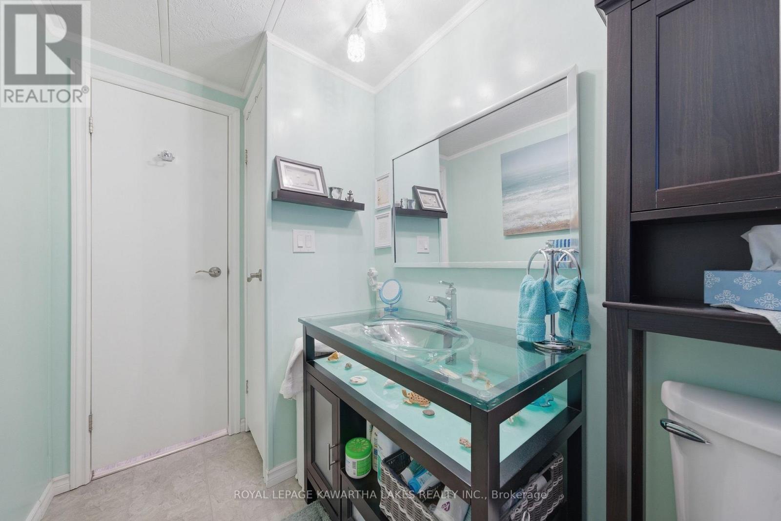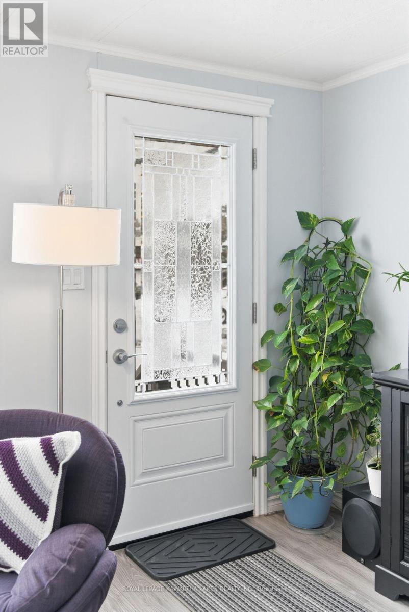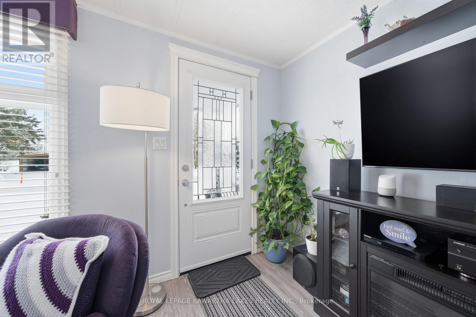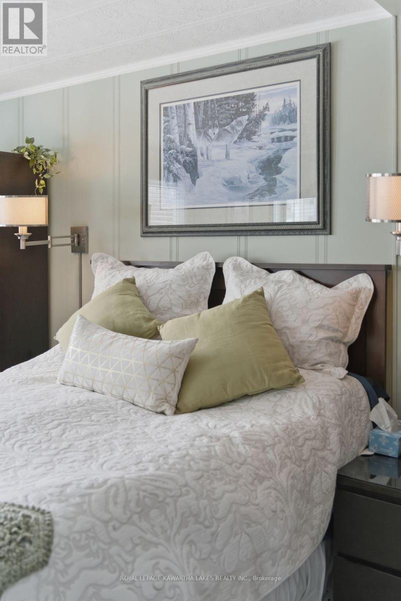 Welcome to Joy Vista Estates-a peaceful, friendly, and affordable adult lifestyle community in beautiful Kawartha Lakes, just 10 minutes from Lindsay. This well-maintained home truly shows pride of ownership and offers 2 bedrooms and 2 bathrooms, thoughtfully updated throughout. Enjoy new flooring, upgraded bathrooms, and a refreshed kitchen featuring new countertops and backsplash, with convenient laundry and pantry space just off the kitchen. The spacious primary bedroom includes a walk-in closet and a 3-piece ensuite. Outside, you'll find a single-car garage, paved laneway, and a garden shed for extra storage. Recent exterior upgrades include 2021 fiberglass shingles with a 20-year transferable warranty, new siding with added 1.5" foam board for improved R-value, new exterior doors, and most windows replaced. Relax and unwind on the maintenance-free deck with a screened gazebo-perfect for enjoying the outdoors. Embrace a low-maintenance lifestyle in this vibrant community. Lease fees to a New Owner $746.76/month (covering land lease fee, applicable taxes, water & water testing, sewers, garbage/recycling pickup) & access to community amenities. (id:64974)