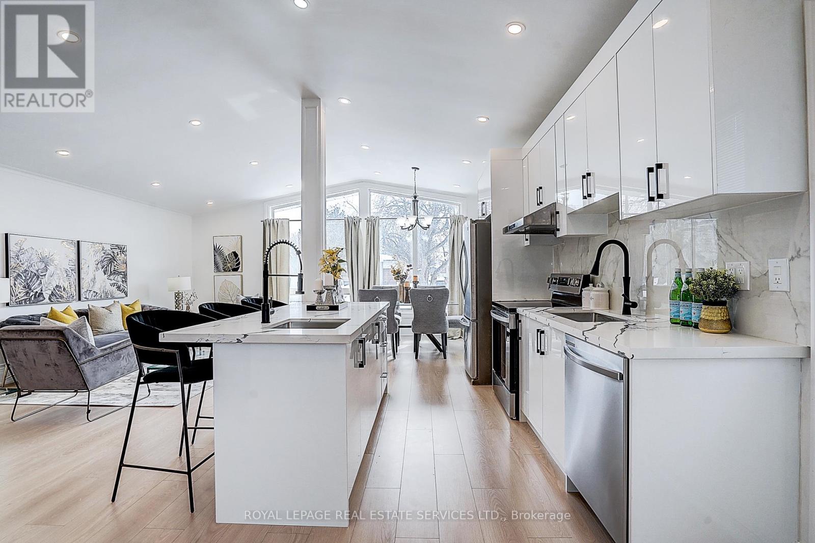 Fully renovated and thoughtfully redesigned, this backsplit home offers modern living in a quiet, convenient, and family-friendly neighbourhood. The bright main level features a stylish open-concept layout with a contemporary kitchen complete with a large central island - perfect for entertaining and everyday family life. Engineered hardwood flooring throughout the main and second levels adds warmth and elegance to the space. The upper level offers three spacious bedrooms, including a primary suite with its own private 3-piece ensuite. The finished basement adds versatility with an additional bedroom, a full 3-piece bathroom, and a dedicated laundry room - ideal for guests, extended family, or a home office setup. Durable laminate flooring throughout the basement ensures both comfort and practicality. Enjoy the convenience of a covered carport and private driveway parking. Located close to top-rated schools, highways, parks, public transit, and major amenities, this move-in-ready home offers modern upgrades, functional design, and incredible value. A rare opportunity to own a fully updated home with space, style, and flexibility. (id:64974)