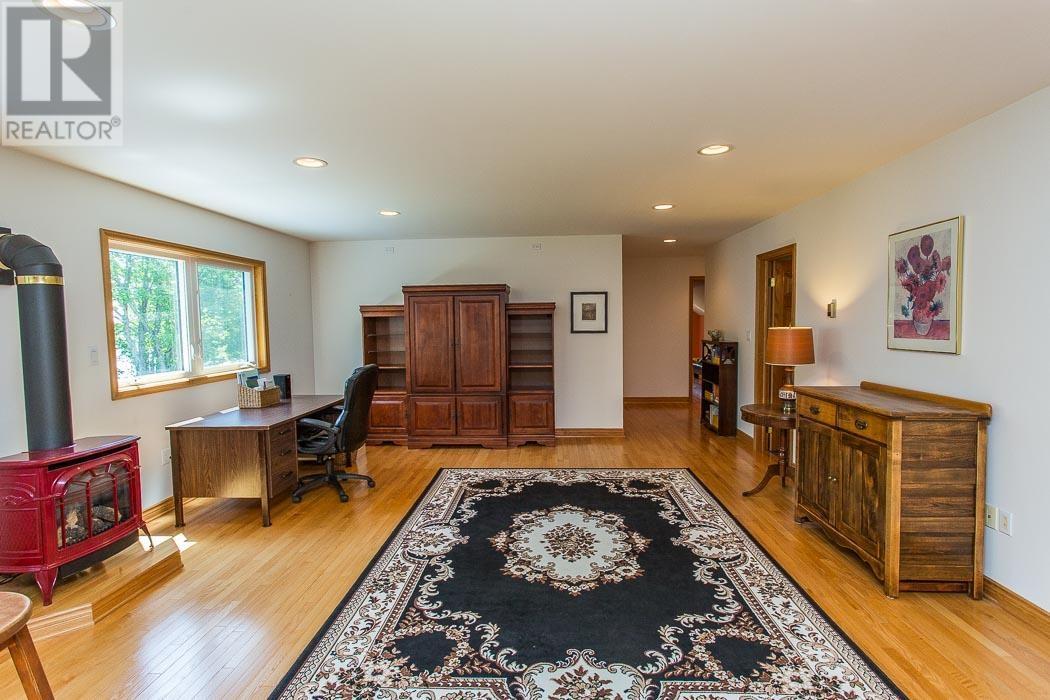 Custom-built, meticulously maintained, and perfectly positioned on a double lot, this waterfront home offers year-round comfort and elevated living! Step inside to an expansive great room featuring hardwood floors, cathedral ceilings, and a show-stopping floor-to-ceiling stone fireplace. The open-concept main level includes a spacious kitchen with raised breakfast bar and views of the lake through curved wall-to-wall windows. Garden doors lead to a covered lakeside deck - perfect for morning coffee or summer entertaining. The main-floor primary suite offers a luxurious lakeside retreat with patio access, his & hers walk-in closets, and an ensuite bath with jet tub, double vanity, and separate shower. Additional main-level features include a large dining area, sitting room, living room, half bath, laundry room with double sink, and access to the attached double+ garage. Upstairs, the lofted living space includes a bonus/rec room, large family room and office area with serene treetop views. Two bedrooms, each with a 4-pc bathroom ensuite complete the upper level. The partially finished basement is clean, drywalled, and painted with great ceiling height, divided into open rooms with storage, workshop area, mechanical room, and rough-ins - offering incredible potential to finish to your needs. A true Northern Ontario gem built for relaxed elegance, entertaining, and life on the water. With full town services including natural gas and cable, and convenient access to the highway and all town amenities, yet a world away from the ordinary at this exclusive peninsula location in Lake Huron. (id:64974)