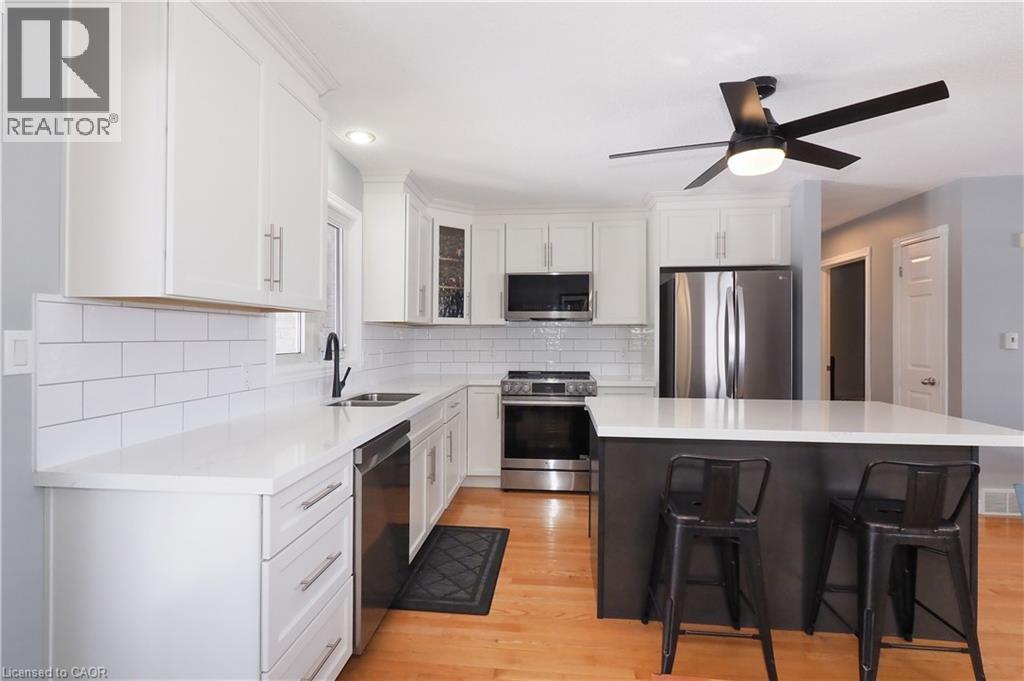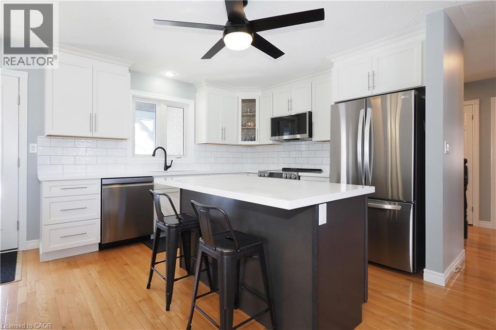 Welcome to 21 Moore St in Stratford Great brick bungalow with 2 bedroom, two full baths, and a heated 2-car garage, ideally located close to the trails at the TJ Dolan Natural Area and minutes from the historic downtown Stratford. This well-maintained home overlooks a beautiful fenced backyard featuring mature landscaping and a large shed — perfect for relaxing or entertaining. From the welcoming front porch, step into a spacious family room and large-sized dinette, flowing into the bright main floor showcasing a newly renovated open-concept kitchen with a large island, elegant quartz countertops, a sleek under mount sink, and modern finishes. A generous front closet provides convenient storage for coats and shoes. Down the hall, you’ll find the primary bedroom complete with a large walk-in closet, a second bedroom, and a 4-piece bathroom with a featured skylight. A practical mudroom connects the home to the oversized heated 2-car garage — ideal for year-round convenience. The fully finished basement offers additional living space with a large office, full bath, cozy family room/den with a gas fireplace, storage room, laundry/utility room, and a cold room located beneath the front porch. Move-in ready and thoughtfully updated — Don’t delay schedule your private showing today! (id:64974)