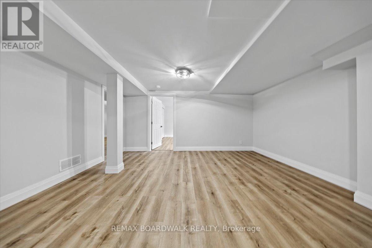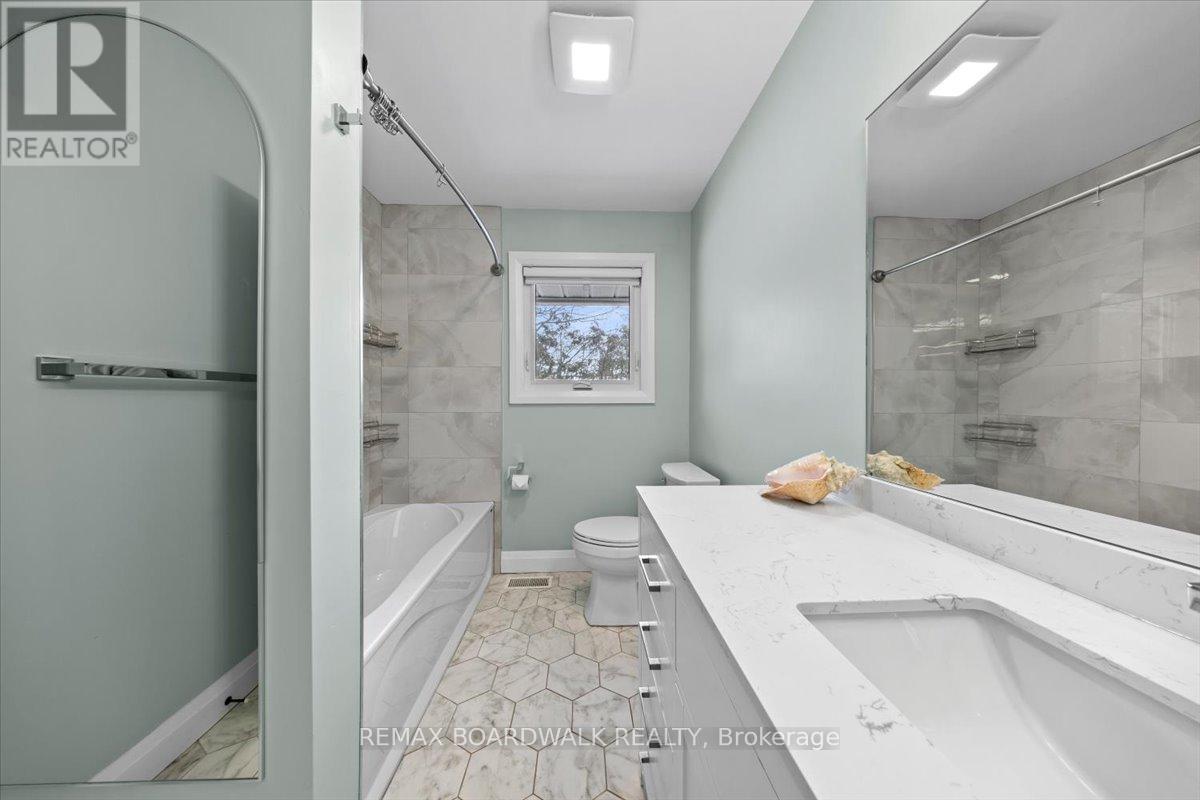 Graceful brick bungalow positioned on a wide lot w/warm southern exposure. A double wide driveway & covered front entrance lead to a welcoming foyer finished w/oversized tile & a front hall closet. The main level presents a refined architectural palette w/site finished hardwood flooring, high profile baseboards, flat ceilings & classic two panel interior doors that create a clean & timeless interior. The living room is bright & composed, framed by oversized windows, plaster crown moulding & subtle pot lighting that enhances the natural light. The dining room offers an elegant transition to the outdoors w/a chandelier, pantry storage & a patio door that opens to the rear deck & garden. The kitchen has been thoughtfully updated w/quartz countertops, recessed sink, two tone shaker cabinetry w/glass door accents, pot drawers & an oversized subway tile backsplash. Multiple windows introduce soft daylight, creating a space that is both functional & visually balanced. Two well proportioned bedrooms complete the main level. The primary bedroom enjoys southern exposure & features a double wide closet. The main bathroom presents quartz countertops, a multi drawer vanity, octagon tile flooring & a moulded tub with tiled surround. A side entrance leads to the rear hallway w/direct access to the lower level & a convenient parcel delivery cabinet. The finished lower level expands the living environment w/a spacious recreation room finished in wide plank flooring & centred around a gas fireplace. Additional spaces include a third bedroom, a den or office w/closet storage & a three piece bathroom w/stand up shower & laundry. The utility room offers generous storage, a soaker sink & two walk in closets. The garage provides inside access & natural light. The private rear yard enjoys southern exposure & is framed by mature trees, w/a deck & hot tub creating a quiet outdoor retreat. 24 Hour irrevocable on all offers. (id:64974)