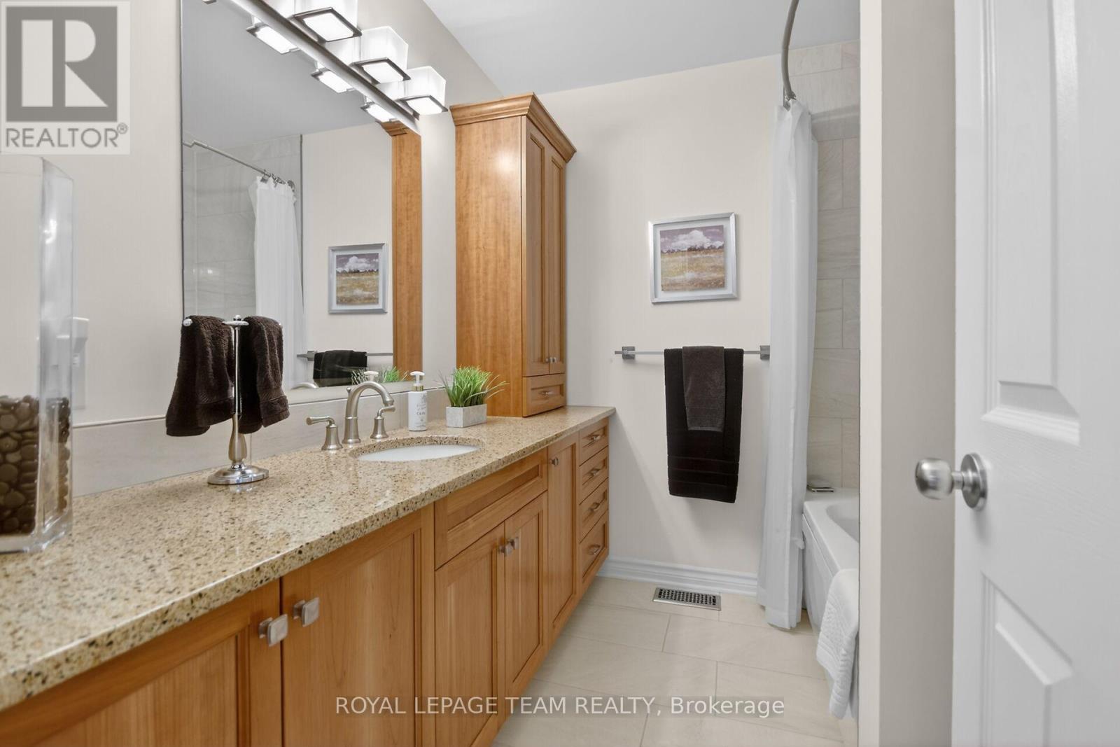 Outstanding end unit townhome (Minto Park Place) with brick façade, 3 bedrooms plus loft & 3 baths, nestled on a private street in Morgan's Grant. Short walk to South March Highlands, parks, schools & rec center. Lovely gardens, interlock walkway, fenced backyard w/patio & garden shed. Private driveway & no easement in the backyard. Highlights include: porcelain tile & Brazilian cherry hardwood floors & stairs, custom kitchen & dining room w/soft close cabinets w/quartz counters, renovated baths, upgraded lighting & custom closets. A sliding French door opens to the dining & living room from the foyer. Kitchen has a wider opening to the dining room, perfect for entertaining. Kitchen features: custom cabinets, pot drawers, pullout organizers, quartz counters, tile backsplash, task & recessed lighting, & an added window over the sink. Counter extends to a peninsula w/breakfast bar. Patio door provides access to the backyard, great for barbecues. Living room has a big picture window w/views of the backyard. A custom cabinet can stay with the home, if the purchaser desires. Hardwood stairs & railing with metal spindles to the 2nd level w/hardwood floors in the hall & primary bedroom. Loft makes a perfect office or could be a 4th bedroom. It has a tall window & overhead lighting. Primary bedroom has a big window w/views of the backyard & a custom walk-in closet. Ensuite bath features in-floor heating & tiled double shower w/bench. Custom walnut vanity w/soft close drawers, quartz counters & an extra vanity w/mirror, perfect for make-up. 2 more bedrooms, each a good size w/Berber carpet, double closets, overhead lights & tall windows. Main bath has a jet tub w/shower & tile surround, a cherry wood vanity & extra cabinet. Staircase is open to lower level family room which has fantastic space for relaxing & a home office. Gas fireplace has stone facade & there is a deep window for natural light. Separate laundry & utlity room & a workshop. 24 hours irrevocable on offers. (id:64974)