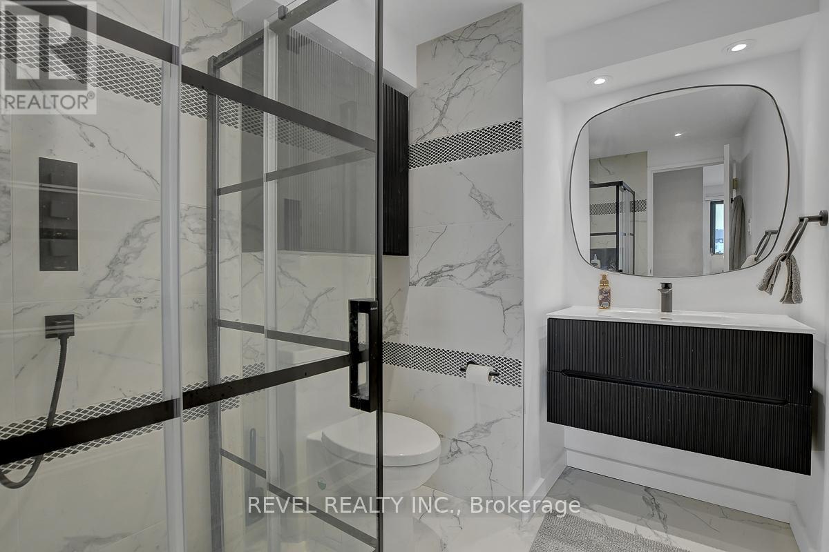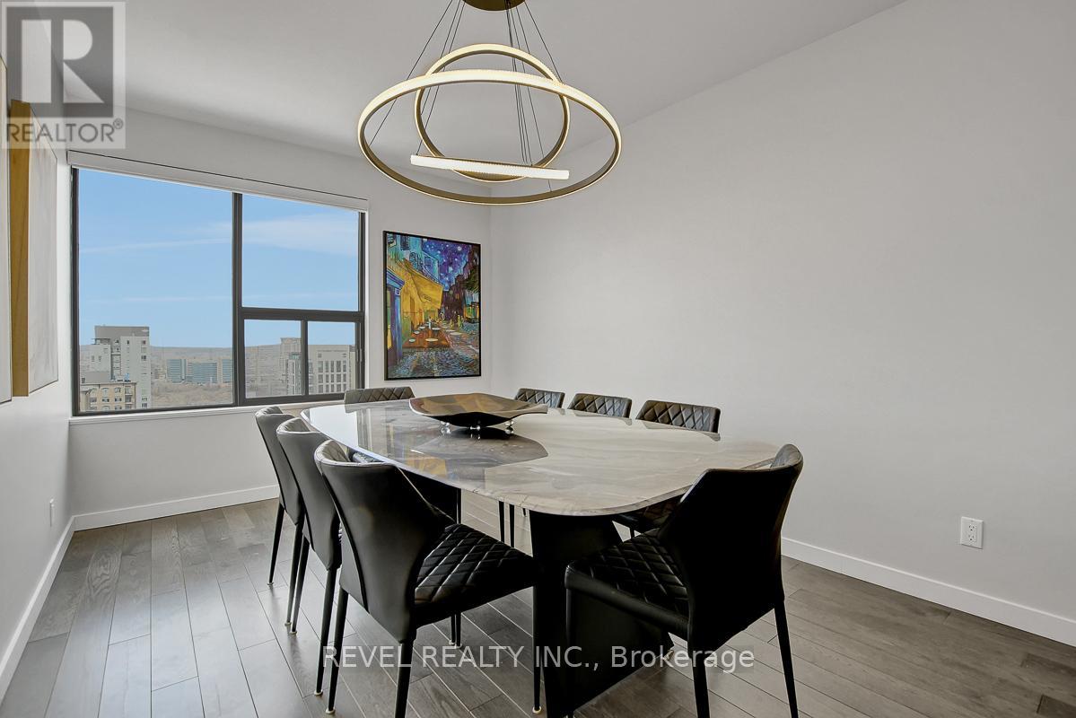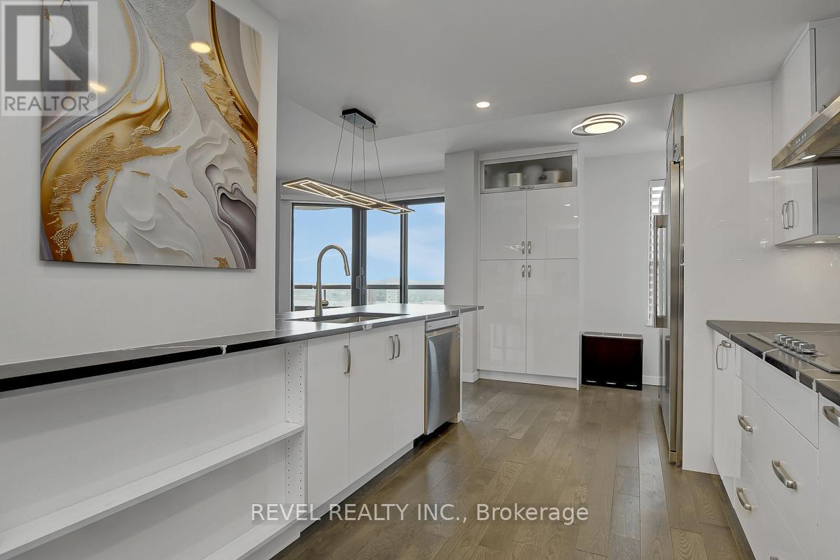 Welcome to a truly exceptional residence in the heart of downtown. This stunning 2-storey condo offers a rare "townhouse in the sky" experience, combining the spaciousness and privacy of a traditional home with the convenience and prestige of a luxury condo. Thoughtfully designed and extensively renovated, this 1880 square foot, 3-bedroom, 2.5-bathroom home showcases over $270,000 in high-end upgrades completed in recent years. Every detail has been carefully curated to deliver a refined, modern aesthetic paired with functional elegance. The main level features a completely reimagined open-concept layout, anchored by a breathtaking kitchen renovated in 2023. Designed for both everyday living and entertaining, the kitchen boasts a professional chef's level of modernity, premium finishes, abundant workspace, and a seamless flow into the expansive living areas. Brand new hardwood flooring (2023), running throughout, adds style and continuity to the space. Large windows and patio door access to the North West facing terrace flood the interior with natural light while framing uninterrupted panoramic views. Newly renovated powder room (2025) and the stately private dining room that could also be a top-notch office complete this level. Downstairs, the private quarters offer three bedrooms, including a luxurious primary retreat. The primary bedroom features its own North West facing private balcony, creating a serene escape where you can unwind while enjoying breathtaking views of the Ottawa River and Gatineau Hills. A massive walk in closet and brand new luxurious ensuite (2025) complete this hotel like getaway. The bright second bedroom is perfect for guests or kids and the comfortable 3rd bedroom provides a great area for office or relaxing. This level also has a beautifully renovated family bathroom (2025) and laundry room which house a second private entrance for the unit. (id:64974)