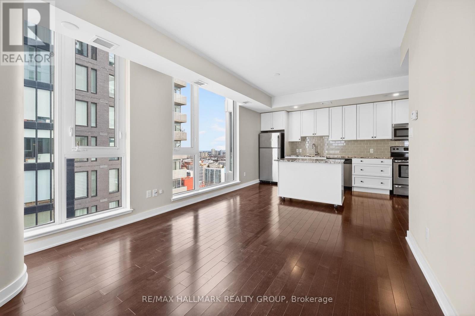 Welcome to The Surrey at Tribeca East! This beautifully maintained 1 Bedroom + Den condo offers 753 sq. ft. of bright, open-concept living space on the 21st floor, showcasing elevated city views and a smart, functional layout. This unit features a spacious primary bedroom, a versatile den ideal for a home office, and a modern kitchen/living/dining area designed for both everyday living and entertaining. The sleek kitchen is equipped with granite countertops, stainless steel appliances, and a moveable island, seamlessly connecting to the living space. Step onto your private balcony and take in the downtown skyline from above. Additional highlights include in-unit laundry and central air conditioning. Residents enjoy access to exceptional amenities, including a fitness centre, indoor pool, party room, rooftop terrace, and concierge service. Located in an unbeatable downtown setting - Farm Boy right next door and Parliament Hill, the Rideau Canal, LRT stations, shopping, and dining all within walking distance - you may not even need the one underground parking spot included. Ideal for professionals, downsizers, or investors seeking premium urban living at one of Ottawa's most desirable addresses. Condo fees include: Heat, Water, A/C, Building Insurance, Garbage Removal, Reserve Fund Allocation, and Building Maintenance. (id:64974)