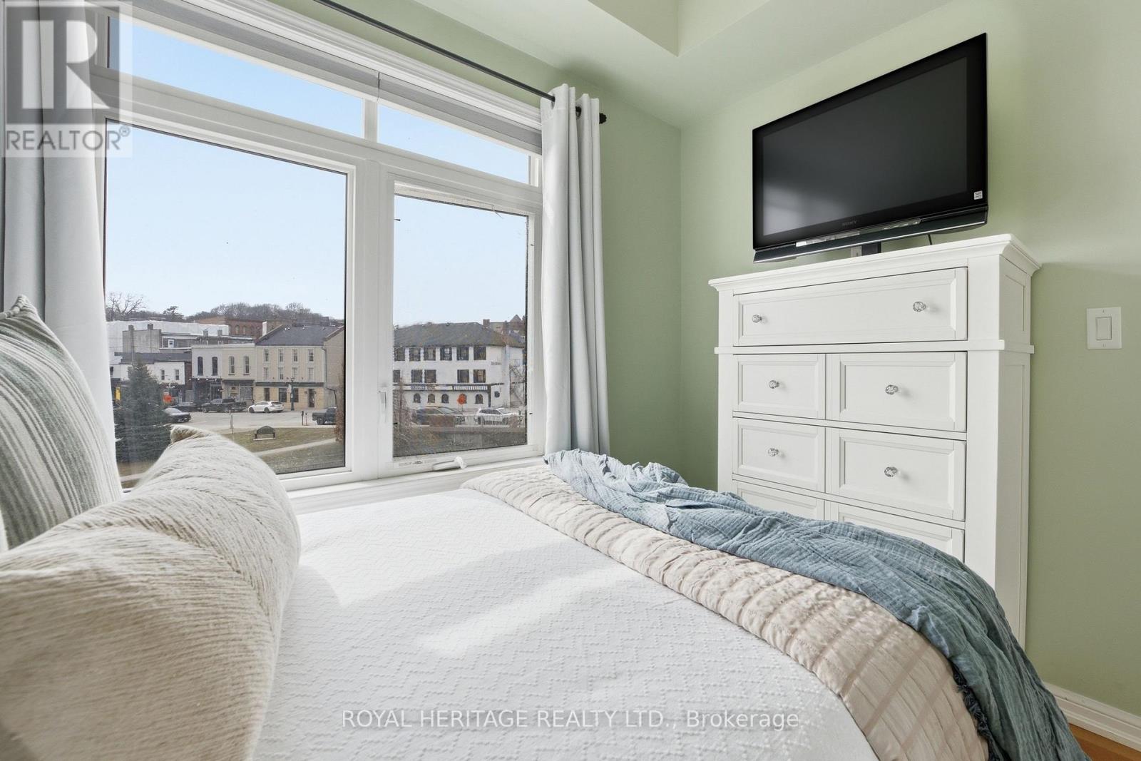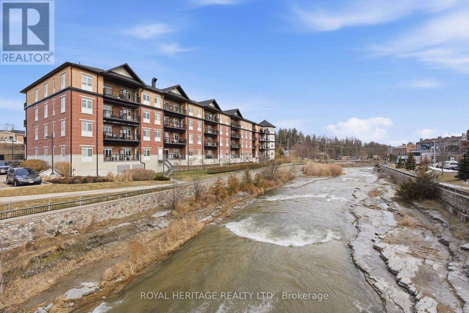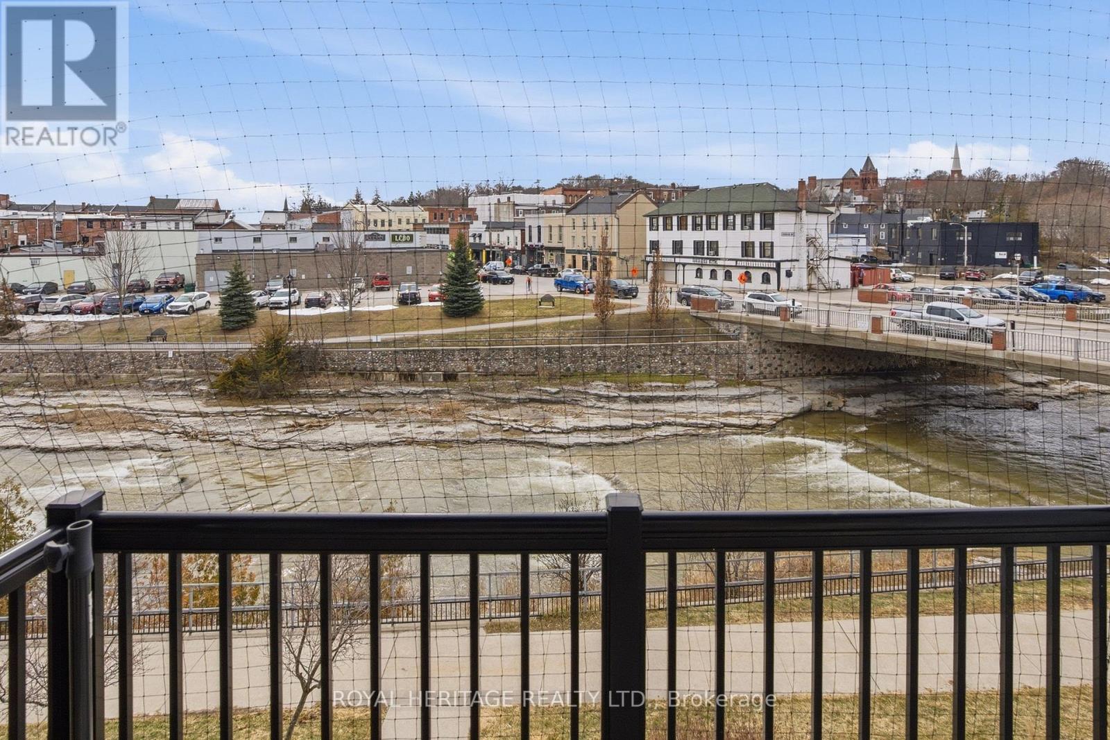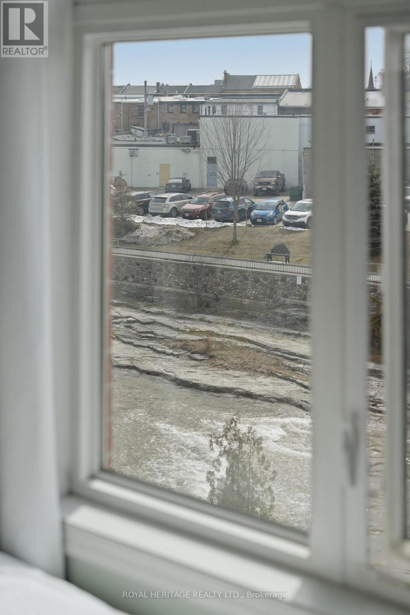 Luxury living in the heart of Port Hope at River's Edge Condominiums. This 562sf + Balcony, one bedroom unit is drenched with natural light, thanks to its' south-western exposures. Panoramic vistas over the Ganaraska River and the heart of historic downtown Port Hope, yet only 3 minutes off the 401, make this a perfect location for those with an active lifestyle who want to be in thick of it. Perfect as your first entry in the to real estate market as either a buyer, a tidy rental in a luxury designed and professional operated building, all the way up to the downsizing retiree who has the best of life left ahead. Features deeded underground parking in a bright, warm, and clean garage with secure entrance and a climate controlled ramp, making winter snow clearing a thing of the past. A roomy balcony overlooking the river where days are spent enjoying the activity of town and running of the trout, salmon, etc., *nearly* close enough to cast your line, and bird-netting professionally installed. With its flexible floorplan, enjoy the ability to adjust your layout to suit your needs. The bedroom has large windows and a large double closet, and a triple closet adjacent to the foyer provides ample storage. The building includes a community room to host gatherings and spend time socializing with neighbours in the evening (Euchre anyone!?!). The building boasts a variety of residents across all age ranges, but all enjoy and appreciate each other, with a constant chiming of friendly "hellos" as you pass people in the halls, or in the reception area. Double elevators mean short waits, and the overimproved stairwell puts some houses to shame, with its bright expanses of non-slip carpeting. the building is exceptionally clean and well maintained thanks to the well-functioning Board and solid financials, with Condo fees that are reasonable. This building is a landmark for its impressive built-form and quality of workmanship, and it attracts solid citizens. (id:64974)