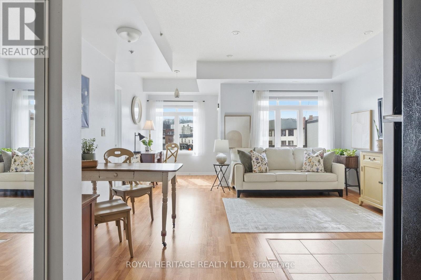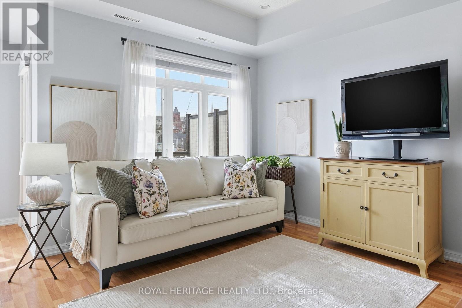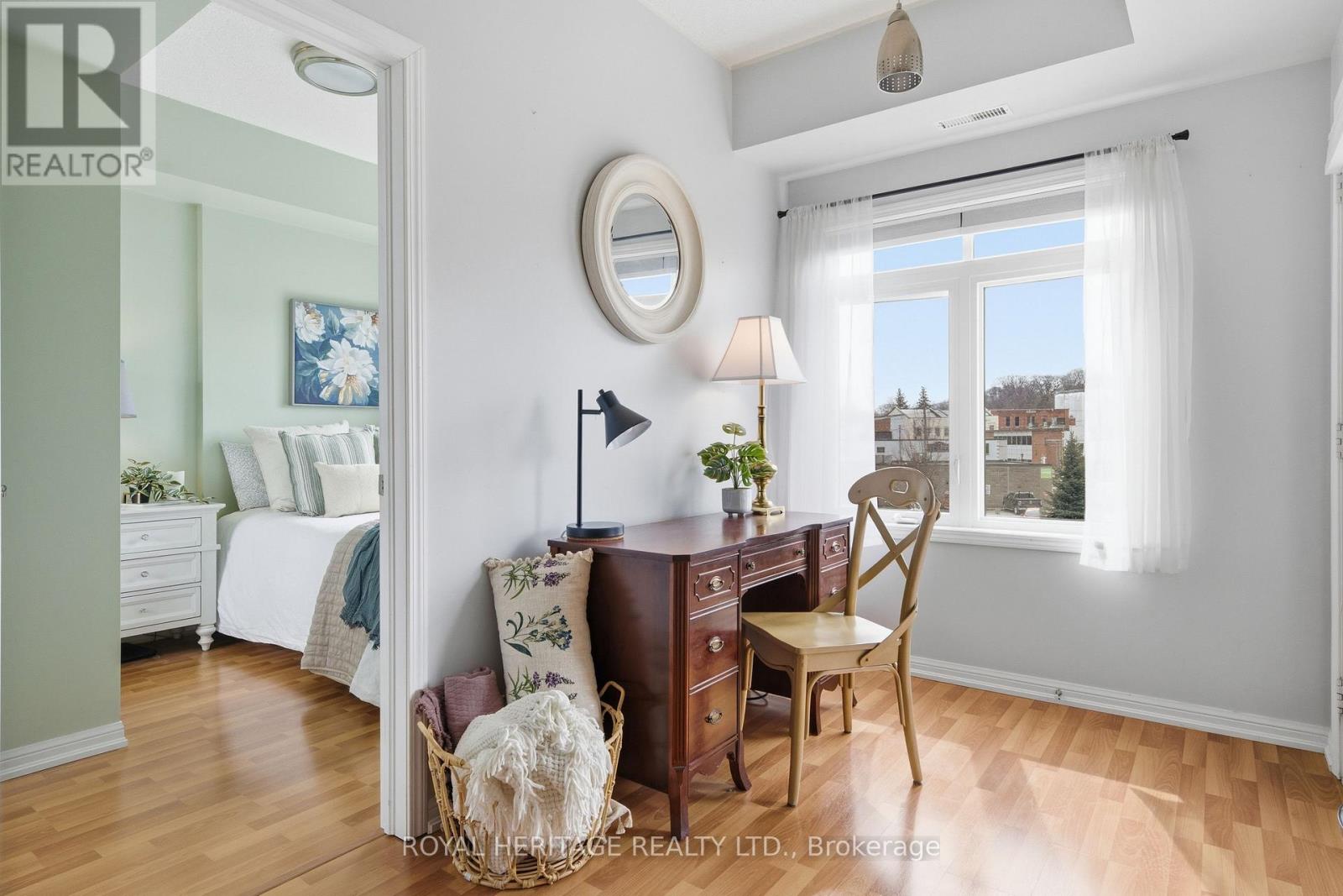Luxury living in the heart of Port Hope at River's Edge Condominiums. This 562sf + Balcony, one bedroom unit is drenched with natural light, thanks to its' south-western exposures. Panoramic vistas over the Ganaraska River and the heart of historic downtown Port Hope, yet only 3 minutes off the 401, make this a perfect location for those with an active lifestyle who want to be in thick of it. Perfect as your first entry in the to real estate market as either a buyer, a tidy rental in a luxury designed and professional operated building, all the way up to the downsizing retiree who has the best of life left ahead. Features deeded underground parking in a bright, warm, and clean garage with secure entrance and a climate controlled ramp, making winter snow clearing a thing of the past. A roomy balcony overlooking the river where days are spent enjoying the activity of town and running of the trout, salmon, etc., *nearly* close enough to cast your line, and bird-netting professionally installed. With its flexible floorplan, enjoy the ability to adjust your layout to suit your needs. The bedroom has large windows and a large double closet, and a triple closet adjacent to the foyer provides ample storage. The building includes a community room to host gatherings and spend time socializing with neighbours in the evening (Euchre anyone!?!). The building boasts a variety of residents across all age ranges, but all enjoy and appreciate each other, with a constant chiming of friendly "hellos" as you pass people in the halls, or in the reception area. Double elevators mean short waits, and the overimproved stairwell puts some houses to shame, with its bright expanses of non-slip carpeting. the building is exceptionally clean and well maintained thanks to the well-functioning Board and solid financials, with Condo fees that are reasonable. This building is a landmark for its impressive built-form and quality of workmanship, and it attracts solid citizens. (id:64974)