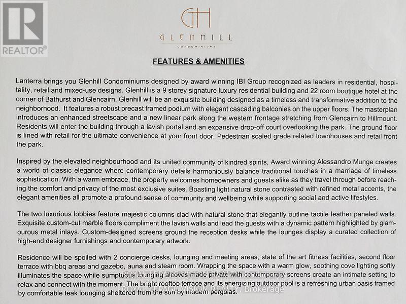 Live at one of the most luxurious buildings in Toronto managed by The Forest Hill Group. Sunrise East views new never lived in Two bedroom 796 sq ft per builders floorplan, one locker ( no parking ), all engineered hardwood / ceramic / porcelain and marble floors no carpet, marble floor and tub wall tile in washroom, upgraded baseboards, upgraded stone counters and stone backsplash, upgraded kitchen cabinets, upgraded Miele Appliances. Next door to Bialik Hebrew Day School and Synagogue, building and amenities under construction to be completed in Summer 2026, 23 room hotel on site ( $ fee ), 24 hr room service ( $ fee ), restaurant ( $ fee ) and other ground floor retail - to be completed by end of 2026, Linear park from Glencairn to Hillmount - due in 2027. Landlord will consider longer than 1 year lease term. Price reduced in lieu of amenities not being ready, take advantage today! (id:64974)
