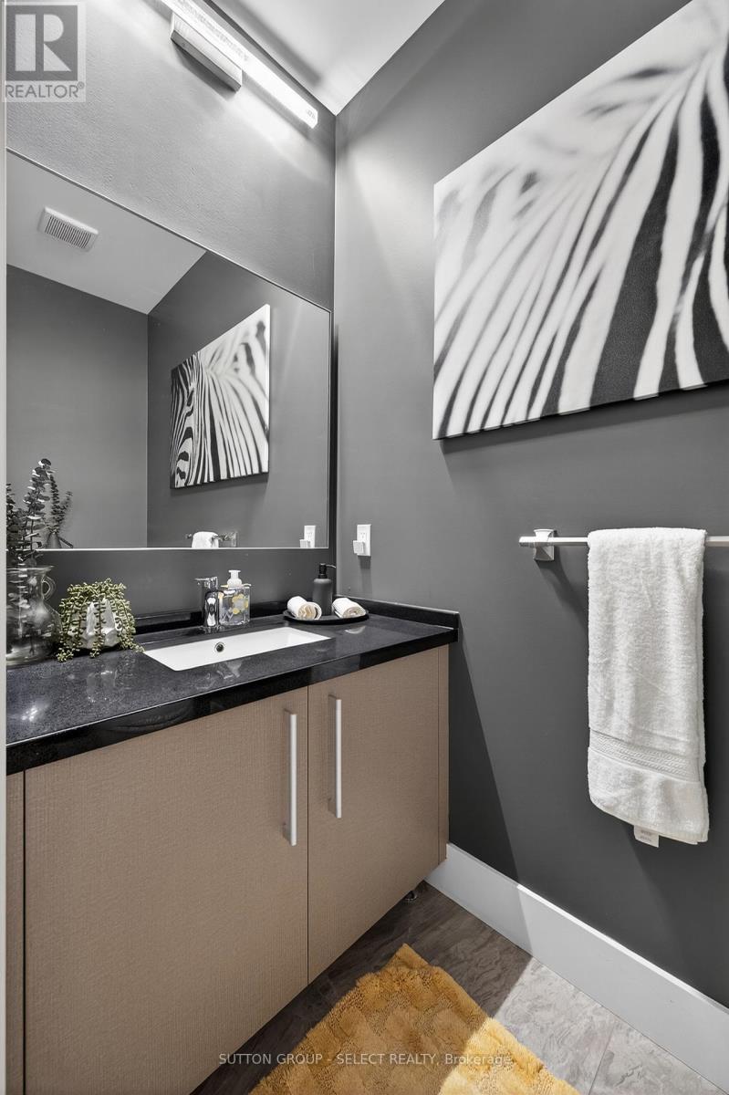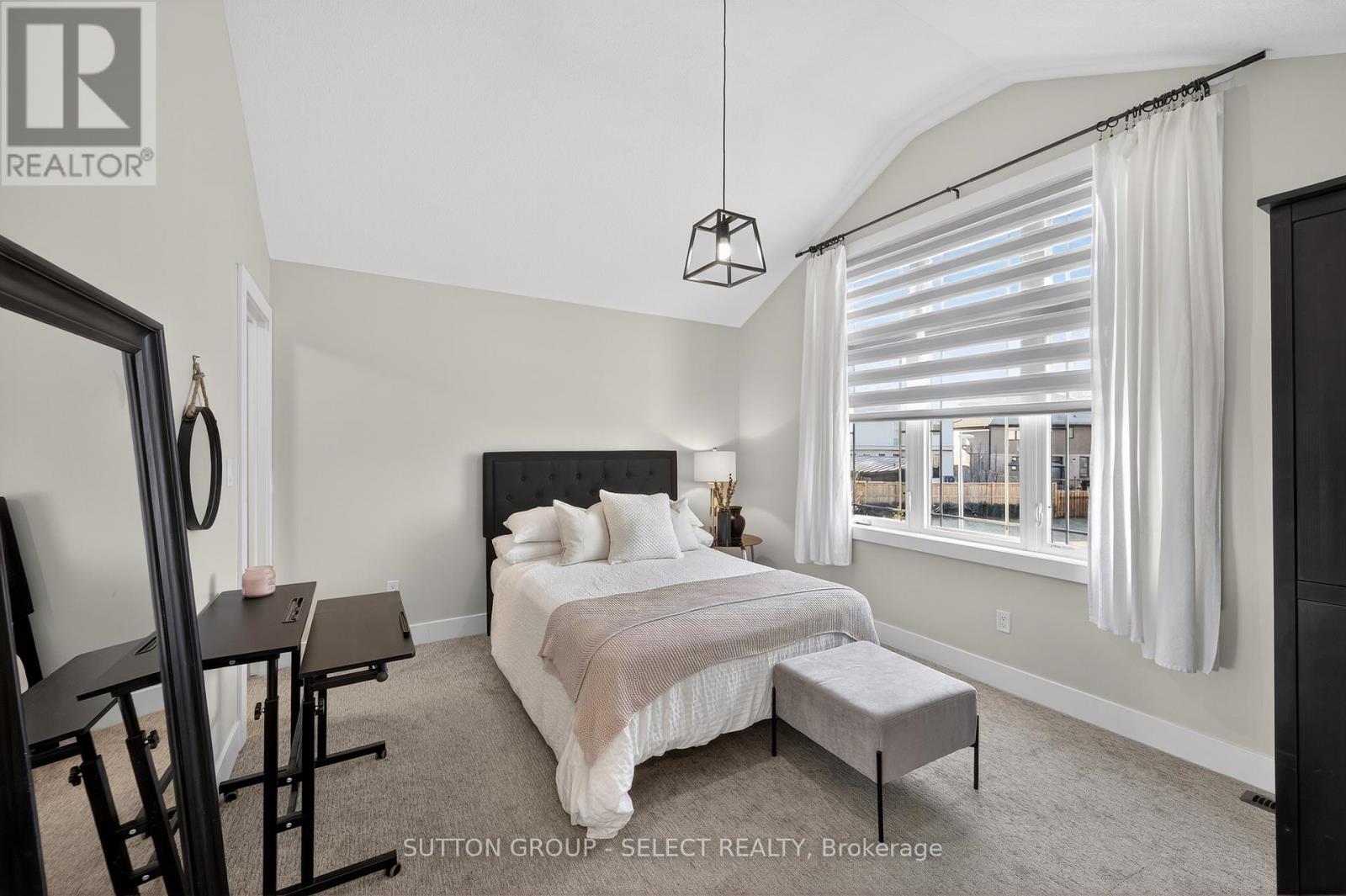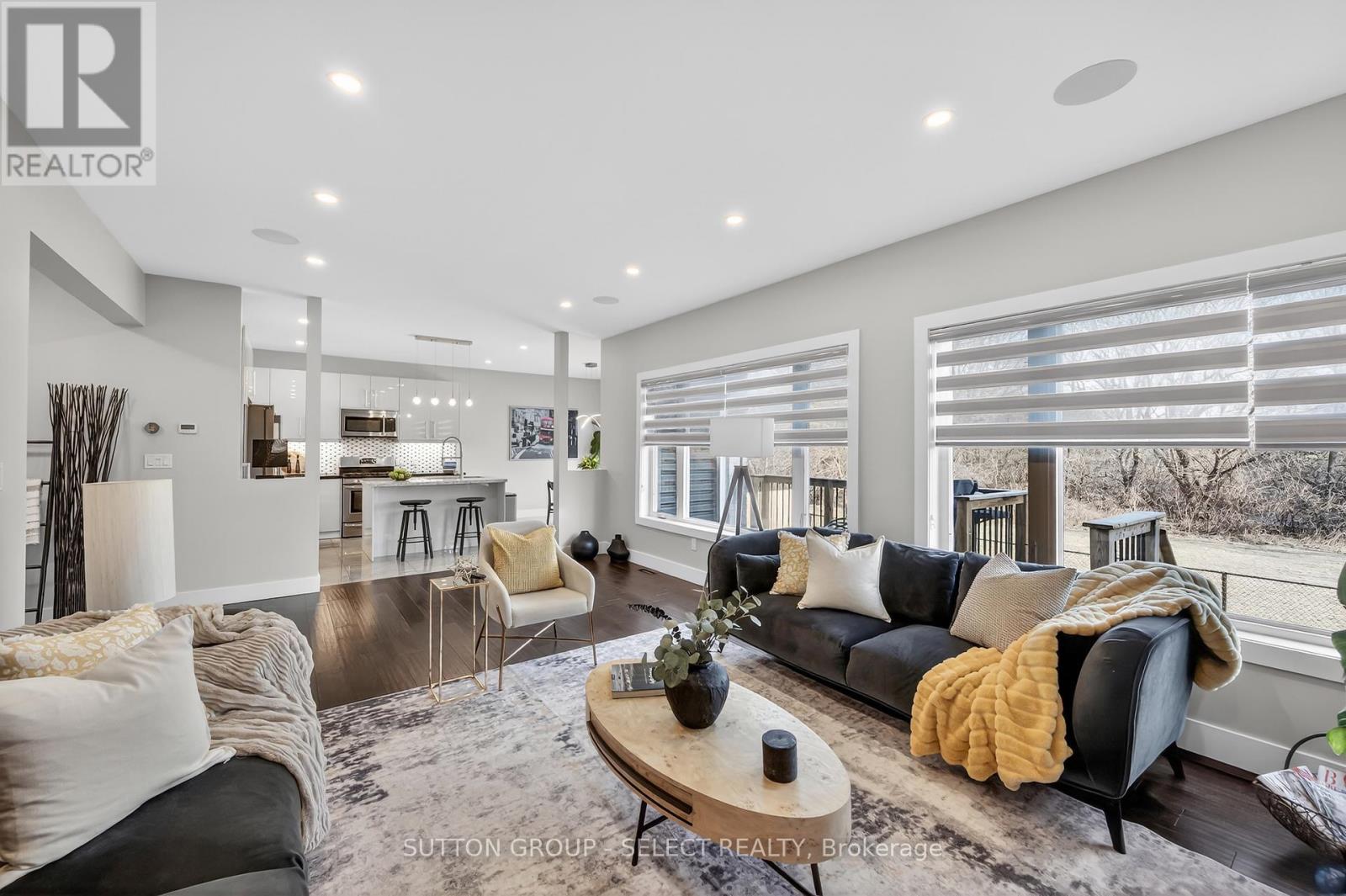 Welcome Home at the impressive 211 Union Avenue in quiet Komoka backing onto a green space. Modern and striking curb appeal stands apart with its deep hues, interlock brick drive, stone & stucco facade, and double-door front entry. Step into the soaring two-storey foyer beautifully illuminated by cascading chandeliers. The main floor offers a designated office space, a living room with a central gas fireplace - framed by a feature wall w/ linear stone wall niches with down lighting - and a sunshine-filled chef's kitchen + dining space featuring premium stainless steel appliances, a contrast centre island, quartz and granite surfaces, upscale pendant lighting and gleaming cabinetry, all overlooking the maturity of the green space, step-down deck, & fully fenced yard. 9' ceiling heights and gleaming hardwood throughout the main floor principal living areas as well. Four spacious bedrooms upstairs including the Primary, which offers 2 walk-in closets and a spa inspired 5pc ensuite. 4pc common bath. The bright lower level offers an additional bedroom, recreation room, full bath, a wet-bar rough in, and plenty of storage. Painted in contemporary, neutral tones throughout. Design and stunning attention to detail throughout. Bright open spaces and elevated finishes. (id:64974)