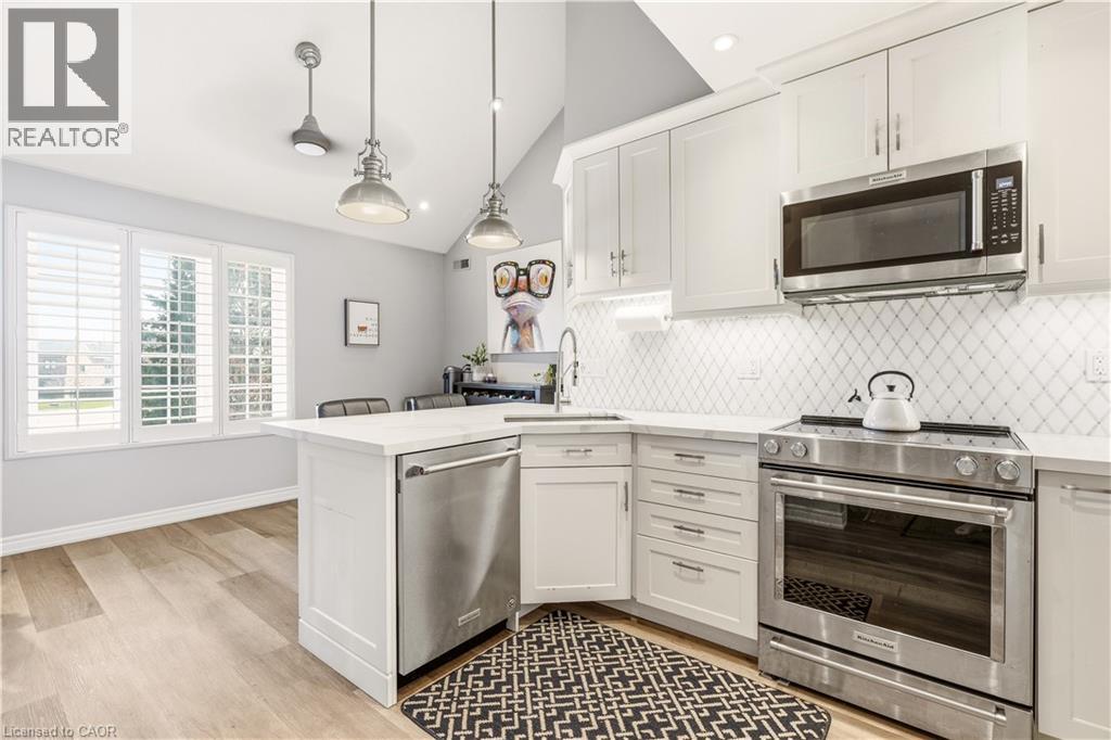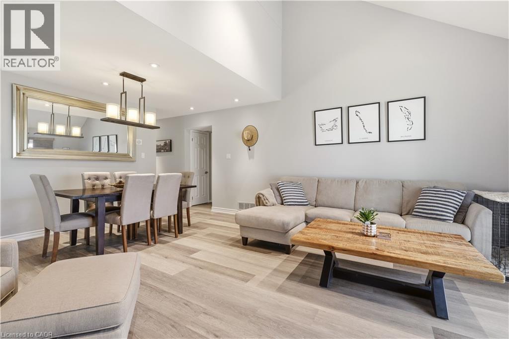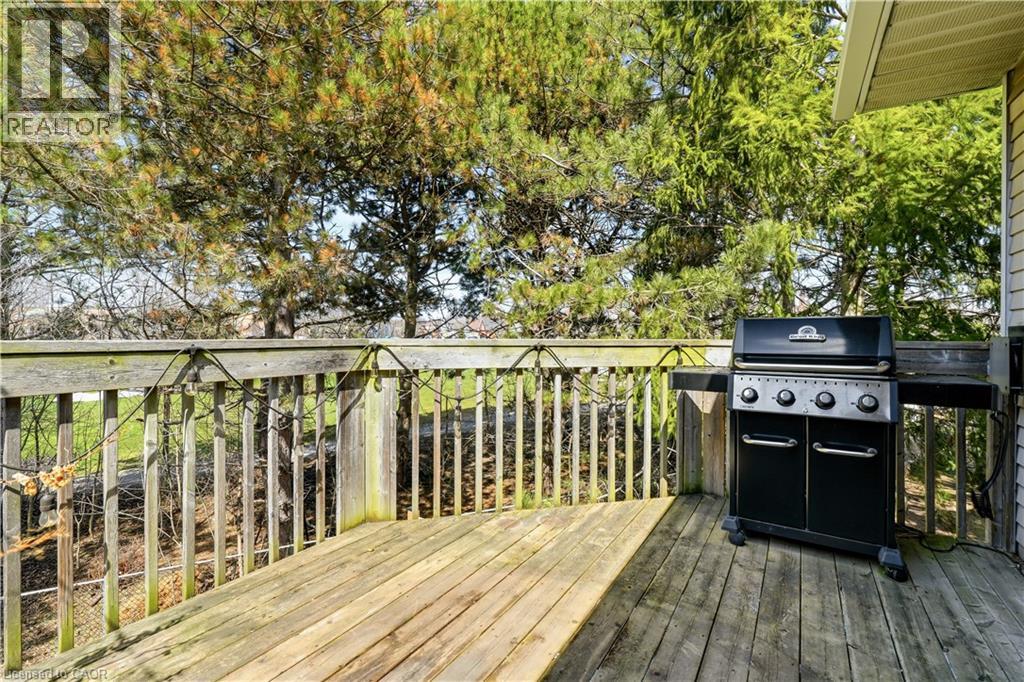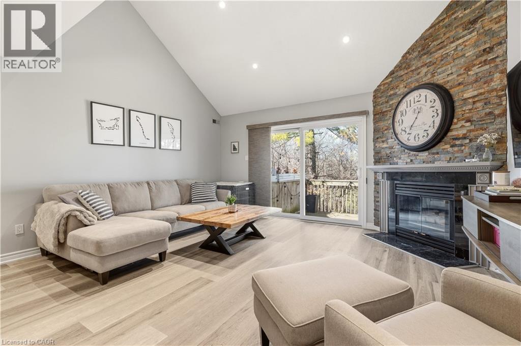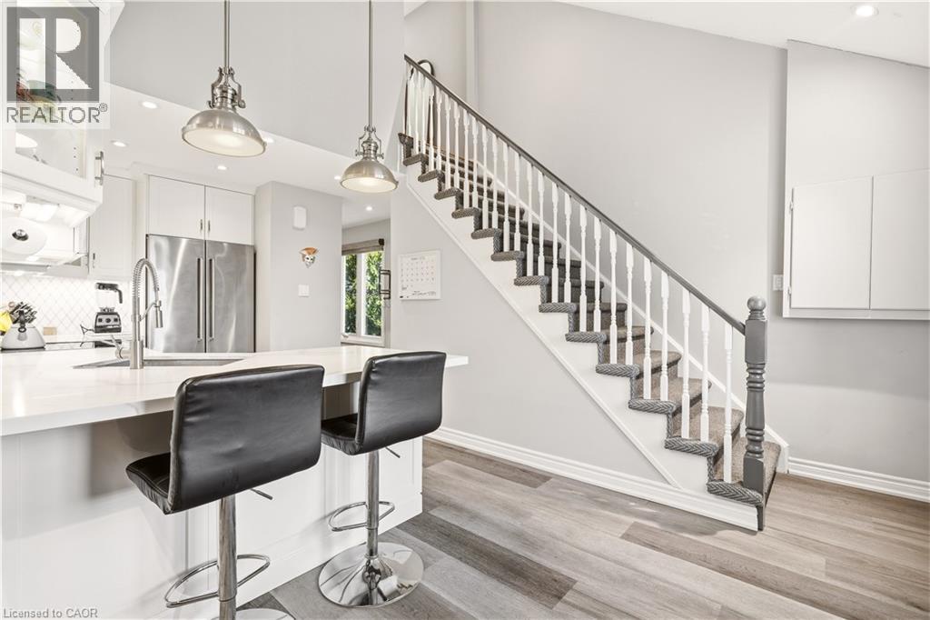 Welcome to this beautifully updated 3-bedroom, 2-bathroom end-unit townhouse in the highly sought-after Headon Forest neighbourhood of Burlington! This bright and stylish home features a newly renovated eat-in kitchen complete with quartz countertops and stainless steel appliances, offering both modern elegance and everyday functionality. The open-concept living and dining area boasts soaring vaulted ceilings and sliding door access to a private deck - perfect for BBQing and entertaining. You will find upgraded LED pot lights throughout the home, integrated with an automated smart lighting system controllable via mobile app and customizable settings. Enjoy the convenience of main floor laundry, along with two generously sized, sun-filled bedrooms and a well-appointed 4-piece bathroom on the main level. Upstairs, retreat to your own private primary suite, featuring a massive walk-in closet, juliette balcony, and a fully renovated ensuite with a luxurious soaker tub, heated floors and separate walk-in shower. Enjoy both a single car garage, as well as 1 outdoor parking space. As an end unit, this home offers added privacy and direct access to adjacent lawn space - ideal for kids to play - while backing onto Cleaver Park with playground and walking trails. Located just steps from shopping and restaurants, and easy access to highway access, this home combines comfort, style, and convenience. Don’t miss this incredible opportunity! (id:64974)