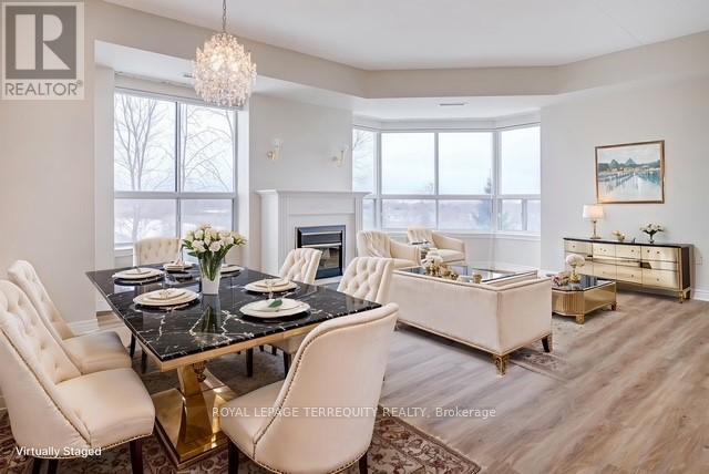 Bright & Spacious South-Facing Condo in the Heart of Burlington - Balmoral II. Welcome to Balmoral II, a highly desirable low-rise condominium community ideally located in the heart of Burlington. This south-facing 2-bedroom, 2-bathroom suite offers 1,428 sq. ft. of bright, open-concept living space with 9-foot ceilings and sunlight streaming in all day. The spacious living room features a coffered ceiling and a cozy fireplace, creating a warm and inviting atmosphere. The kitchen offers a walk-out to an open balcony, perfect for morning coffee or evening relaxation. The primary bedroom includes a Juliette balcony that lets in fresh air and natural light. You'll appreciate rich laminate flooring throughout, mirrored closets, and ample storage, including a full-size laundry room that doubles as a pantry. This unit also comes with in-suite laundry, underground parking, and a separate storage locker for added convenience. Residents of Balmoral II enjoy a wide range of amenities, including a party room with a kitchenette, library, fitness centre, hobby/workshop room, car wash bay, and a BBQ area with outdoor seating. EV charging stations are also available on site. Located just off Brant Street and Highway 407, this prime location offers easy access to shopping, dining, parks, and transit, perfect for commuters, downsizers, or anyone seeking a comfortable, carefree lifestyle in a well-maintained building. The fees cover heat, CAC, water, parking, locker, building insurance, and common elements. Owners pay their own hydro, internet, cable, etc. The unit is heated by a water heat pump. Don't miss your chance to own this bright and beautifully maintained condo in one of Burlington's most sought-after communities! (The unit cost is on $488.00 per square foot) (id:64974)