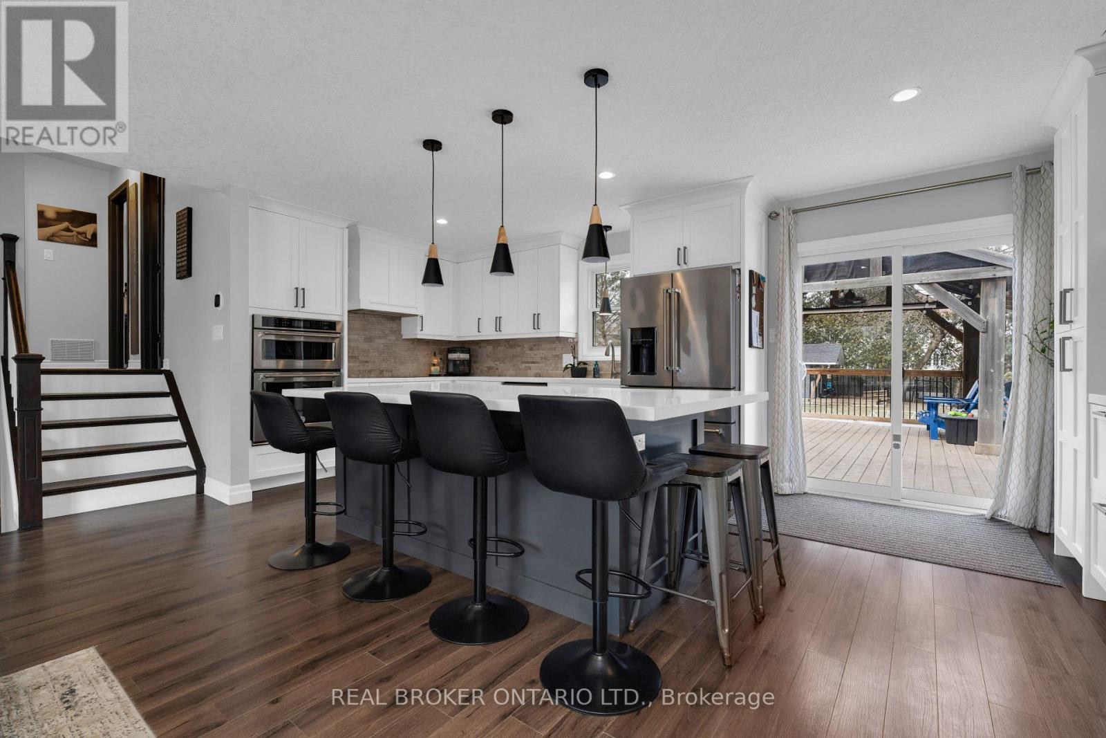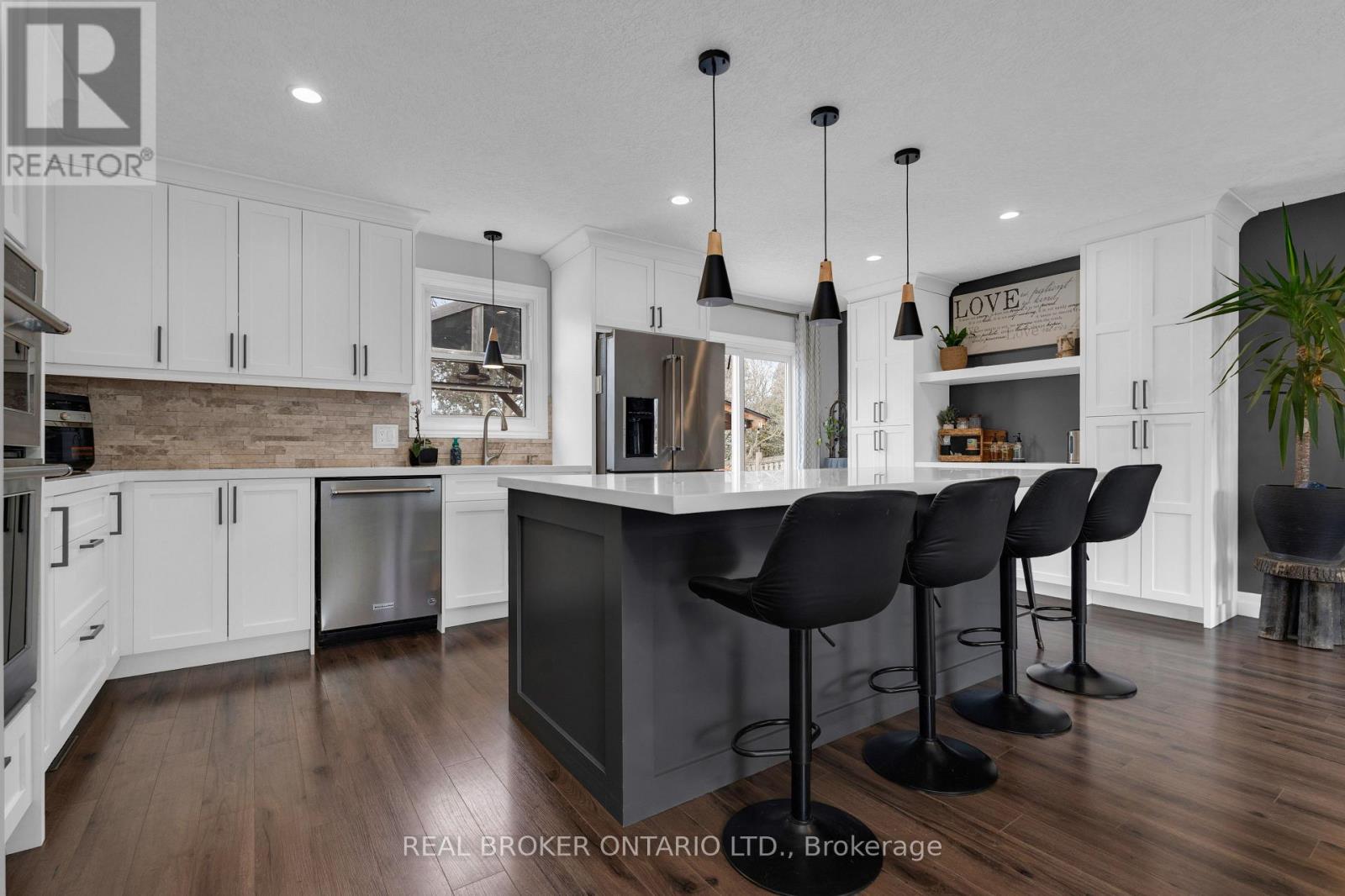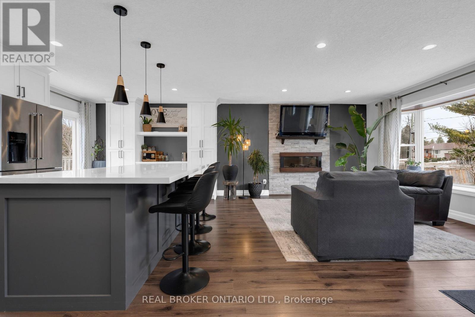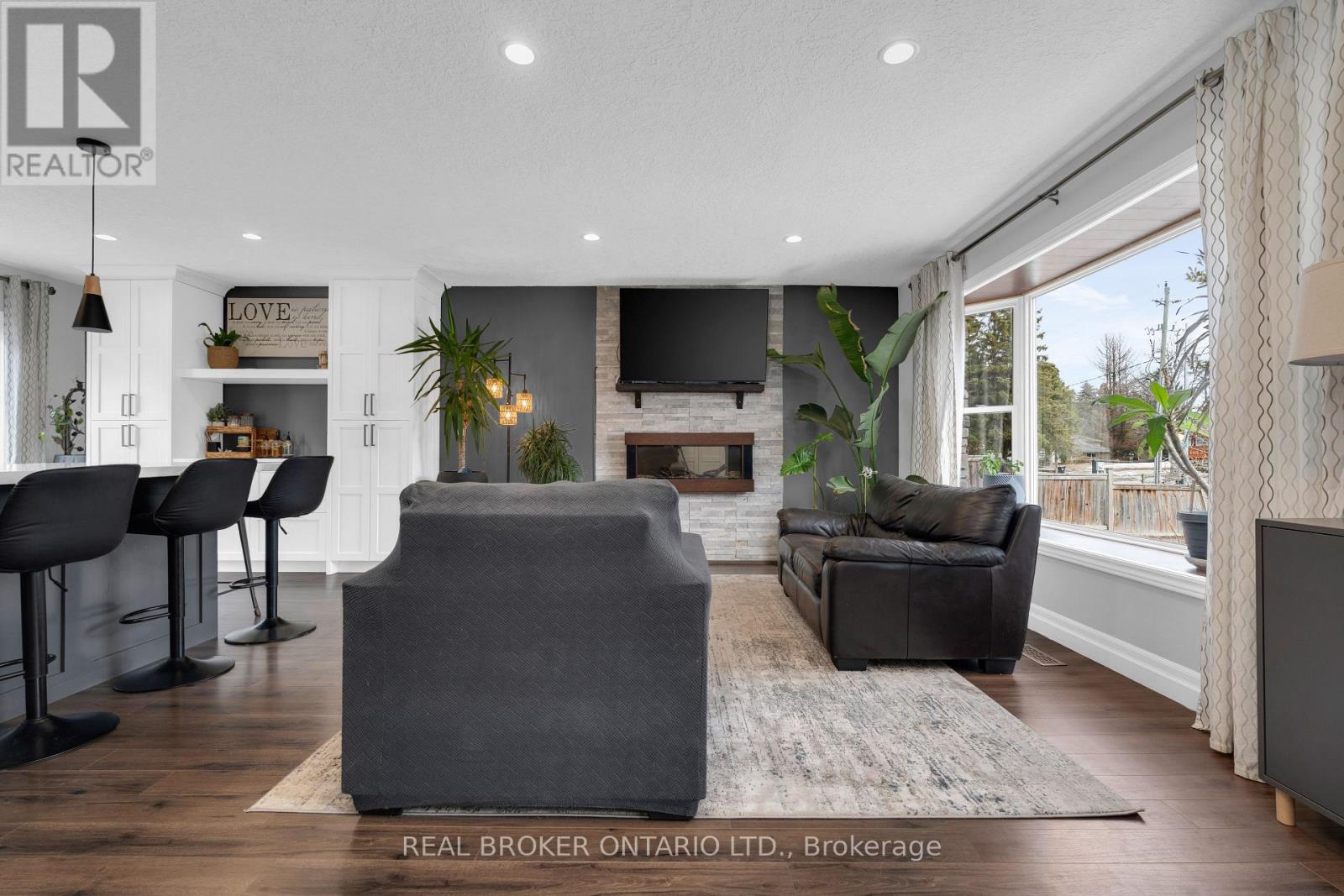 Pinch me I'm dreaming. This completely renovated 4 bedroom, 2 full bathroom home sits on a massive 227+ foot private lot with extensive decking, hot tub, and pool (liner to be installed 2026) in gorgeous backyard oasis. As you approach the home you will notice the massive driveway and lovely curb appeal with stone, updated siding and bright inviting bay window. Inside a massive open kitchen, living space with cozy gas fireplace, California knock down ceiling, pot lights, coffee bar, and island big enough to host the grandest of parties (with bar fridge) (kitchen 2019). Every chefs dream with wall oven, plus cook top, undermounted lighting, timeless pendants over island, stone backsplash, and quartz countertops. Through the sliding doors to the back deck with pergola, fully fenced yard, and back large bunky (24 x 12) with heat, roll up door and power. There is also a koi pond (4 ft deep) and plenty of room for all of the kids toys, oh and did I mention a pool change room? Back inside 3 spacious bedrooms upstairs with a full bathroom (renovated 2019 with stone countertop vanity). Downstairs the primary suite or an additional living room with 3-piece bathroom, laundry and storage space. Siding 2019, windows 2017, furnace 2015, ac 2015, on demand water heater (owned) 2015, basement macerator pump 2026, roof 2016, generlink (hooks into meter), plus inground sprinkler system with 16 heads and 4 zones, gas bbq hook up, 2 sheds plus back shop and car port, and large double gate for boats etc, power on deck to gazeebo/projection screen. Close to shopping, schools, rec centre and Base Borden (id:64974)