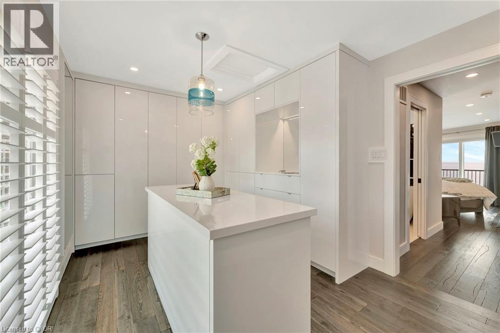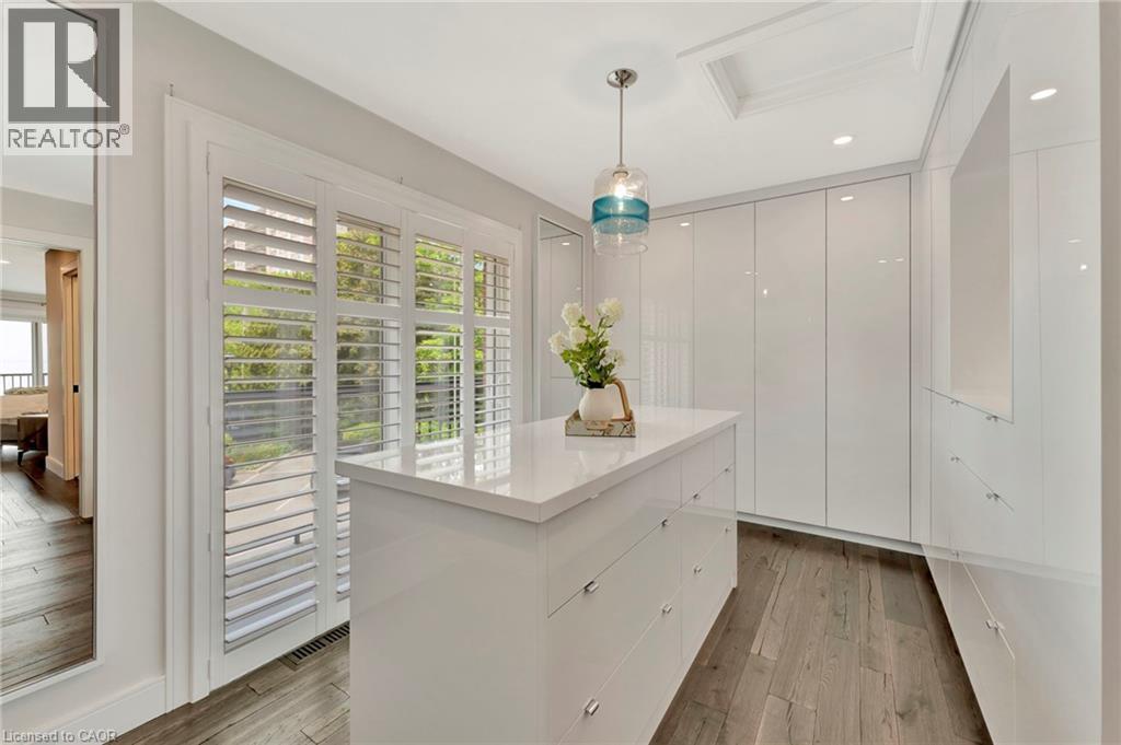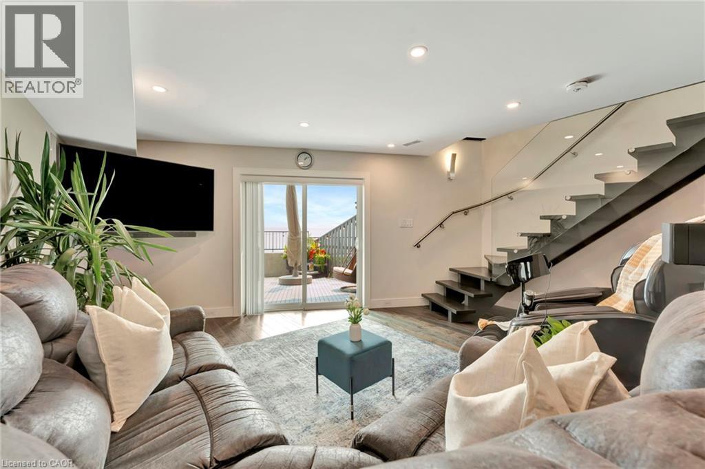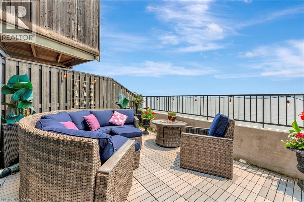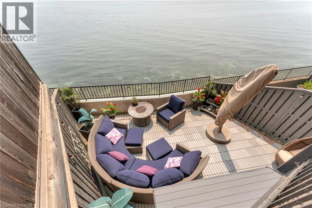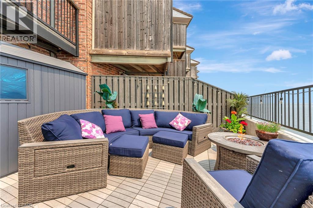 Welcome to the ultimate lakefront lifestyle. This fully renovated 3-level townhouse hass unobstructed, panoramic views of Lake Ontario so close to the water, you can practically dip your toes in. Located just 600 metres from downtown Burlington, this is a rare blend of tranquility and convenience. This 3-level townhouse (1,600 plus SF) has 1 bedrooms (potential for 2nd if you converted large walk-in closet back into a bedroom), 3 bathrooms (2 full, 1 powder) and 4 separate patio/terraces (huge 400 SF lower terrace at the water's edge). In 2020 this unit was completely gutted to the studs and rebuilt by the renowned Bespoke Home Solutions with a total renovation budget exceeding $500K . The gourmet kitchen has been masterfully crafted with designer finishes including: Insinkerator food waste disposal, hot water tank/dispenser, Porter & Charles warming drawer, Built in Miele Appliances (including a $7K plumbed in Coffee Machine), microwave/convection oven, Combi Steam Oven, Dacor Fridge & Freezer and Gravelle custom cabinetry throughout. The spacious primary suite is a true retreat, featuring a spa-inspired ensuite with heated floors, a two-person soaker tub, and a private balcony with stunning sunrise views over the lake. The second bedroom has been converted into a designer walk-in closet with custom cabinetry and a centre island (easily reverted to a bedroom if desired). Lower level family room has a full bathroom, ample storage and ability to have a guest suite with use of a murphy bed. Backwater valve in basement. Home is equipped with Sonos built in ceiling speakers with hooked up amplifiers and speaker selector options. Large 400 SF back terrace is fashioned with a BBQ gas line and has a hook up for a Hot Tub. (id:64974)