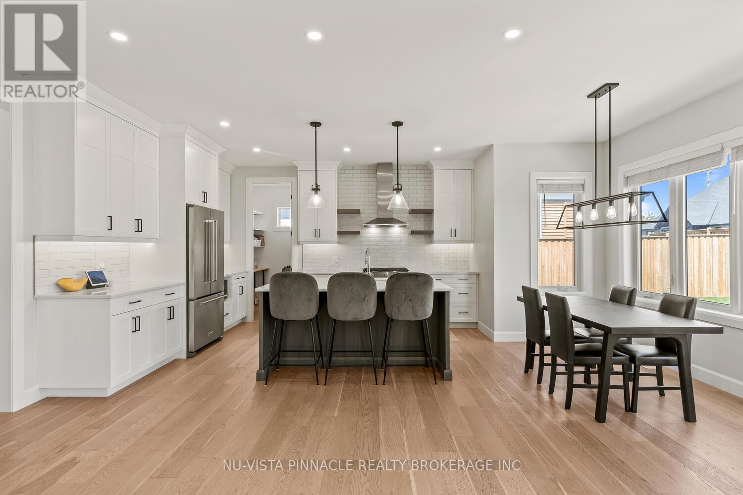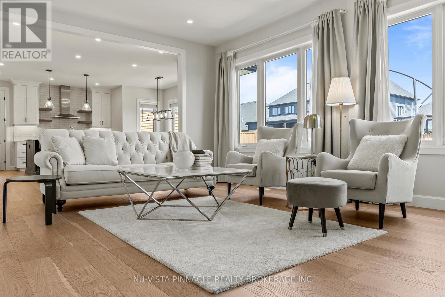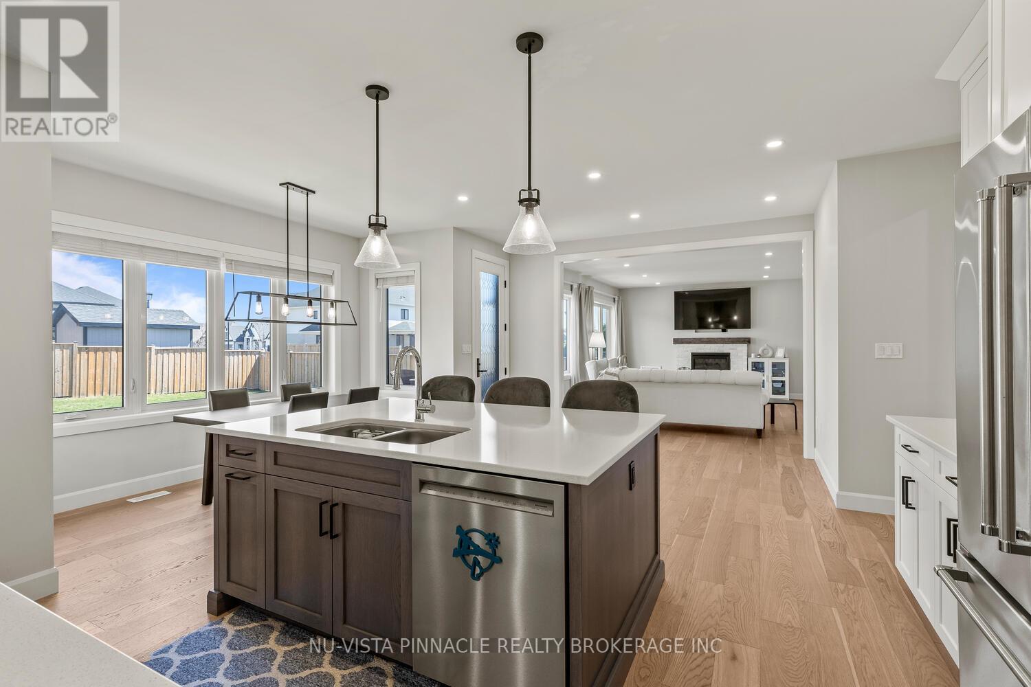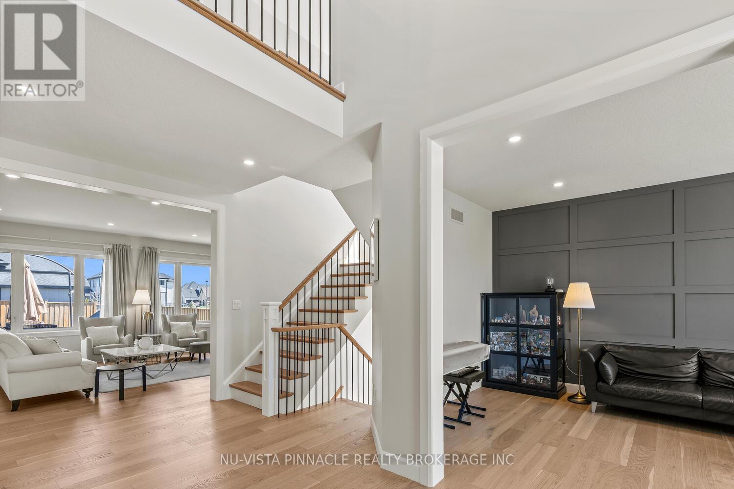 Prestigious Sunningdale West Wasko built home with over 3,300 sqft of immaculate living space with 9 foot ceilings. Meticulously crafted from the covered front porch, oversized front door, inviting open floor plan, engineered hardwood with extra large widows giving plenty of natural light. Office to the side for the executive with a unique accent wall. This home boasts the dream kitchen with extra tall cabinets to the ceiling, Silestone Quartz counter island 53"x76", crown moulding, back splash to the ceiling, high end appliances and a large walk in pantry. The dining room has a built in bar with a wine cooler for entertaining and complements with the family room with a centre point fireplace. The second floor has 4 bedrooms. Master bedroom with a walk in closet and a 5 pc ensuite, stand alone tub, custom made glass shower, and quartz vanity with dual sinks. Second large bedroom has a 3 pc ensuite. There are two more sizeable bedrooms. A 5 pc third bathroom on the second floor with quartz top. This home has the laundry on the second floor the perfect blend of comfort and functionality with quartz top and plenty of storage. Engineered hardwood on the stairs and the second floor hallway. Mudroom with a built in bench with more storage space. Extra wide hallway 46" from garage to kitchen. Additional 5'x19' of space in the garage for the gardening tools. The large enclosed backyard with oversized deck. Come and see the home to experience elegance and sophistication in every corner. Great home with walking distance to Sunningdale Golf and Country Club and a short distance to the beautiful Medway Valley Heritage Forest trails. (id:64974)