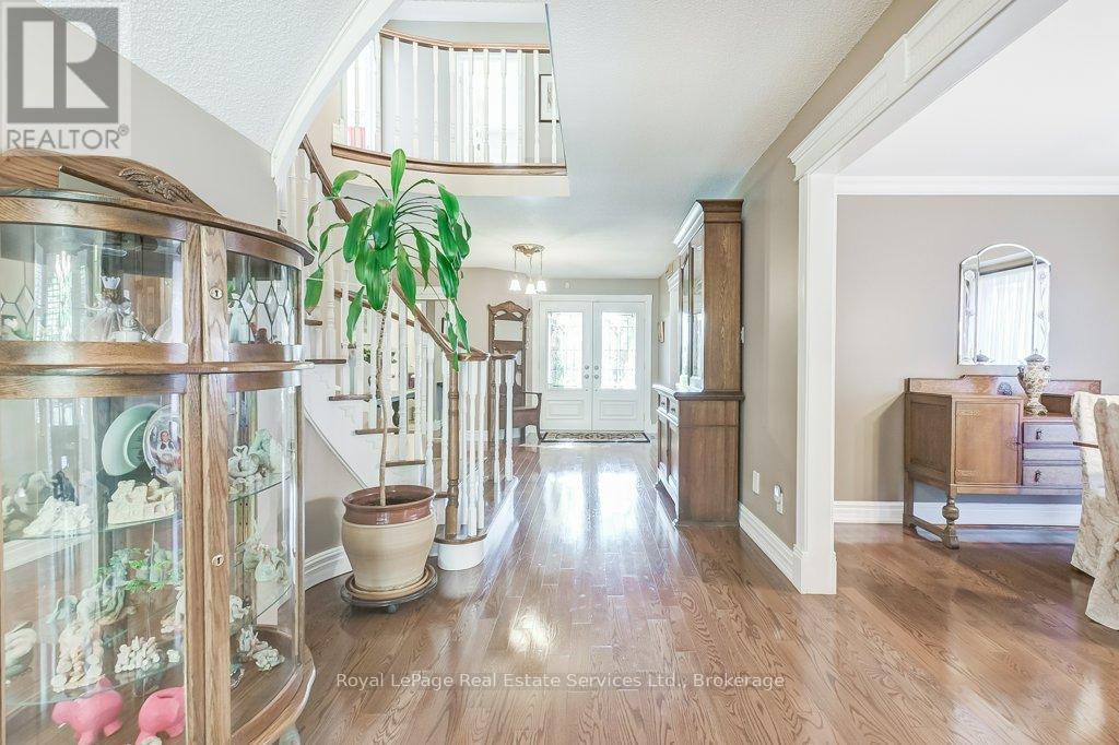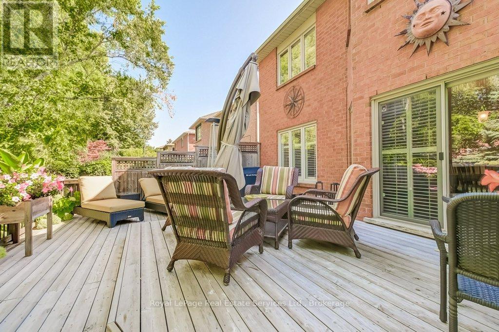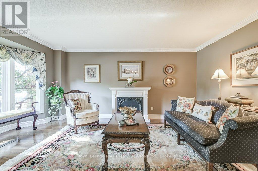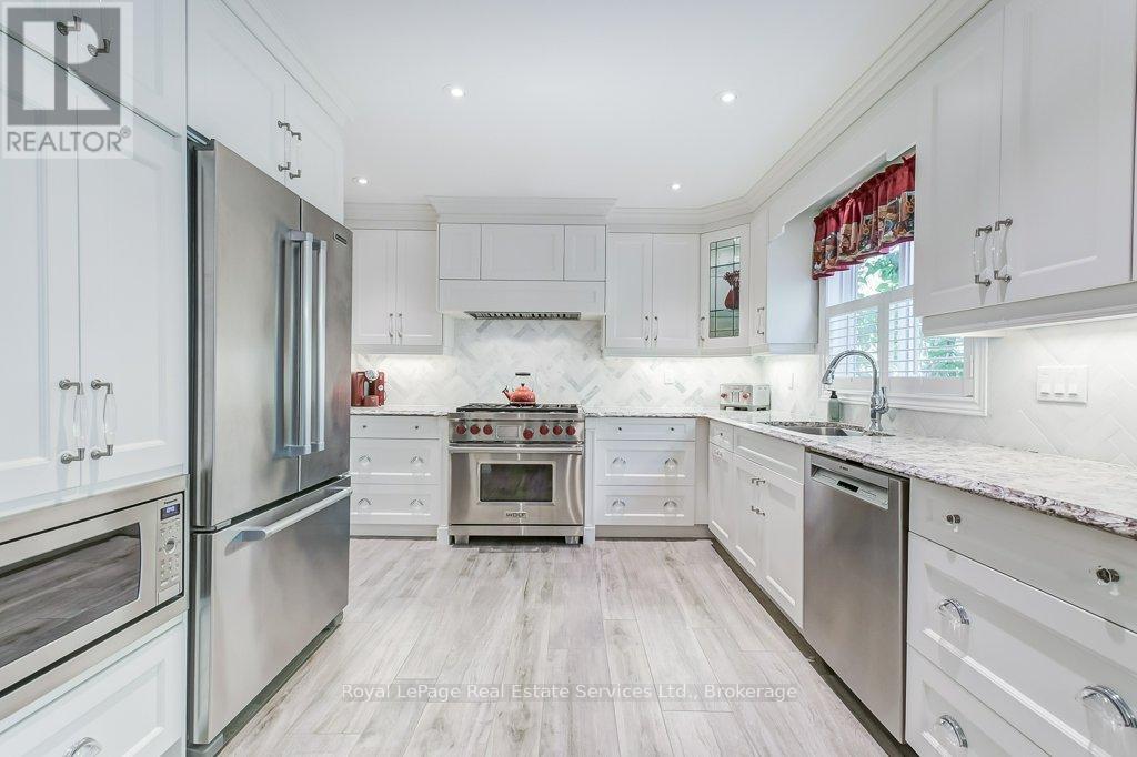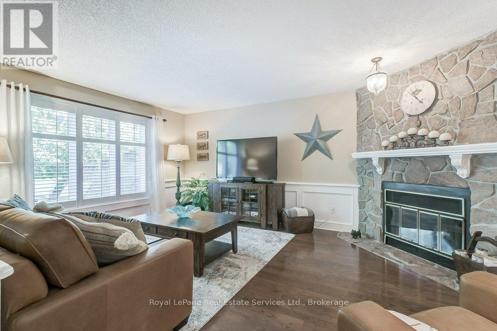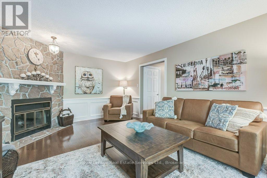 A wonderful family home located in the Brays Lane enclave of Glen Abbey. The Chamberlain by Mattamy homes, a sought after model of approx 3150 Sq Ft. A winding walkway leads to the custom double front doors and into the roomy Foyer. To the left is the Formal Living Room with electric fireplace and a bay window. The Dining Room is large enough for a full dining suite.The eat-in Kitchen has been completely renovated with high end appliances including a Wolf six (6) burner stove, custom backsplash, porcelain tile flooring and upgraded fixtures and cabinets. To the right of the Foyer is the Laundry Room, Powder Room and convenient Den or Office. There is a wood burning fireplace , large bright window and wainscotting in the main floor Family Room. Four Bedrooms on second floor, including a large Primary Bedroom with spacious 5 piece ensuite Bathroom, cosy sitting area and large organized walkin closet. All 4 bathrooms have been completely renovated. There are heated floors in the two upper Bathrooms.Solid oak floors throughout the main and second floors and engineered hardwood in basement. California shutters throughout. Upgraded wood trim throughout the home: six inch baseboards, crown moulding and door frames. Partially finished basement with spacious Recreation Room, exercise room and plenty of storage. New Carrier heat pump and furnace. The garage doors and Pollard windows and doors have been installed. Walkout from Kitchen to private fenced garden, two tiered cedar deck of almost 400 sq. ft., mature trees, manicured landscaping, garden shed and inground irrigation system. This home has been very well maintained and is in move in condition. Close access to schools, parks, trails, QEW and GO Train Station. (id:64974)