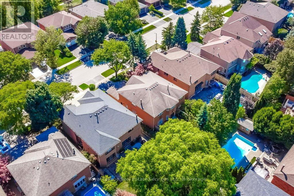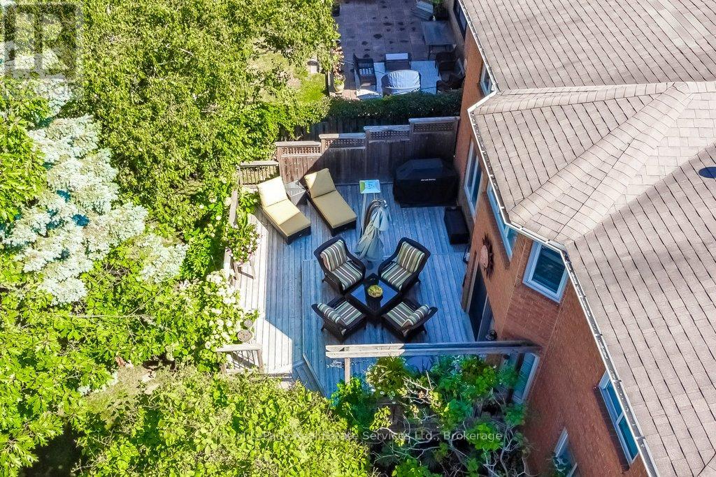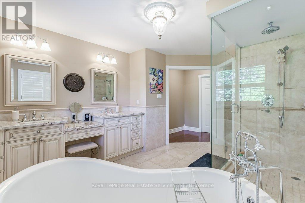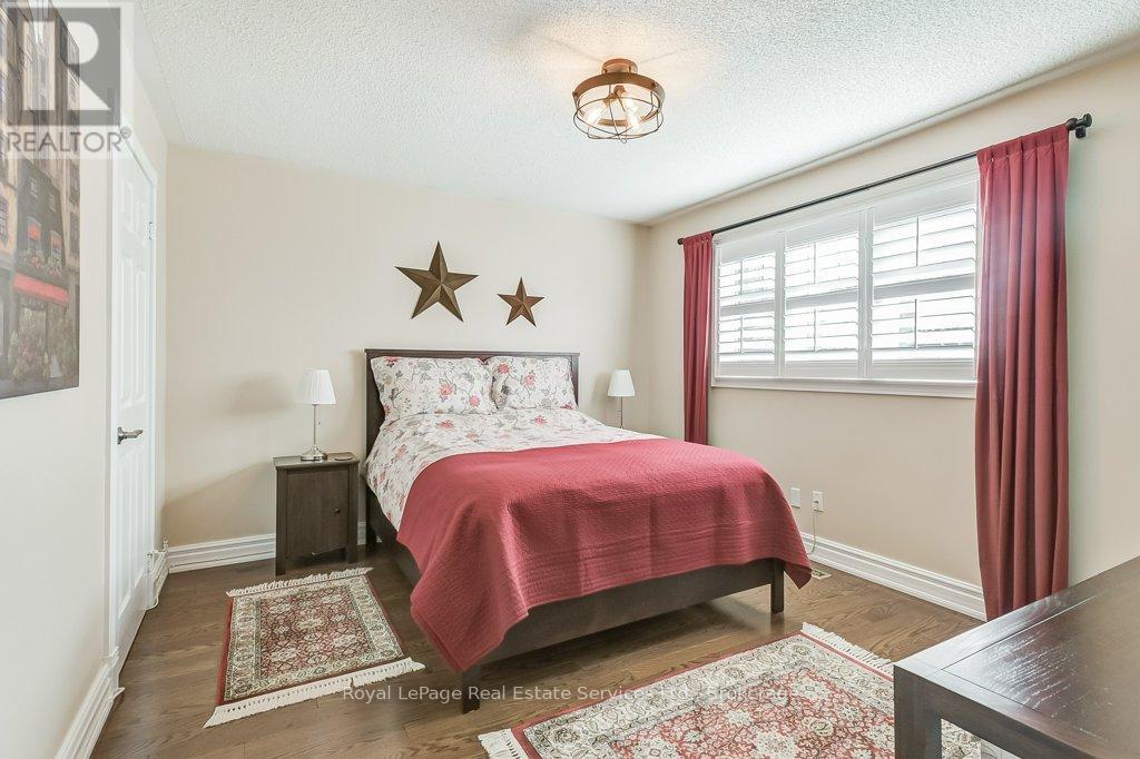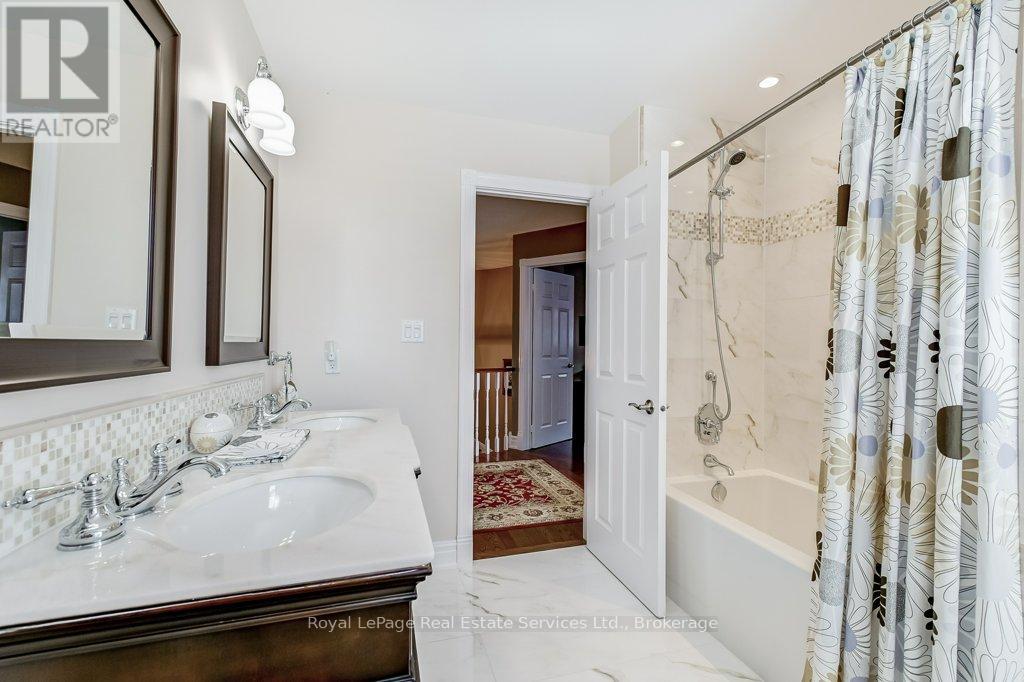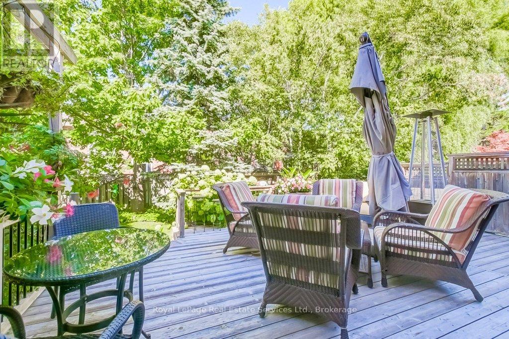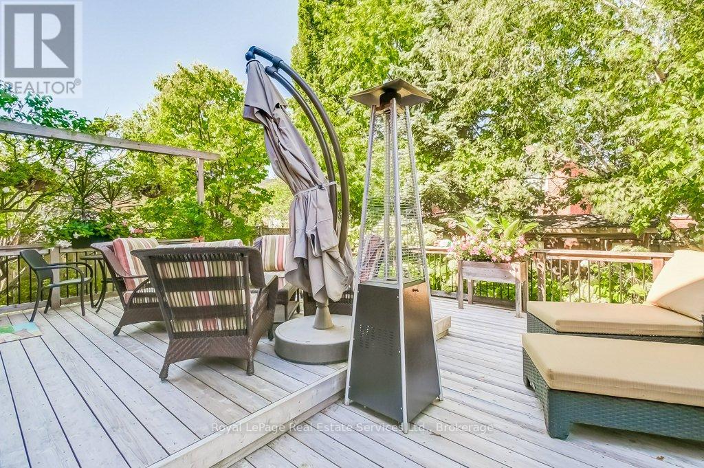 A wonderful family home located in the Brays Lane enclave of Glen Abbey. The Chamberlain by Mattamy homes, a sought after model of approx 3150 Sq Ft. A winding walkway leads to the custom double front doors and into the roomy Foyer. To the left is the Formal Living Room with electric fireplace and a bay window. The Dining Room is large enough for a full dining suite.The eat-in Kitchen has been completely renovated with high end appliances including a Wolf six (6) burner stove, custom backsplash, porcelain tile flooring and upgraded fixtures and cabinets. To the right of the Foyer is the Laundry Room, Powder Room and convenient Den or Office. There is a wood burning fireplace , large bright window and wainscotting in the main floor Family Room. Four Bedrooms on second floor, including a large Primary Bedroom with spacious 5 piece ensuite Bathroom, cosy sitting area and large organized walkin closet. All 4 bathrooms have been completely renovated. There are heated floors in the two upper Bathrooms.Solid oak floors throughout the main and second floors and engineered hardwood in basement. California shutters throughout. Upgraded wood trim throughout the home: six inch baseboards, crown moulding and door frames. Partially finished basement with spacious Recreation Room, exercise room and plenty of storage. New Carrier heat pump and furnace. The garage doors and Pollard windows and doors have been installed. Walkout from Kitchen to private fenced garden, two tiered cedar deck of almost 400 sq. ft., mature trees, manicured landscaping, garden shed and inground irrigation system. This home has been very well maintained and is in move in condition. Close access to schools, parks, trails, QEW and GO Train Station. (id:64974)