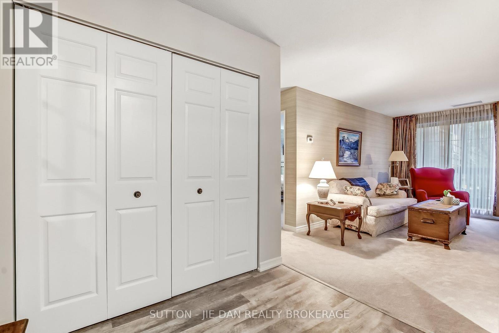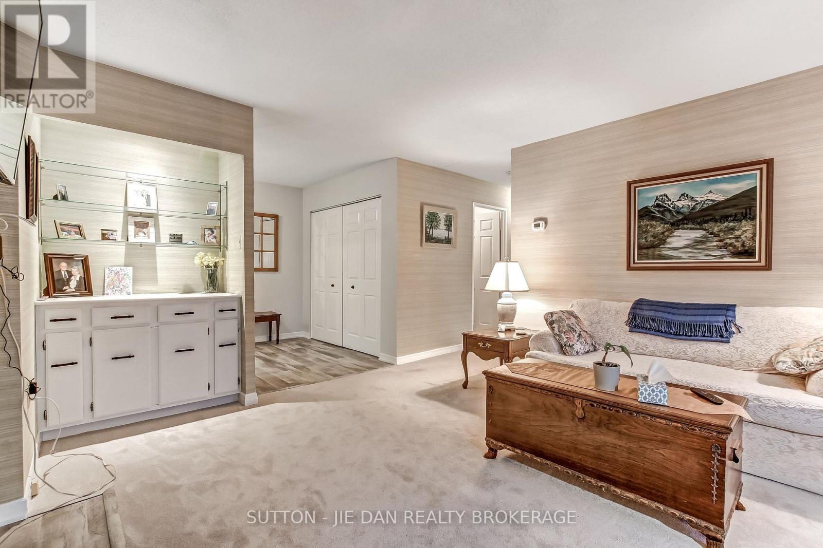 This exceptional south-facing 2-bedroom, 2 full bathroom Oakridge lifestyle condo offers the perfect blend of prime location and solid, quality construction. Ideally situated near golf courses, shopping, scenic river trails, and the highly desirable Byron area - all within a safe, well-built, and professionally maintained building. Step inside to a welcoming foyer with a large closet, leading to an eat-in kitchen featuring abundant cabinetry and generous counter space. The spacious living room is perfect for entertaining, complete with a gas fireplace and built-in bar, while the separate dining area adds a touch of elegance for formal occasions. Enjoy your own private retreat in the screened-in porch.The large primary bedroom offers a 4-piece ensuite and multiple closets, complemented by a second bedroom and additional 3-piece bathroom. Additional features include in-suite laundry, storage, underground parking, and a locker.Even better, the condo fees cover heat, hydro, gas, and water - offering true convenience and value.Located in one of the city's most desirable communities and set within a strong, well-managed building, this is a rare opportunity. Well maintained, perfectly located - ready for you to move in and enjoy. (id:64974)