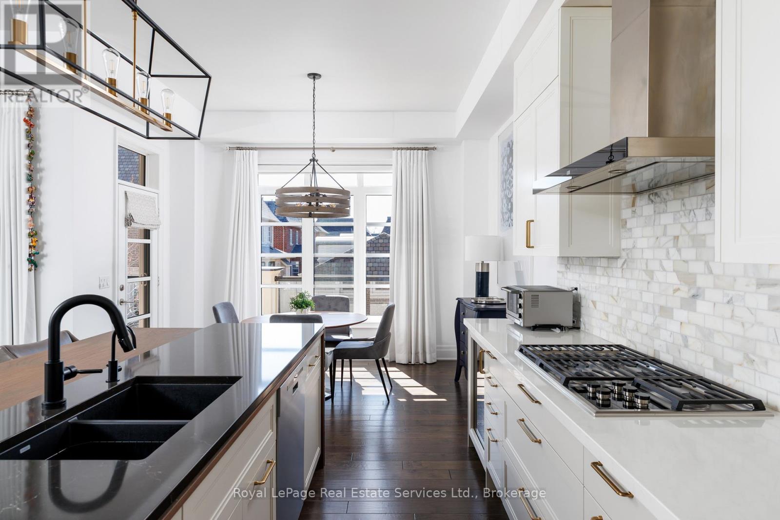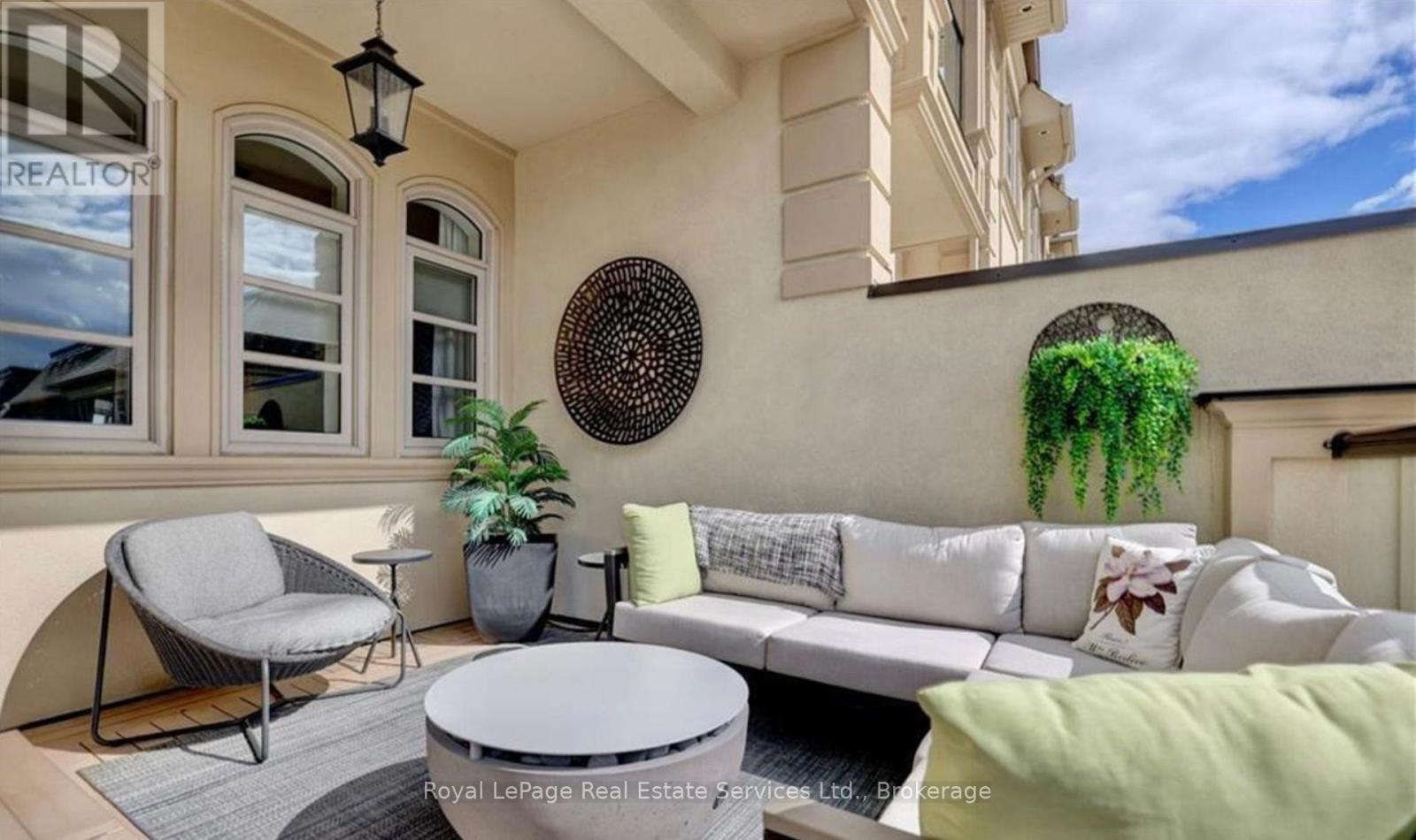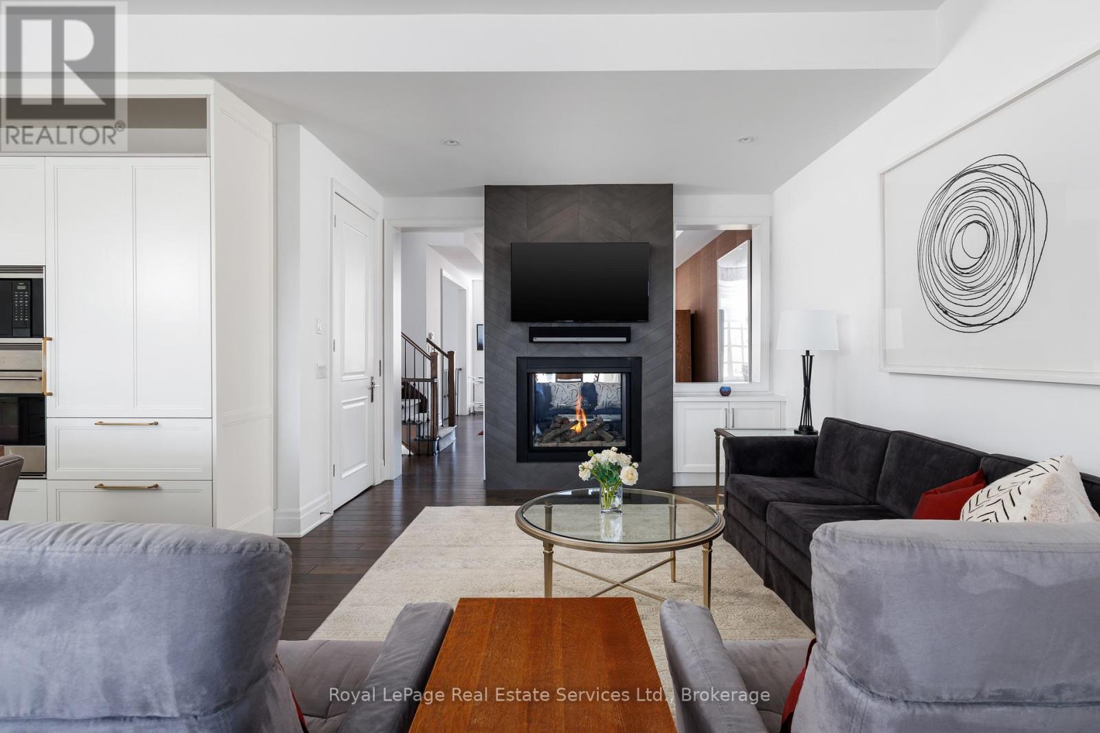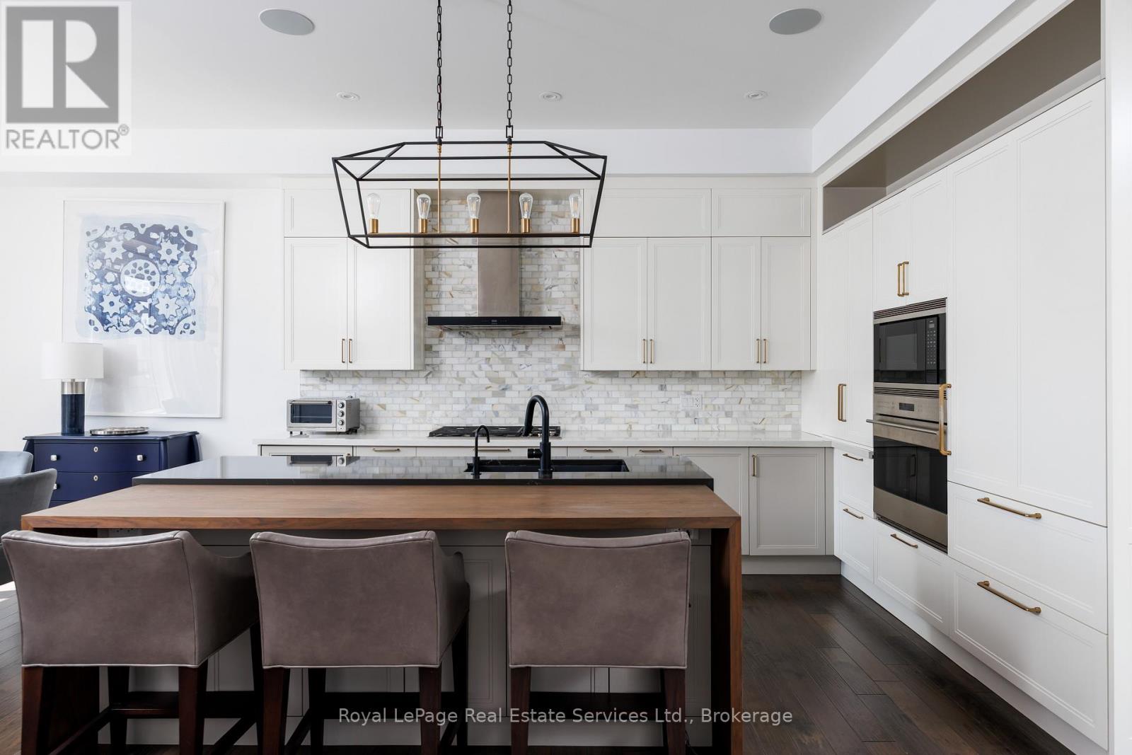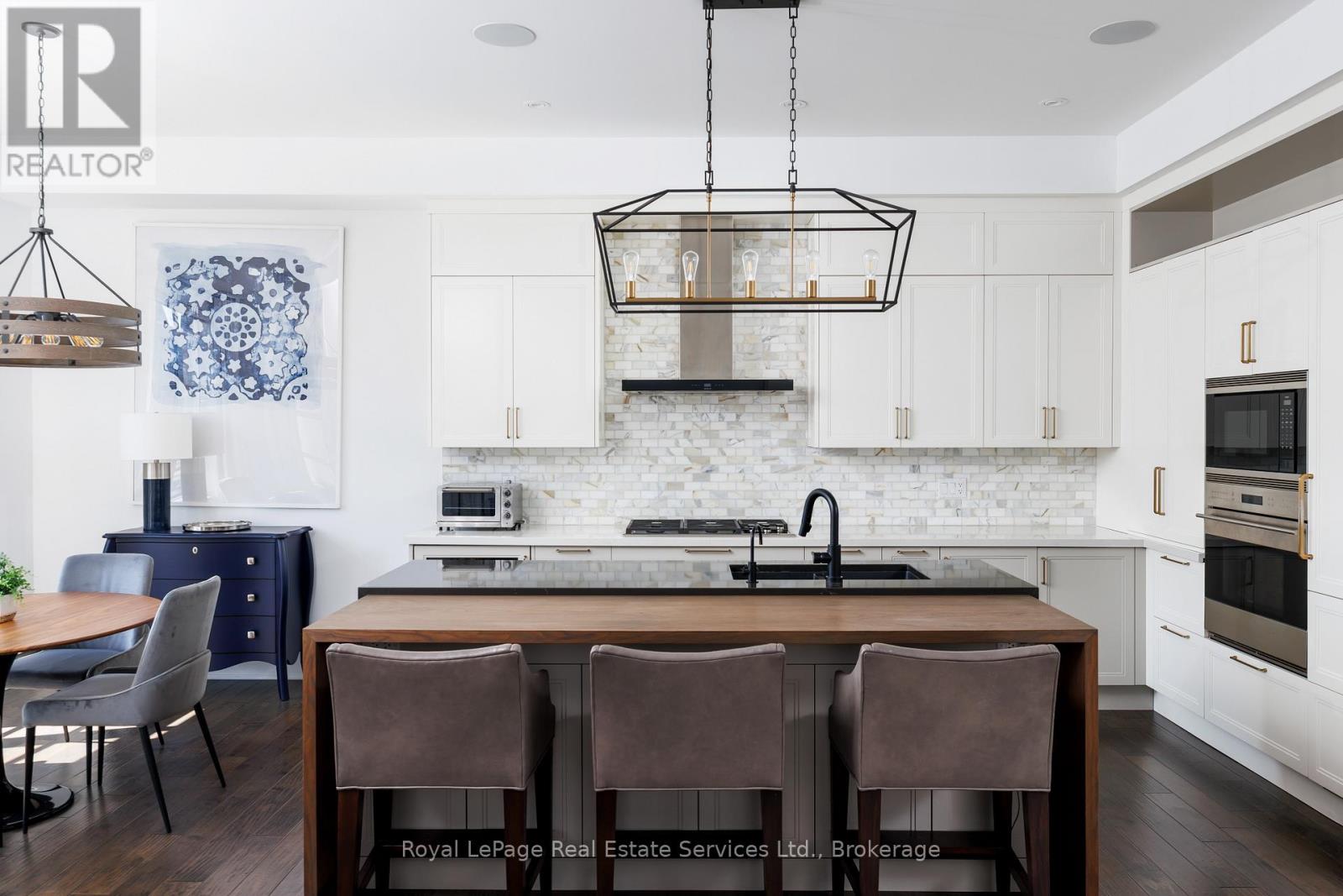 Exceptional End-Unit townhome in Oakville's prestigious Royal Oakville Club, where refined design meets effortless luxury living. Offering 4341 livable square feet, home elevator to all levels, custom finishes throughout, and sprawling rooftop terrace with sunny West Exposure, and one of the few townhomes in the development that doesn't back onto others. At the heart of the home is the stunning Downsview kitchen complete with a premium appliance package (Subzero fridge, wolf gas range, hood vent, wolf wall oven, built-in wolf microwave, bosch dishwasher), sleek cabinetry with custom organization, and an expansive layout designed with Cambria Quartz countertops with integrated walnut overhang for both everyday living and elegant entertaining. The principal spaces are enhanced by built-in speakers, Sonos sound system, 2-way gas fireplace, designer lighting, and walk-out to one of three outdoor terraces. The primary suite offers a 5-piece ensuite, walk-in closet, and private balcony to enjoy your morning coffee. The second level is complete with two further bedrooms with impressive vaulted-ceilings and a thoughtfully designed laundry room equipped with a built-in dishwasher, refrigerator, folding counter, laundry sink, and generous linen storage. Ground level features a fourth bedroom/home office with soundproof windows, sitting room, and spacious mudroom with second laundry, closet organizers, and access to the double car garage with epoxy flooring, EV charger, and central vacuum. Enjoy your evenings entertaining on the expansive third-level terrace with unobstructed views. Timeless in design and meticulously curated, this home caters to those seeking elevated finishes paired with effortless, low-maintenance living. Welcome Home (id:64974)