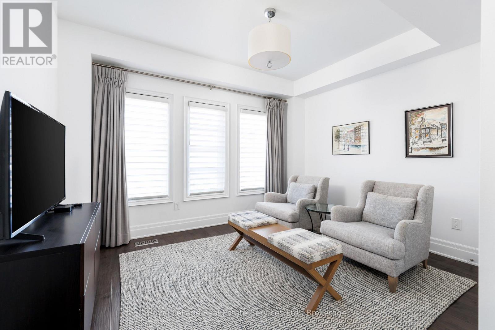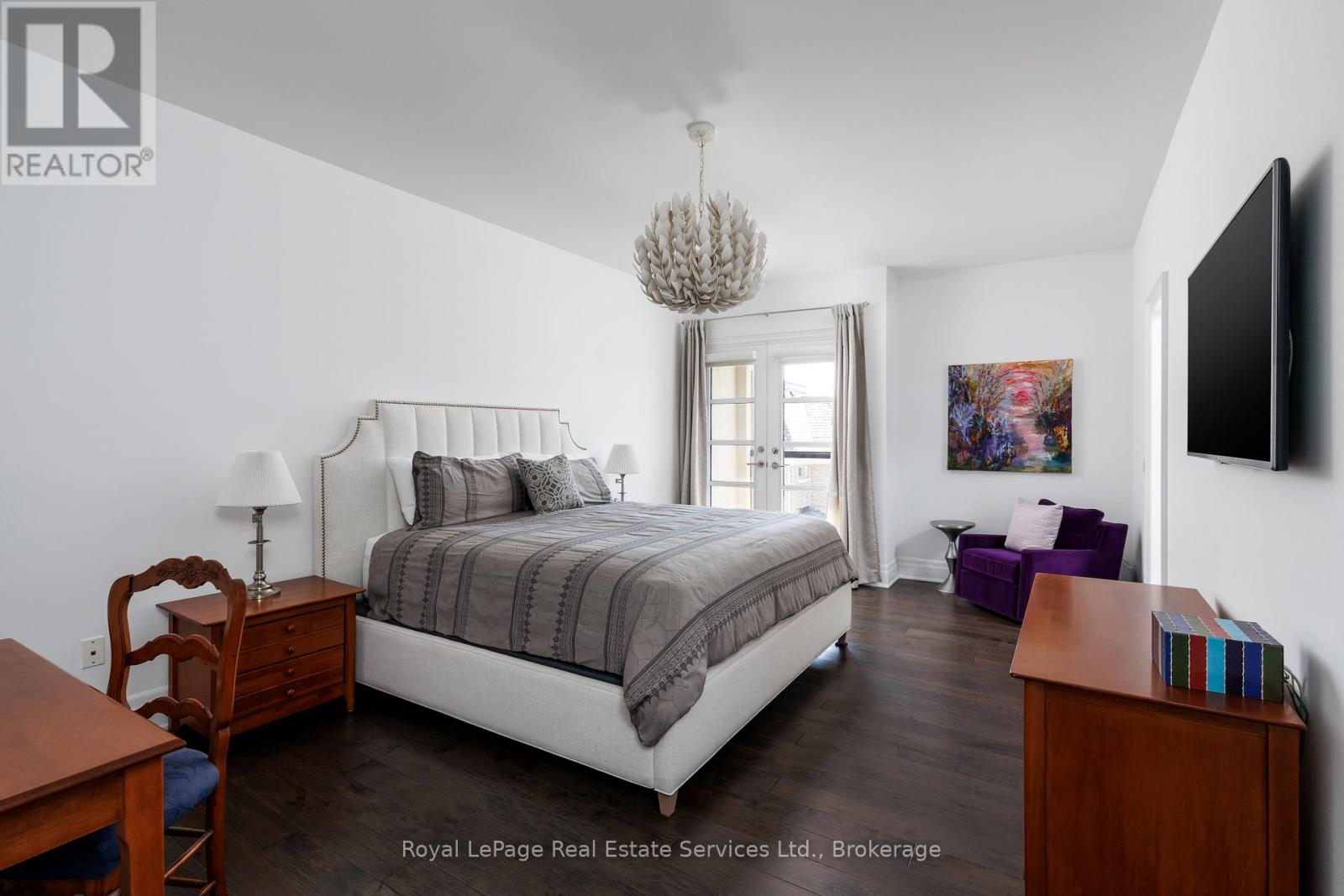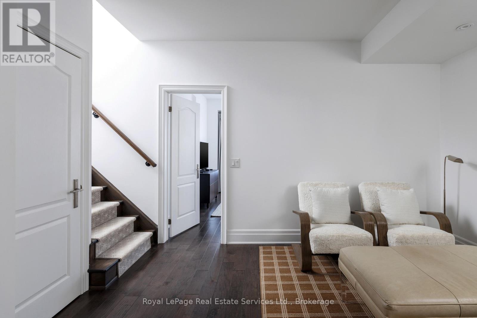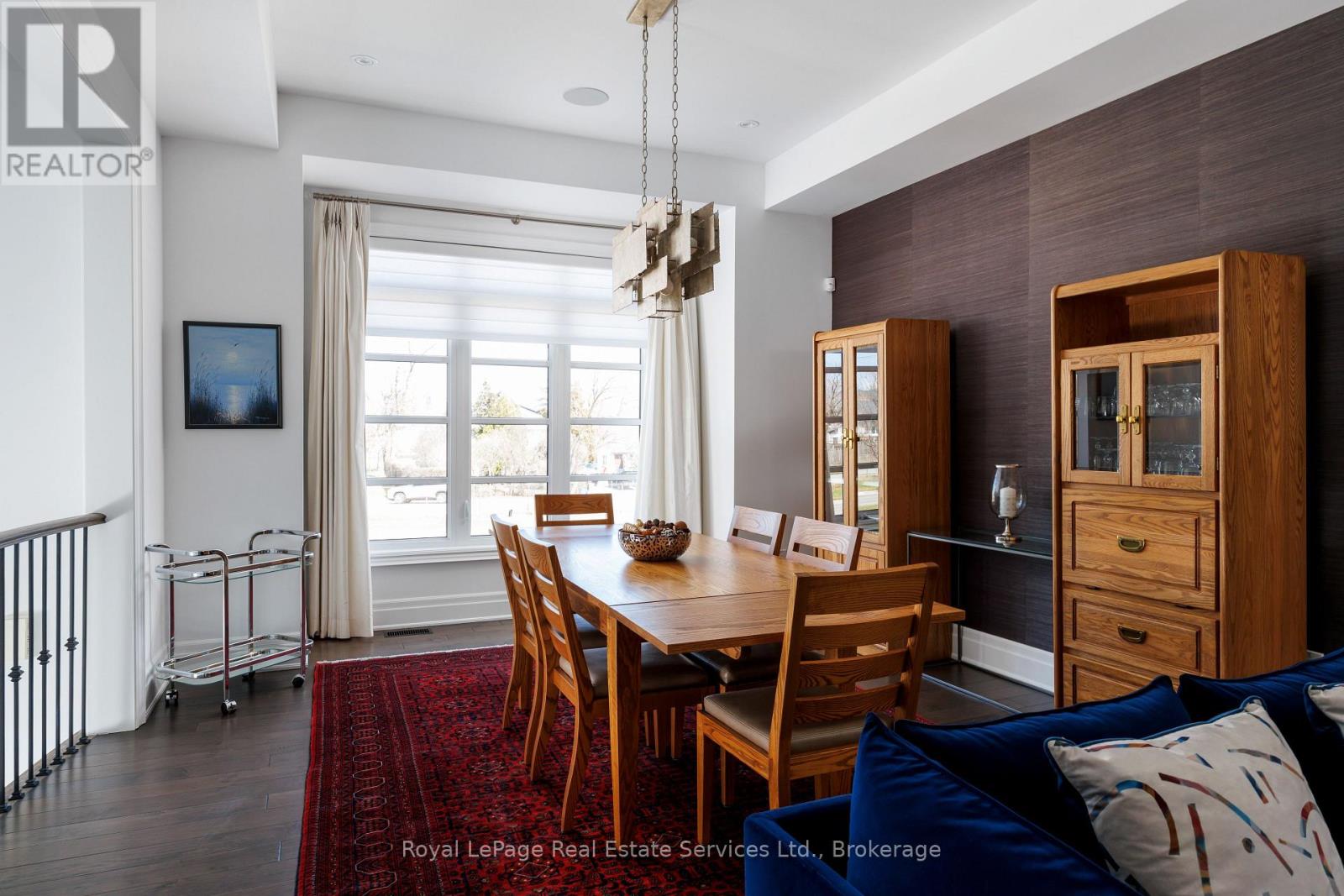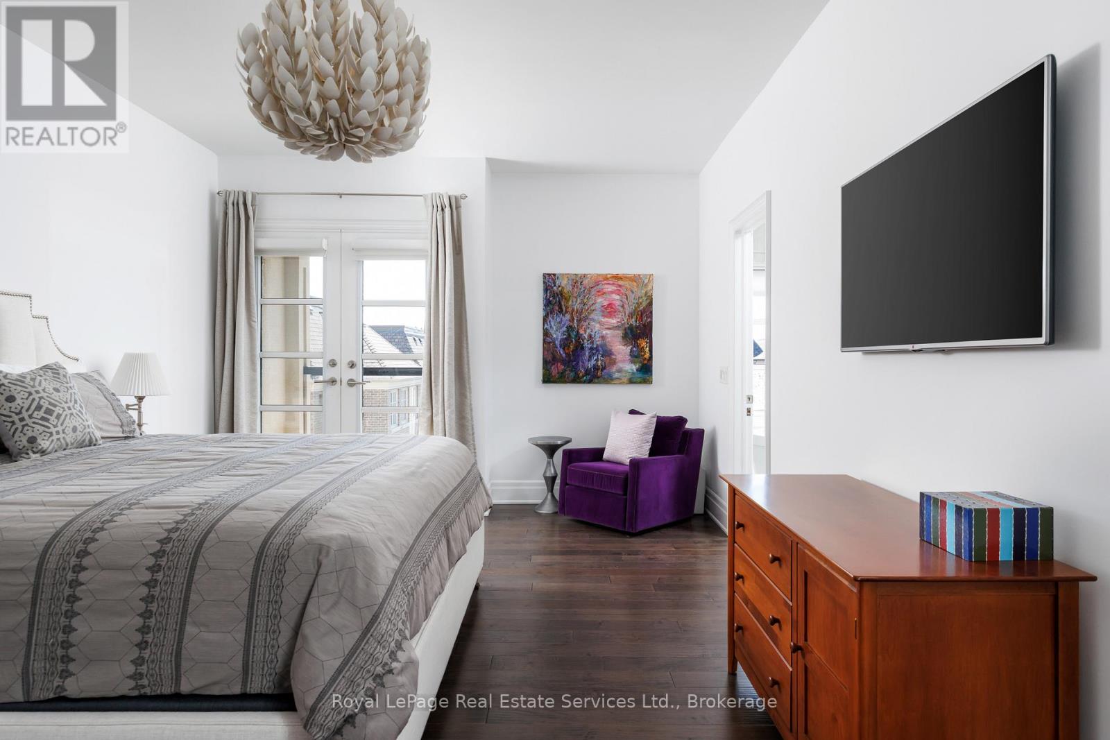 Exceptional End-Unit townhome in Oakville's prestigious Royal Oakville Club, where refined design meets effortless luxury living. Offering 4341 livable square feet, home elevator to all levels, custom finishes throughout, and sprawling rooftop terrace with sunny West Exposure, and one of the few townhomes in the development that doesn't back onto others. At the heart of the home is the stunning Downsview kitchen complete with a premium appliance package (Subzero fridge, wolf gas range, hood vent, wolf wall oven, built-in wolf microwave, bosch dishwasher), sleek cabinetry with custom organization, and an expansive layout designed with Cambria Quartz countertops with integrated walnut overhang for both everyday living and elegant entertaining. The principal spaces are enhanced by built-in speakers, Sonos sound system, 2-way gas fireplace, designer lighting, and walk-out to one of three outdoor terraces. The primary suite offers a 5-piece ensuite, walk-in closet, and private balcony to enjoy your morning coffee. The second level is complete with two further bedrooms with impressive vaulted-ceilings and a thoughtfully designed laundry room equipped with a built-in dishwasher, refrigerator, folding counter, laundry sink, and generous linen storage. Ground level features a fourth bedroom/home office with soundproof windows, sitting room, and spacious mudroom with second laundry, closet organizers, and access to the double car garage with epoxy flooring, EV charger, and central vacuum. Enjoy your evenings entertaining on the expansive third-level terrace with unobstructed views. Timeless in design and meticulously curated, this home caters to those seeking elevated finishes paired with effortless, low-maintenance living. Welcome Home (id:64974)