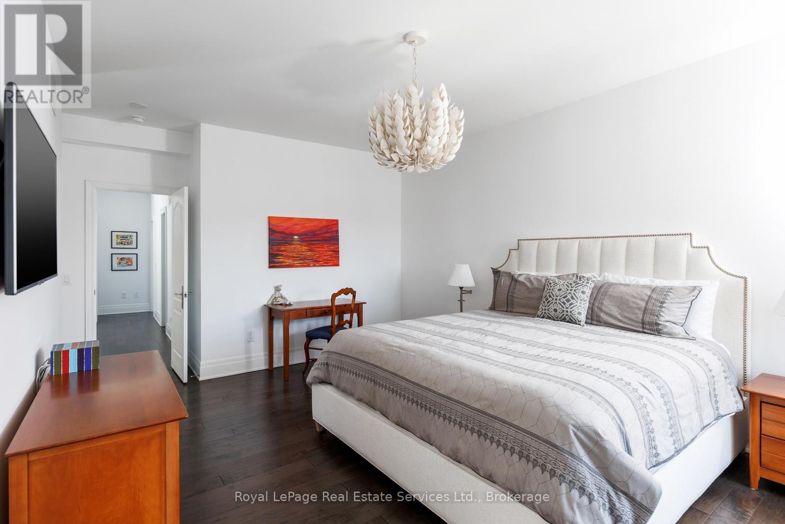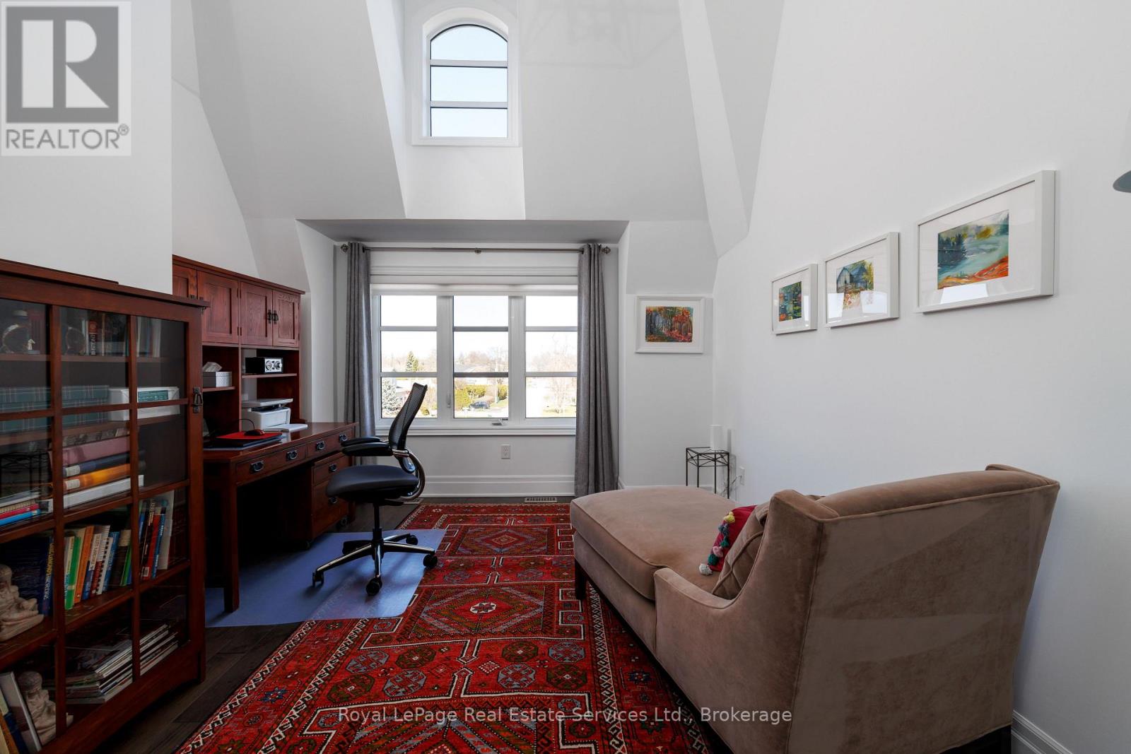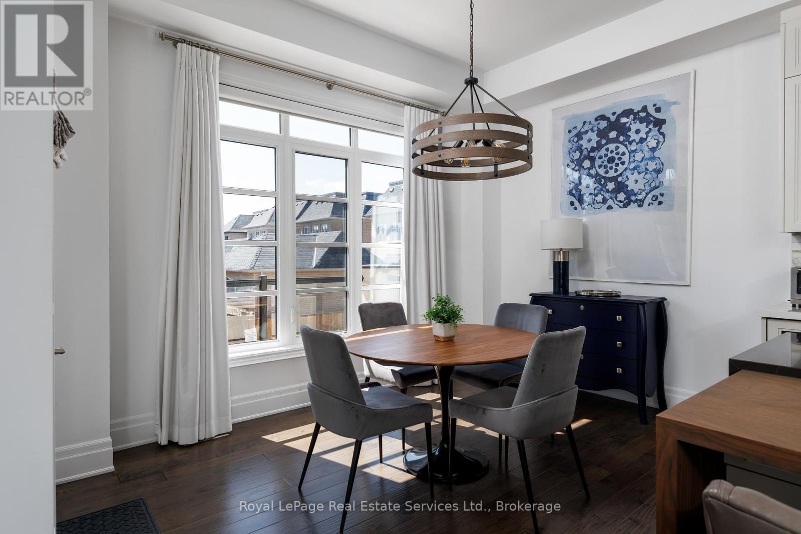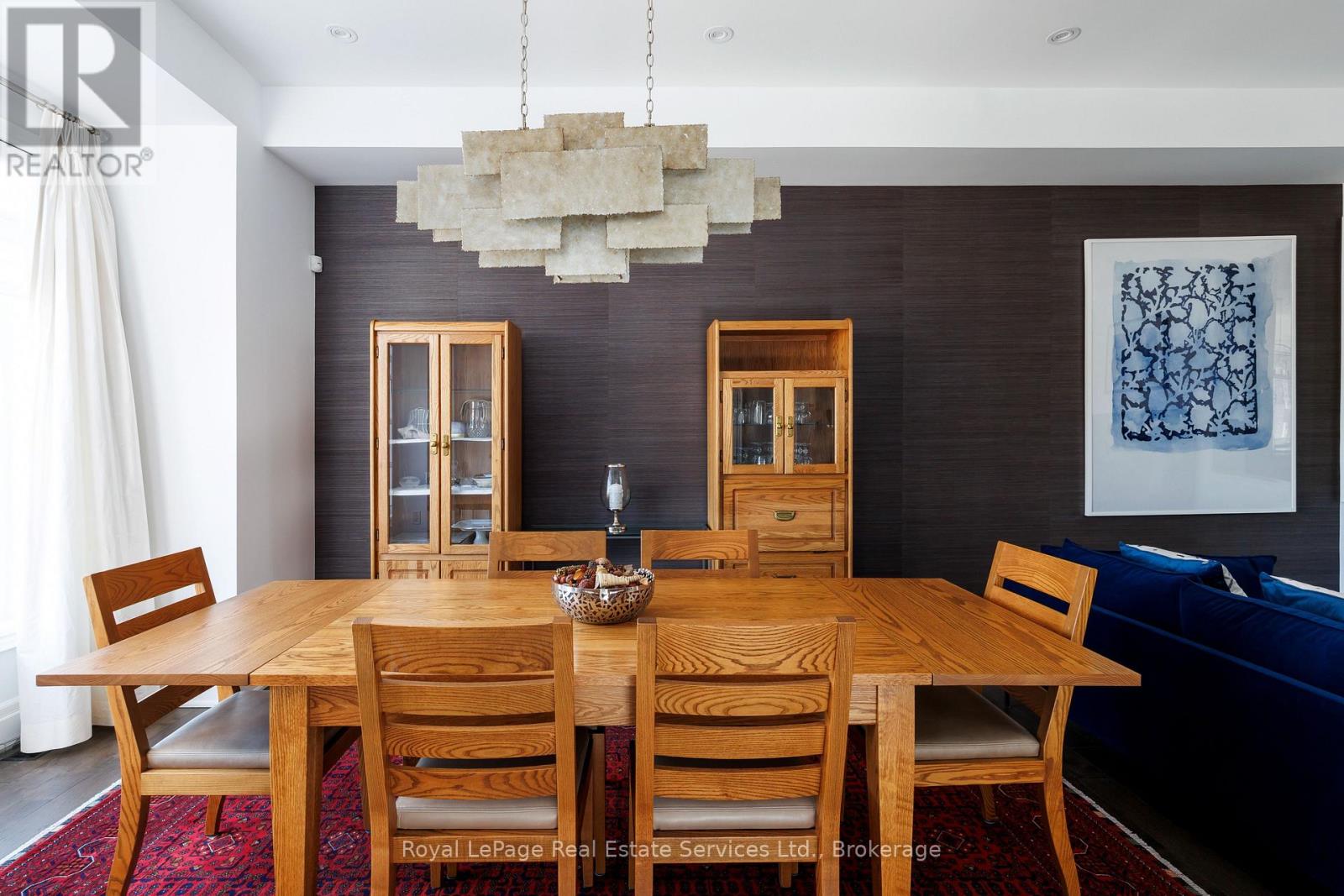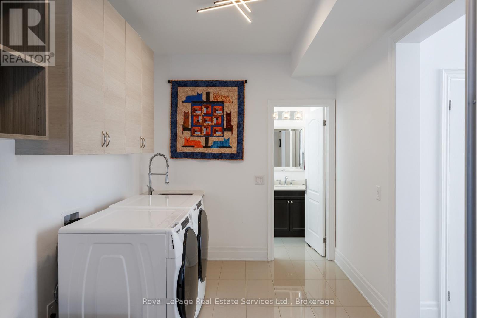 Exceptional End-Unit townhome in Oakville's prestigious Royal Oakville Club, where refined design meets effortless luxury living. Offering 4341 livable square feet, home elevator to all levels, custom finishes throughout, and sprawling rooftop terrace with sunny West Exposure, and one of the few townhomes in the development that doesn't back onto others. At the heart of the home is the stunning Downsview kitchen complete with a premium appliance package (Subzero fridge, wolf gas range, hood vent, wolf wall oven, built-in wolf microwave, bosch dishwasher), sleek cabinetry with custom organization, and an expansive layout designed with Cambria Quartz countertops with integrated walnut overhang for both everyday living and elegant entertaining. The principal spaces are enhanced by built-in speakers, Sonos sound system, 2-way gas fireplace, designer lighting, and walk-out to one of three outdoor terraces. The primary suite offers a 5-piece ensuite, walk-in closet, and private balcony to enjoy your morning coffee. The second level is complete with two further bedrooms with impressive vaulted-ceilings and a thoughtfully designed laundry room equipped with a built-in dishwasher, refrigerator, folding counter, laundry sink, and generous linen storage. Ground level features a fourth bedroom/home office with soundproof windows, sitting room, and spacious mudroom with second laundry, closet organizers, and access to the double car garage with epoxy flooring, EV charger, and central vacuum. Enjoy your evenings entertaining on the expansive third-level terrace with unobstructed views. Timeless in design and meticulously curated, this home caters to those seeking elevated finishes paired with effortless, low-maintenance living. Welcome Home (id:64974)