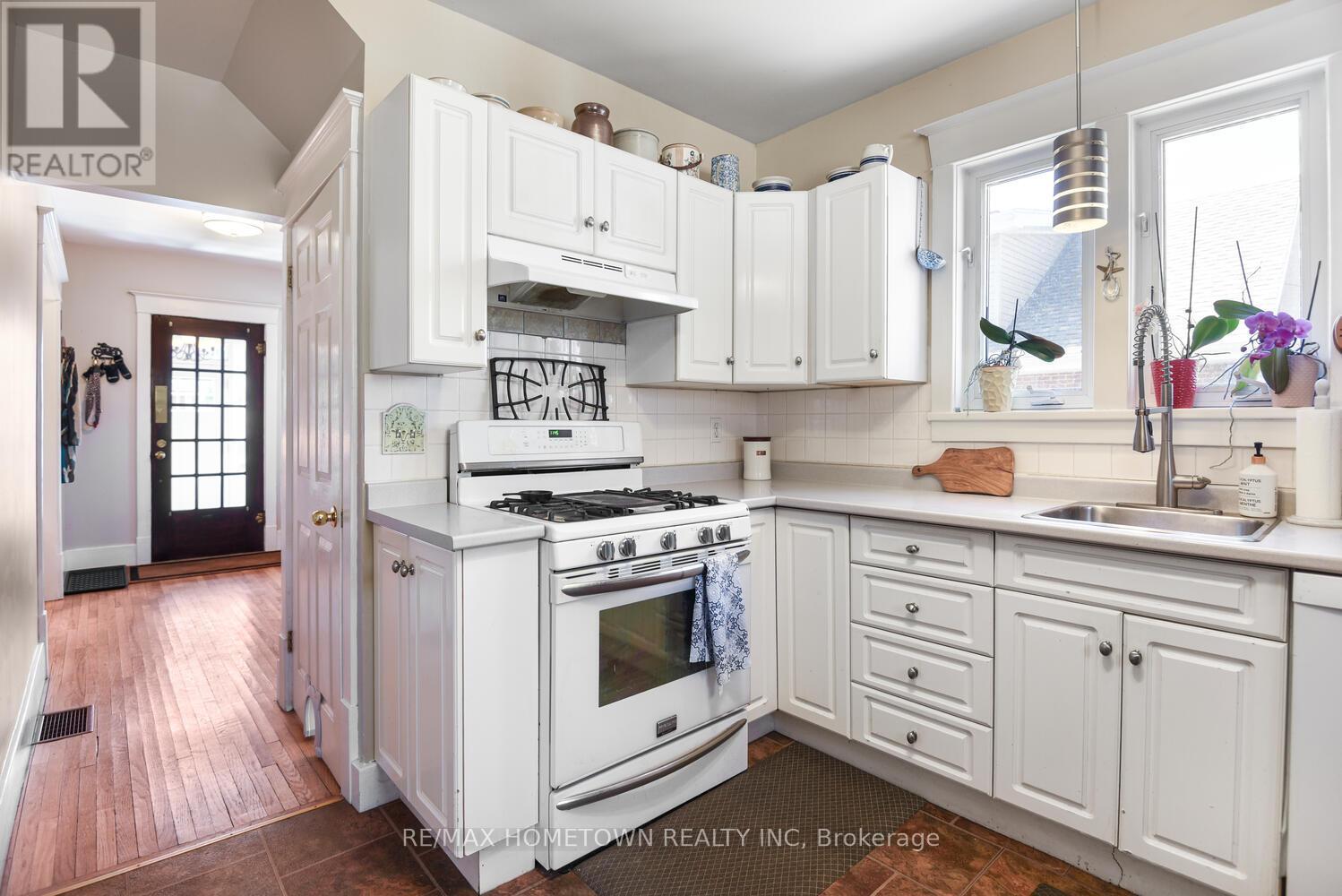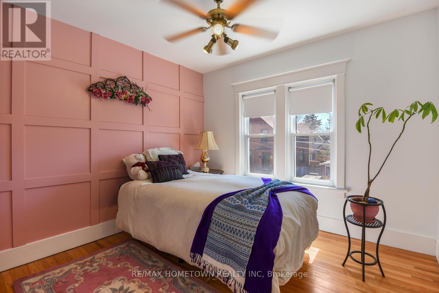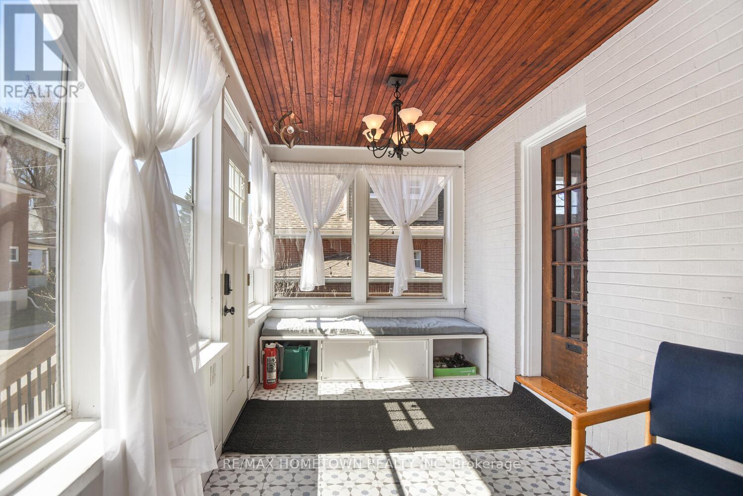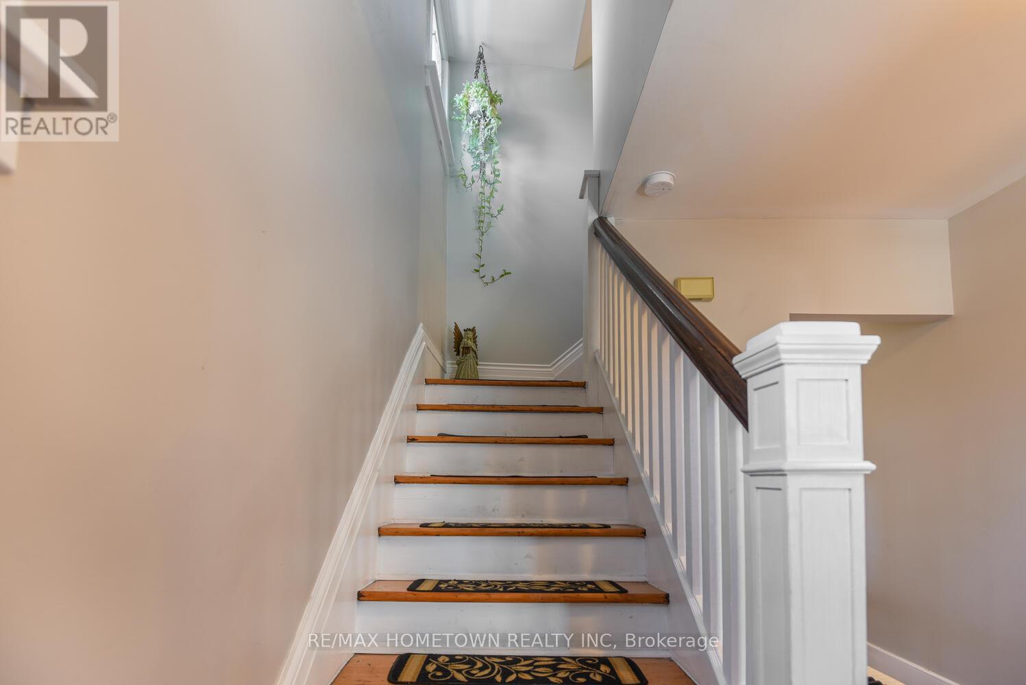 Welcome to this charming 2.5-storey home in the heart of Brockville's historic downtown district-where timeless character meets functional family living. The main level welcomes you with a cozy enclosed veranda, perfect for relaxing on warm summer evenings, and a spacious foyer that flows into an inviting living room featuring a natural gas fireplace and beautiful original-style built-ins. A formal dining room with hardwood flooring offers the perfect setting for family gatherings, while the well-designed kitchen provides both functionality and space for everyday living. Upstairs, you'll find three bedrooms, all with hardwood flooring, along with a fourth room currently used as an oversized walk-in closet. The third level loft offers a versatile bonus space-ideal for a home office, playroom, or creative studio. The lower level adds practicality with ample storage and a convenient laundry area. Step outside to enjoy your private courtyard-perfect for summer barbecues and outdoor entertaining-plus the added bonus of a single-car garage. Located just steps from parks, shopping, and recreation, this home offers an unbeatable lifestyle in a sought-after downtown setting. Recent updates include central air (2022), repointed chimneys (2023), garage door (2022), and hot water tank (2025). Cameras, generator, and accessories are negotiable. (id:64974)