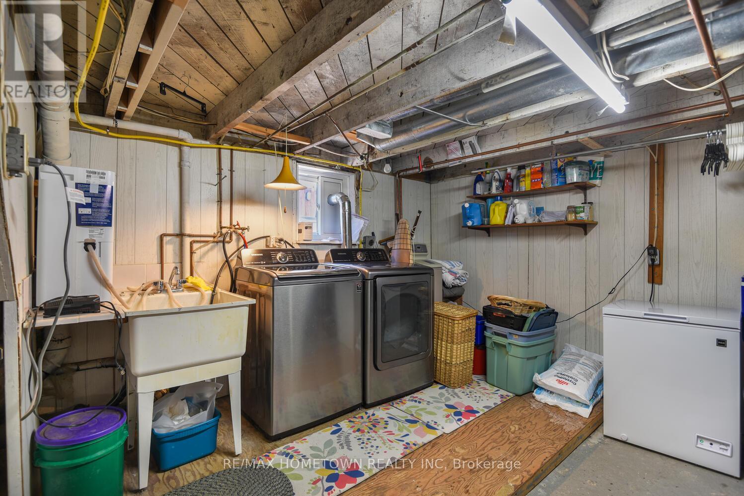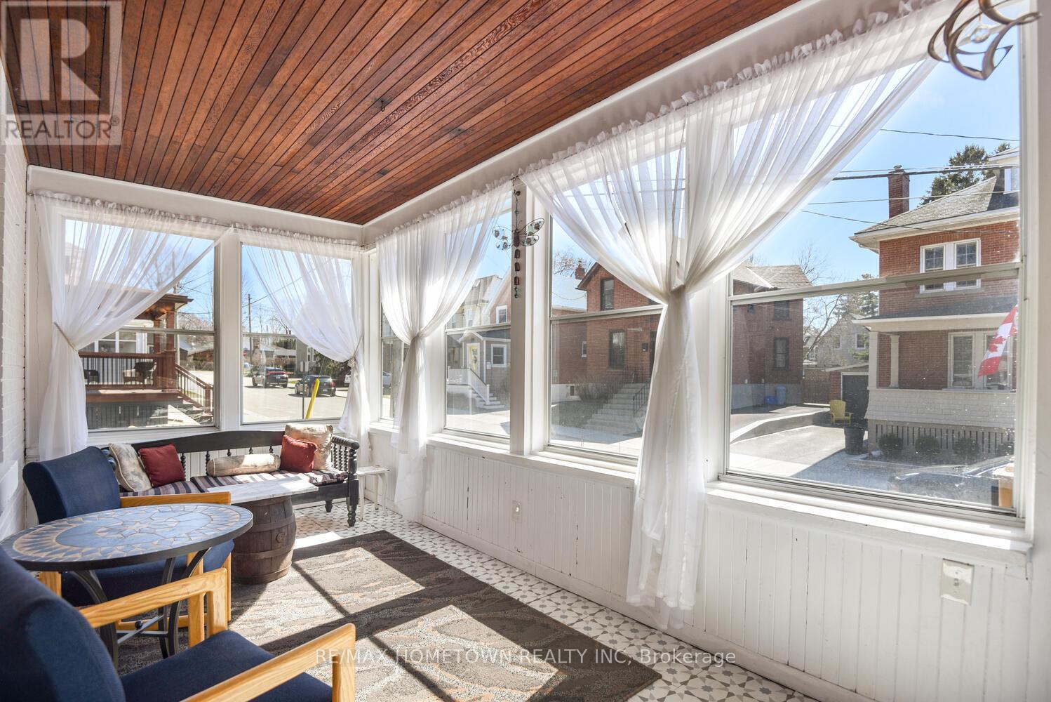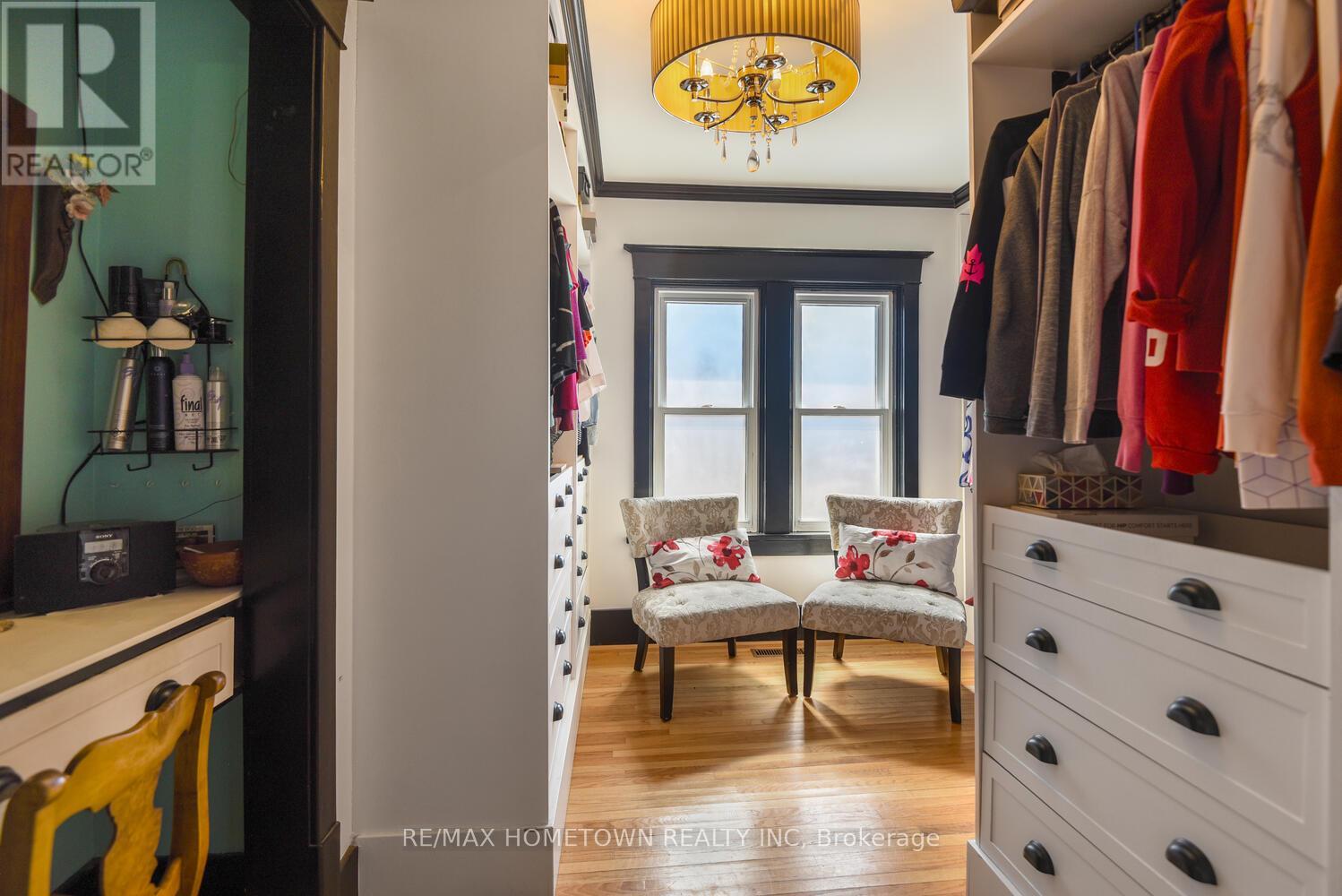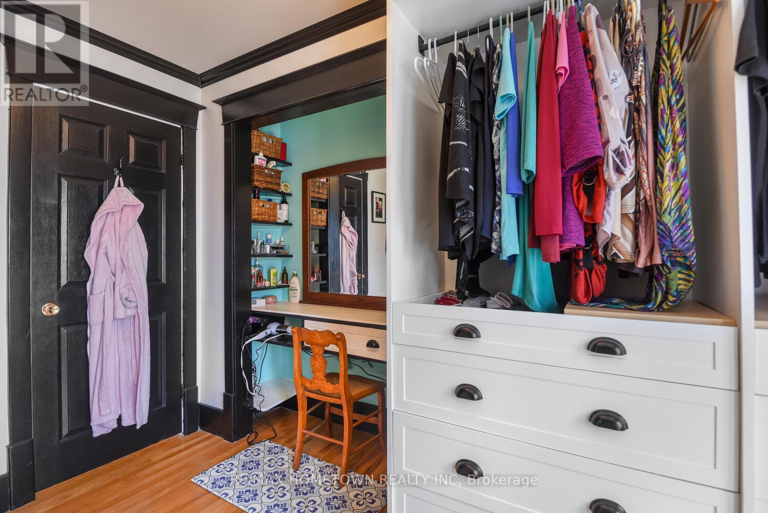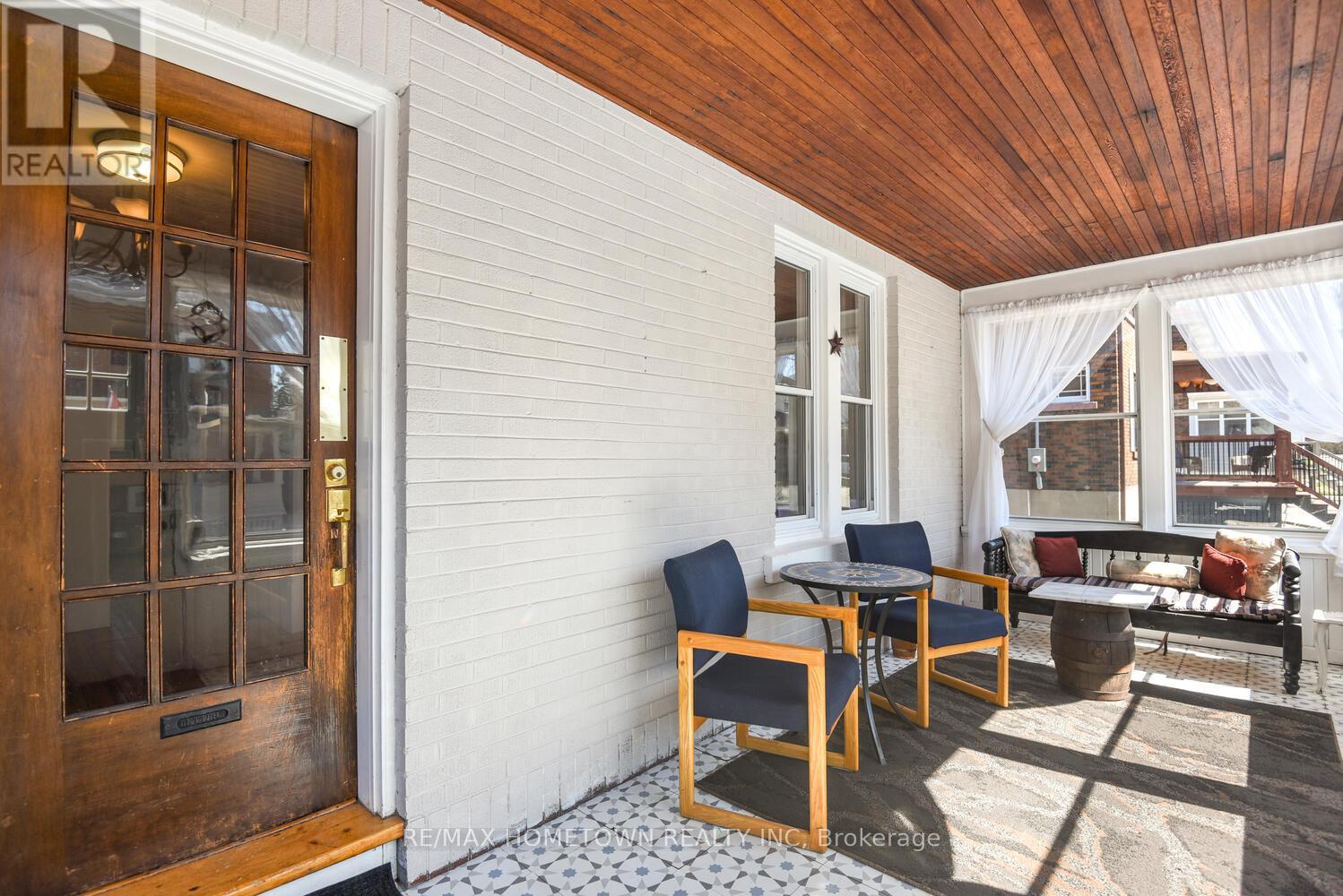 Welcome to this charming 2.5-storey home in the heart of Brockville's historic downtown district-where timeless character meets functional family living. The main level welcomes you with a cozy enclosed veranda, perfect for relaxing on warm summer evenings, and a spacious foyer that flows into an inviting living room featuring a natural gas fireplace and beautiful original-style built-ins. A formal dining room with hardwood flooring offers the perfect setting for family gatherings, while the well-designed kitchen provides both functionality and space for everyday living. Upstairs, you'll find three bedrooms, all with hardwood flooring, along with a fourth room currently used as an oversized walk-in closet. The third level loft offers a versatile bonus space-ideal for a home office, playroom, or creative studio. The lower level adds practicality with ample storage and a convenient laundry area. Step outside to enjoy your private courtyard-perfect for summer barbecues and outdoor entertaining-plus the added bonus of a single-car garage. Located just steps from parks, shopping, and recreation, this home offers an unbeatable lifestyle in a sought-after downtown setting. Recent updates include central air (2022), repointed chimneys (2023), garage door (2022), and hot water tank (2025). Cameras, generator, and accessories are negotiable. (id:64974)
