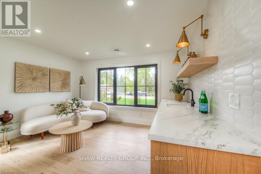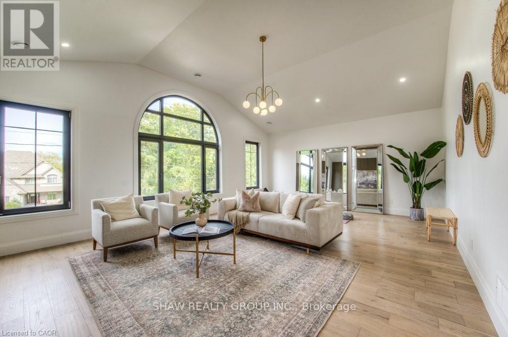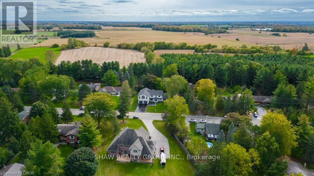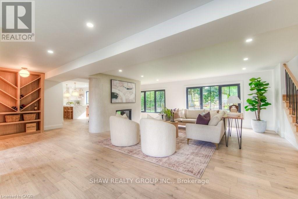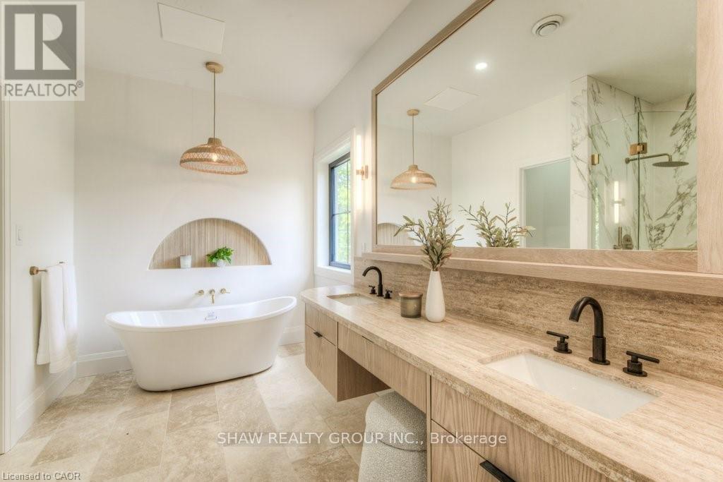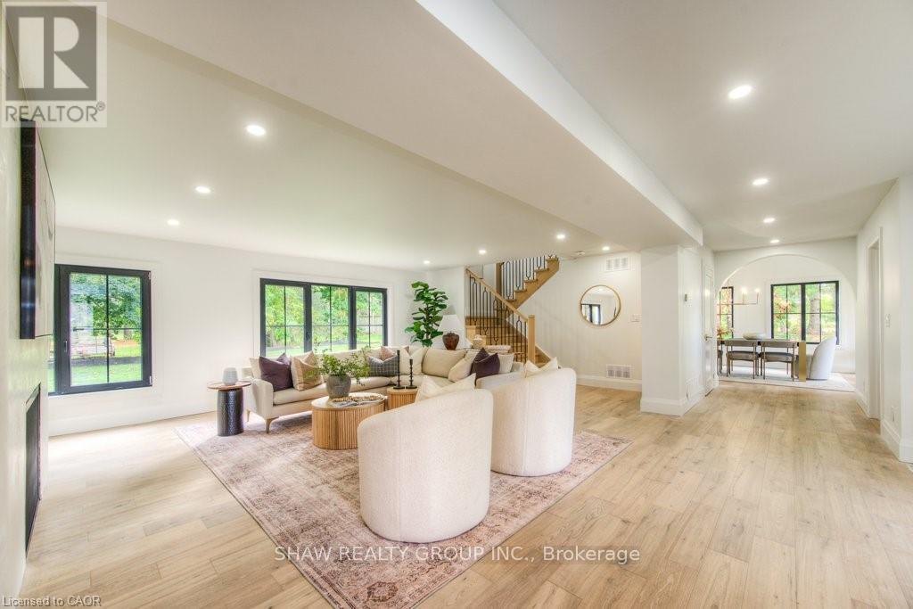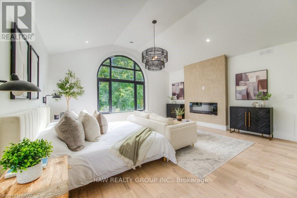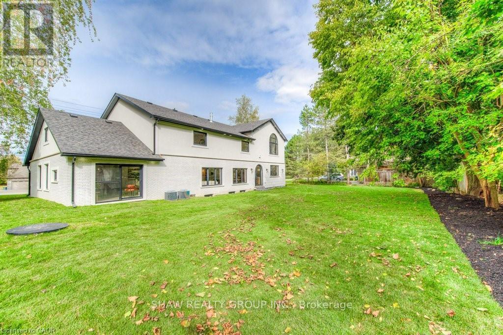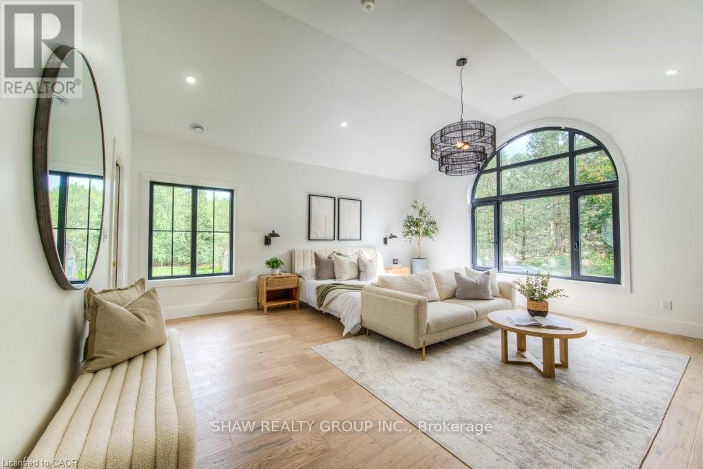 Welcome to a newly constructed luxury estate with over 6,500 sq ft of professionally designed space on a rare 107 146 ft private lot, minutes from Kitchener-Waterloo. Built in 2023 and curated by Lush Designs, this architectural residence blends timeless European-inspired design with modern family functionality - delivering a level of craftsmanship and scale rarely available in the region. From the moment you enter, soaring ceilings, expansive sightlines, and oversized triple-glazed European windows create an atmosphere of light, openness, and luxury. The main level is designed for both elegant entertaining and everyday living, featuring a grand open-concept layout anchored by a striking double-sided Roman clay fireplace connecting the living and dining spaces. The chef's kitchen is a showpiece, complete with custom white oak cabinets, a 10-ft double waterfall porcelain island, paneled high-end appliances, walk-in prep pantry, and a designer range - seamlessly blending beauty with performance. Upstairs, the home offers a spacious and thoughtfully designed second level with five large bedrooms, each with ensuite access, a luxurious primary retreat featuring cathedral ceilings, fireplace, spa-like ensuite, and a generous walk-in closet. A bonus flex living area provides space for a family lounge, home gym, or office. The fully finished lower level adds over 1,600 sq ft of additional space, including a media zone, wet bar, guest area, and flexible recreation spaces - ideal for multi-generational living/entertaining. Set on a premium lot with a long private driveway, double garage, and room for outdoor amenities such as a pool or cabana, this property offers a combination of estate-style privacy with unmatched proximity to urban conveniences, minutes from Highway 7/8, shopping, universities, and Waterloo's tech hub. A truly exceptional offering for buyers seeking space, design excellence, and long-term value in one of the region's most desirable locations. (id:64974)