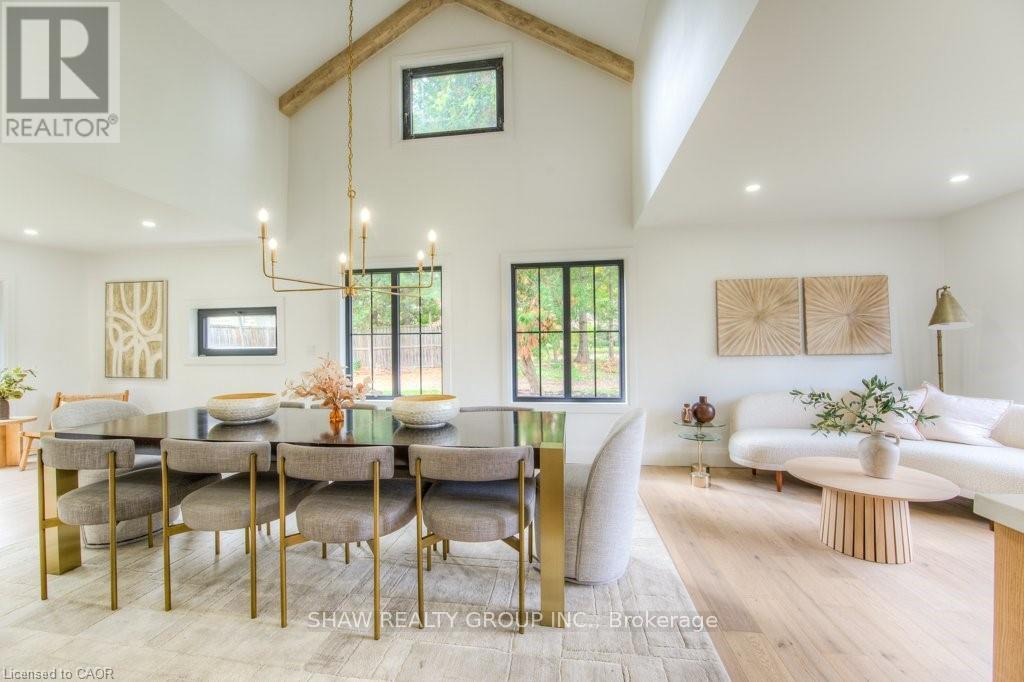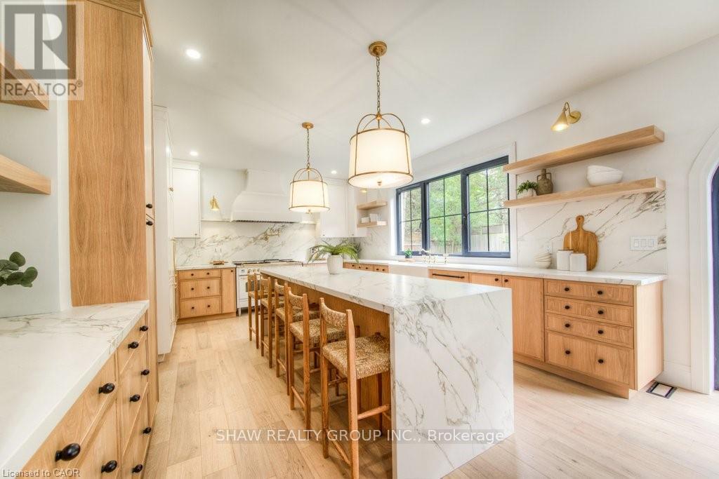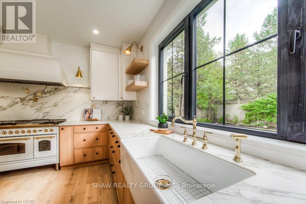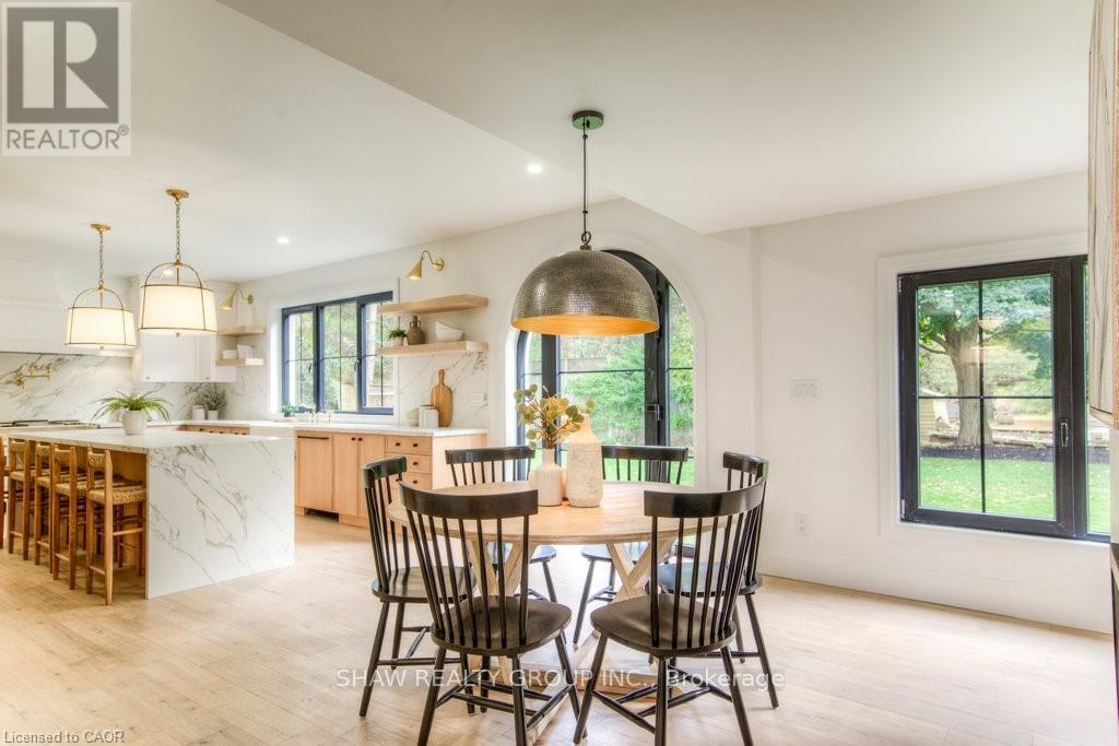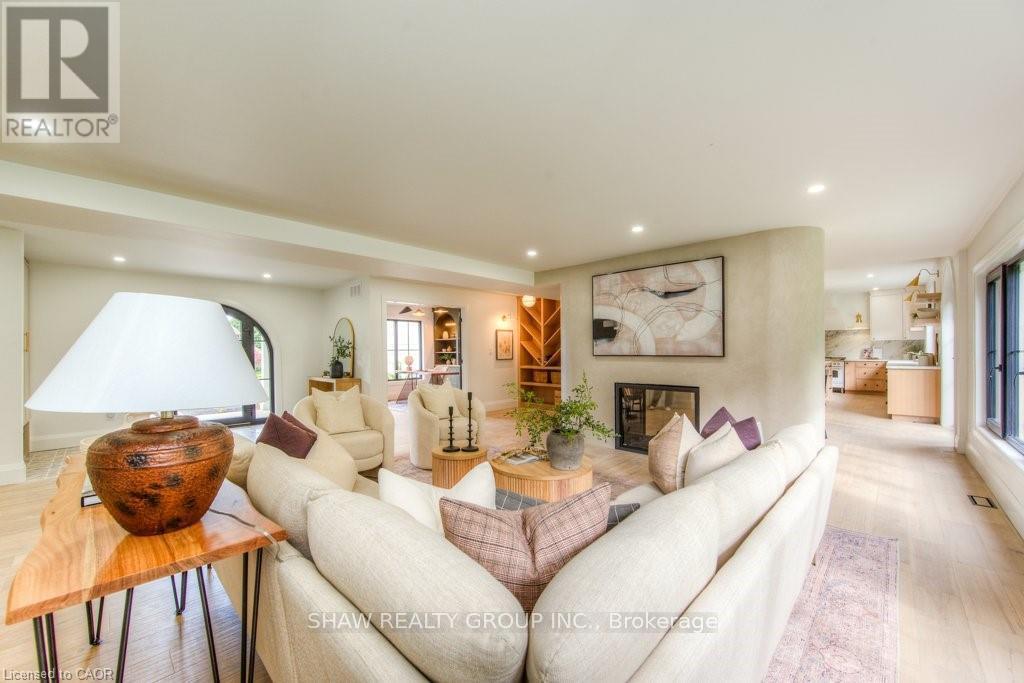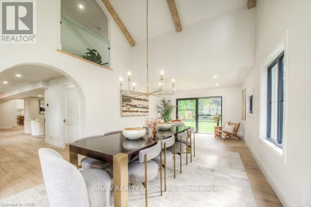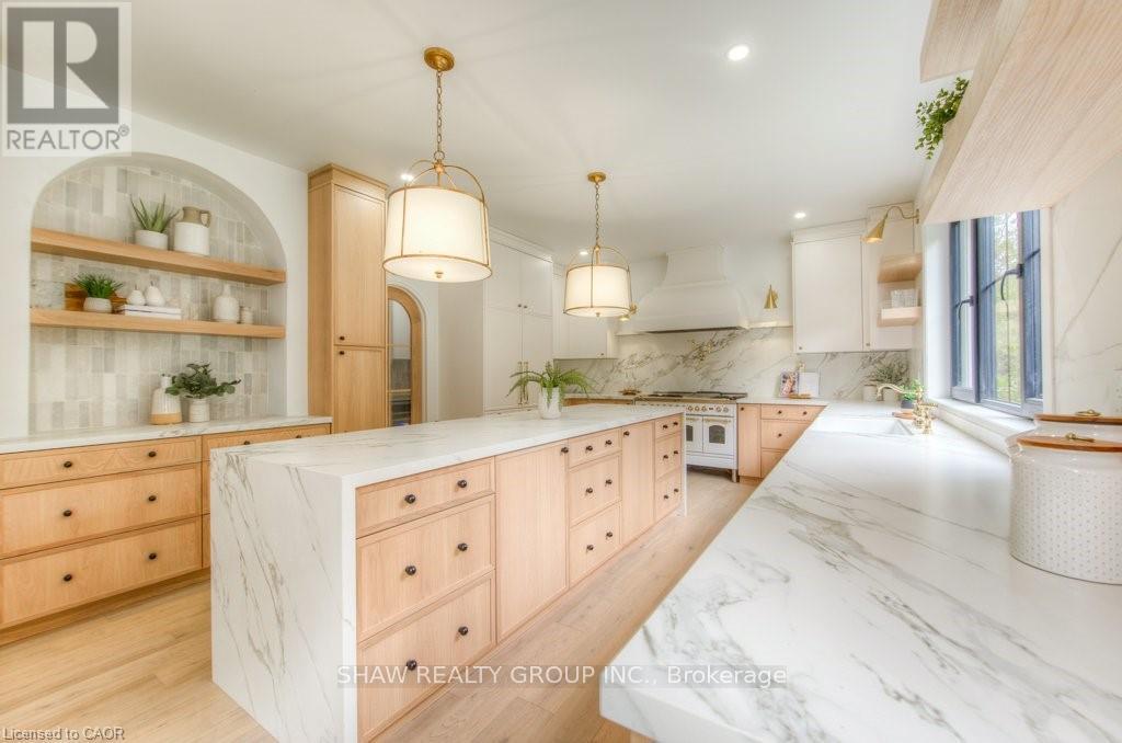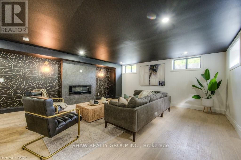 Welcome to a newly constructed luxury estate with over 6,500 sq ft of professionally designed space on a rare 107 146 ft private lot, minutes from Kitchener-Waterloo. Built in 2023 and curated by Lush Designs, this architectural residence blends timeless European-inspired design with modern family functionality - delivering a level of craftsmanship and scale rarely available in the region. From the moment you enter, soaring ceilings, expansive sightlines, and oversized triple-glazed European windows create an atmosphere of light, openness, and luxury. The main level is designed for both elegant entertaining and everyday living, featuring a grand open-concept layout anchored by a striking double-sided Roman clay fireplace connecting the living and dining spaces. The chef's kitchen is a showpiece, complete with custom white oak cabinets, a 10-ft double waterfall porcelain island, paneled high-end appliances, walk-in prep pantry, and a designer range - seamlessly blending beauty with performance. Upstairs, the home offers a spacious and thoughtfully designed second level with five large bedrooms, each with ensuite access, a luxurious primary retreat featuring cathedral ceilings, fireplace, spa-like ensuite, and a generous walk-in closet. A bonus flex living area provides space for a family lounge, home gym, or office. The fully finished lower level adds over 1,600 sq ft of additional space, including a media zone, wet bar, guest area, and flexible recreation spaces - ideal for multi-generational living/entertaining. Set on a premium lot with a long private driveway, double garage, and room for outdoor amenities such as a pool or cabana, this property offers a combination of estate-style privacy with unmatched proximity to urban conveniences, minutes from Highway 7/8, shopping, universities, and Waterloo's tech hub. A truly exceptional offering for buyers seeking space, design excellence, and long-term value in one of the region's most desirable locations. (id:64974)