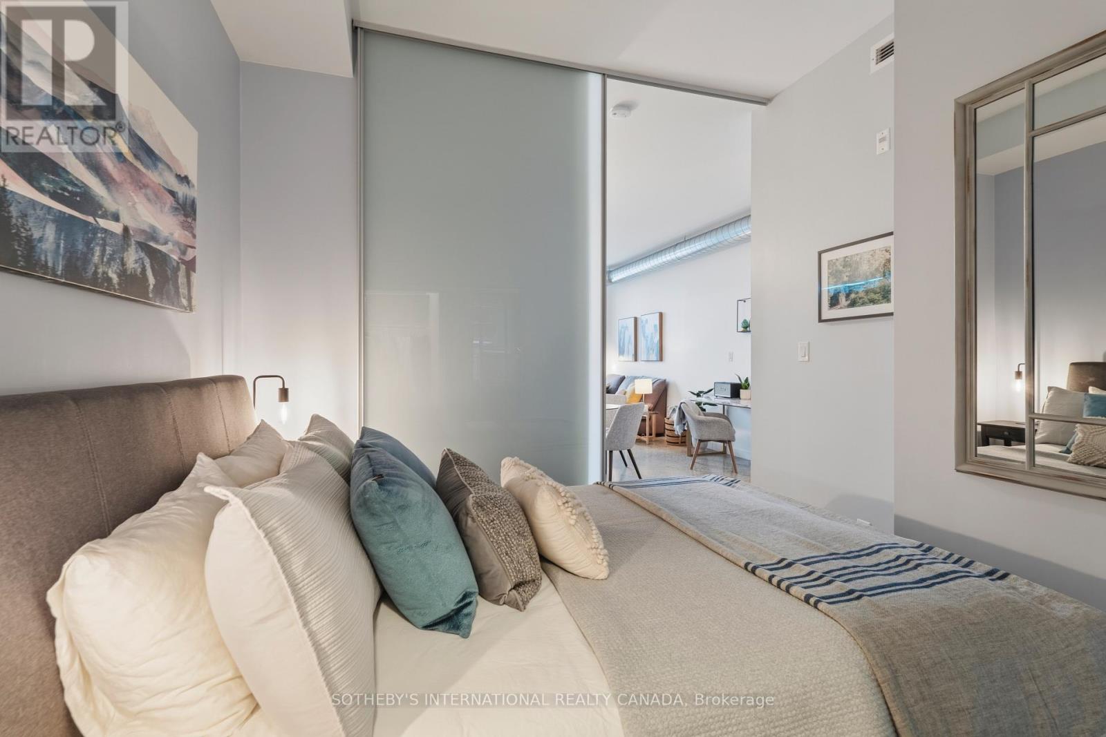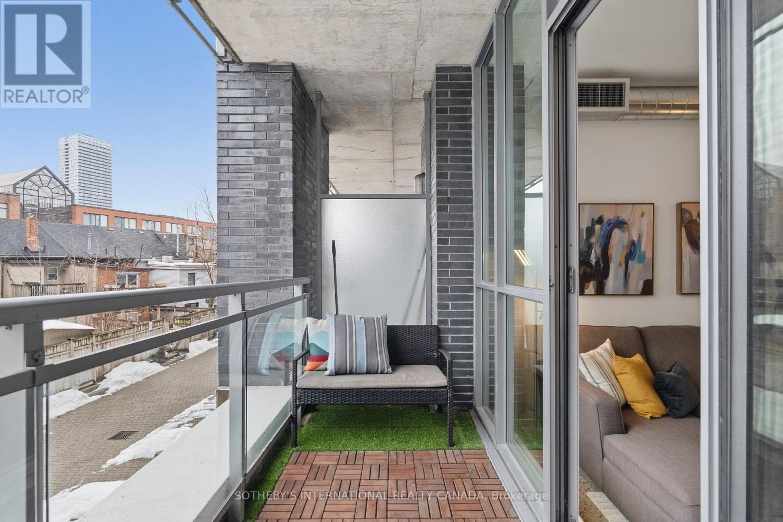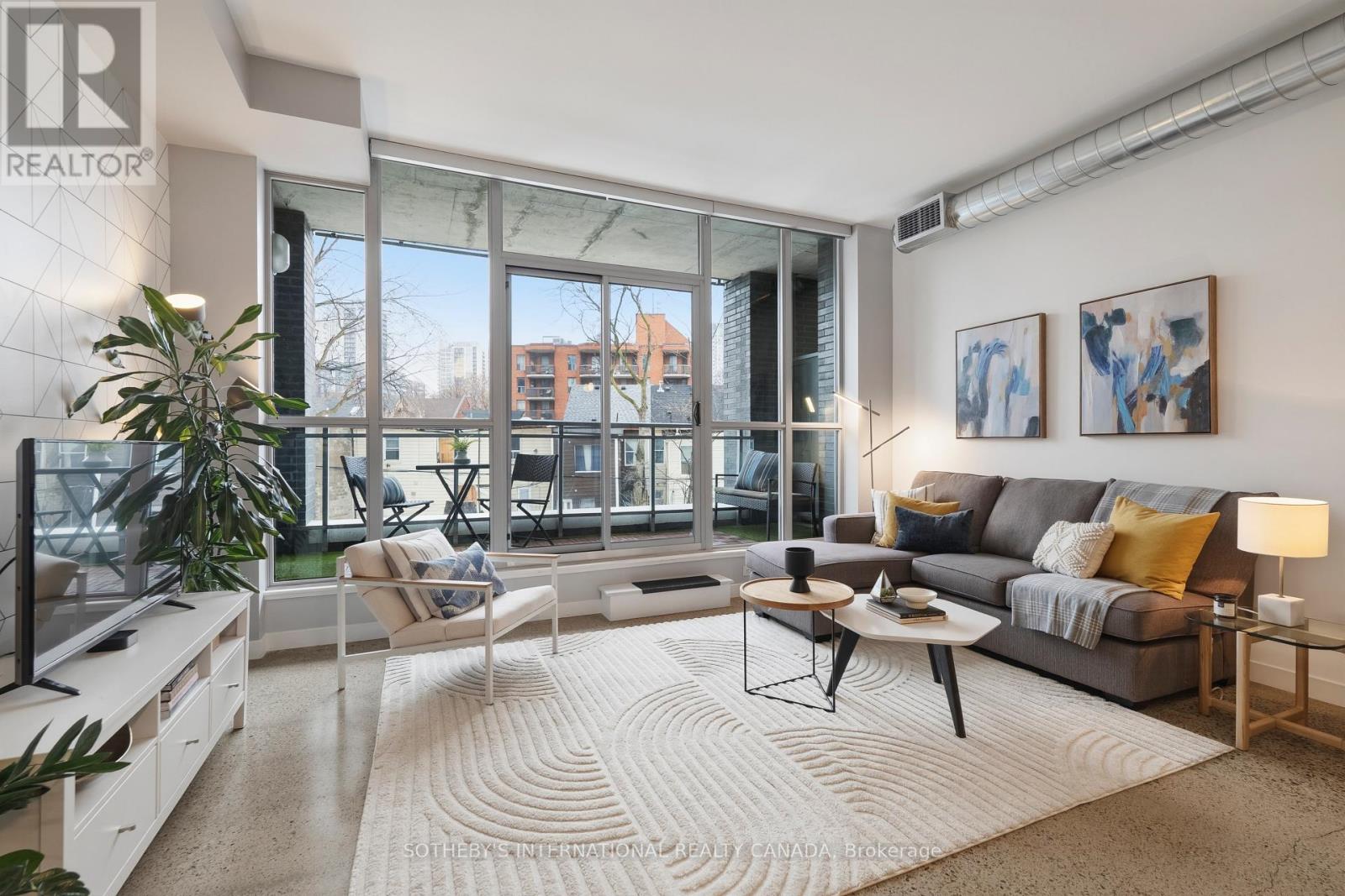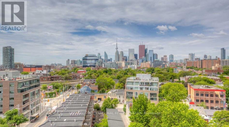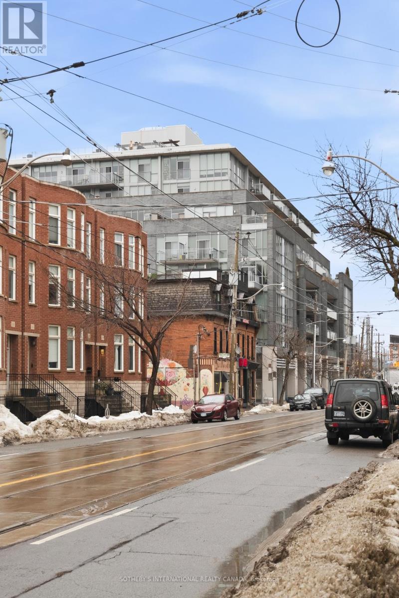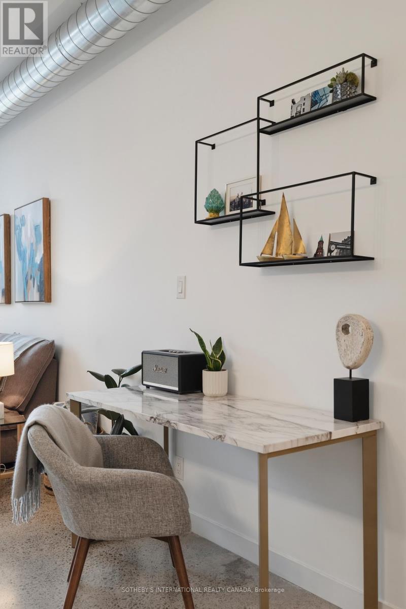 Welcome to stylish loft living at 510 King Street East #215, a bright and spacious one bedroom suite in the heart of Toronto's vibrant Corktown district. Offering approximately 650 sq. ft., this thoughtfully designed home features soaring 10-foot ceilings, cool modern concrete floors, and floor-to-ceiling windows that fill the space with natural light. Quietly positioned on the backside of the building, the suite enjoys a peaceful setting rarely found in the city. A walk-out from the living area extends your living space outdoors, perfect for morning coffee or evening unwinding. The favourable open-concept layout maximizes flow and functionality, creating an inviting space for both daily living and entertaining. The modern kitchen integrates seamlessly into the living and dining areas, while the well-proportioned bedroom offers comfort and privacy, complemented by a walk-in closet. A rare and valuable feature, this unit includes one of the larger parking spaces in a prime location, with EV chargers available in visitor parking, an exceptional convenience for city living. Residents of this boutique building enjoy premium amenities including a fully equipped fitness centre, stylish party and lounge spaces, rooftop terrace with city views, and concierge service making it one of Corktown's most desirable addresses. Located in the sought-after Corktown neighbourhood, you are surrounded by beloved cafés, restaurants, and local shops, with the Distillery Historic District, Corktown Common, and St. Lawrence Market just minutes away. Easy access to trails, transit, and the downtown core offers the perfect balance of green space, historic charm, and urban convenience. Experience the character, connectivity, and lifestyle that make Corktown one of Toronto's most exciting places to call home. (id:64974)