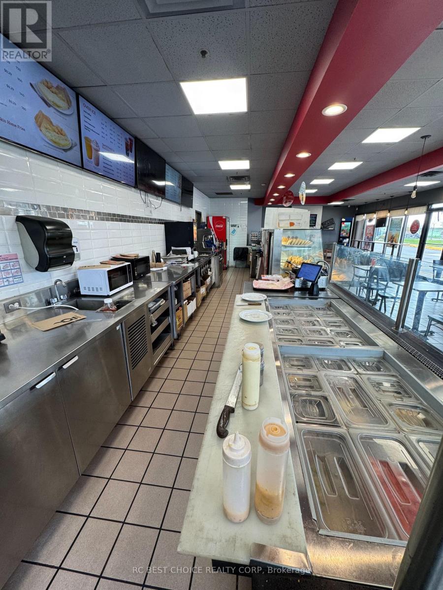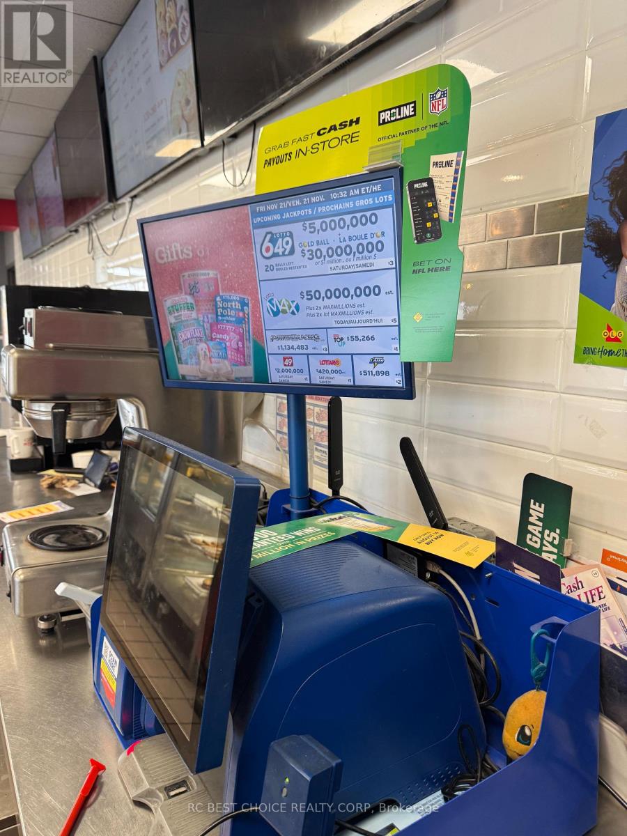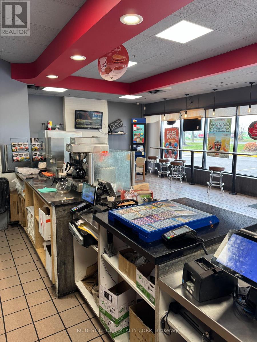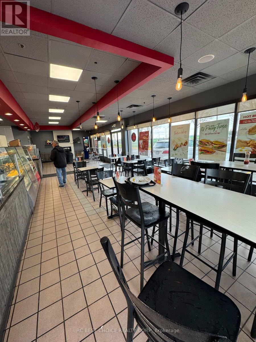 Well-established Coffee Time franchise in a high-exposure Etobicoke corridor beside Pearson Airport. Located at the Hwy 427-409 interchange with quick Hwy 401 access, offering strong drive-thru visibility and steady traffic from travelers, hotel guests, office staff, and logistics workers.2,500 sq.ft. unit with dine-in, take-out, and full drive-thru. Newly signed 5 + 5 long-term lease. Multiple income streams including a profitable OLG counter with fixed monthly net income and potential to add a CIBC ATM for additional rental revenue. Strong sales history with high Uber Eats and DoorDash order volume. Turnkey, stable franchise opportunity ideal for both owner-operators and investors in a proven, high-demand location. (id:64974)