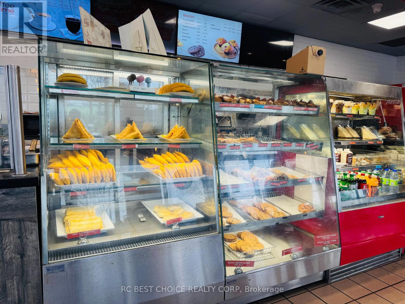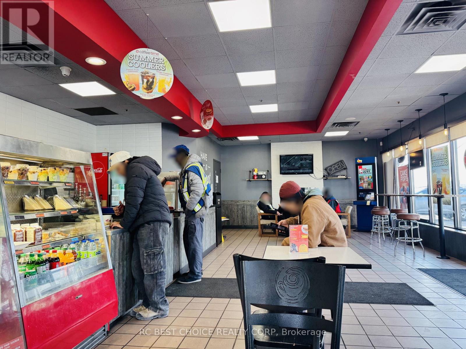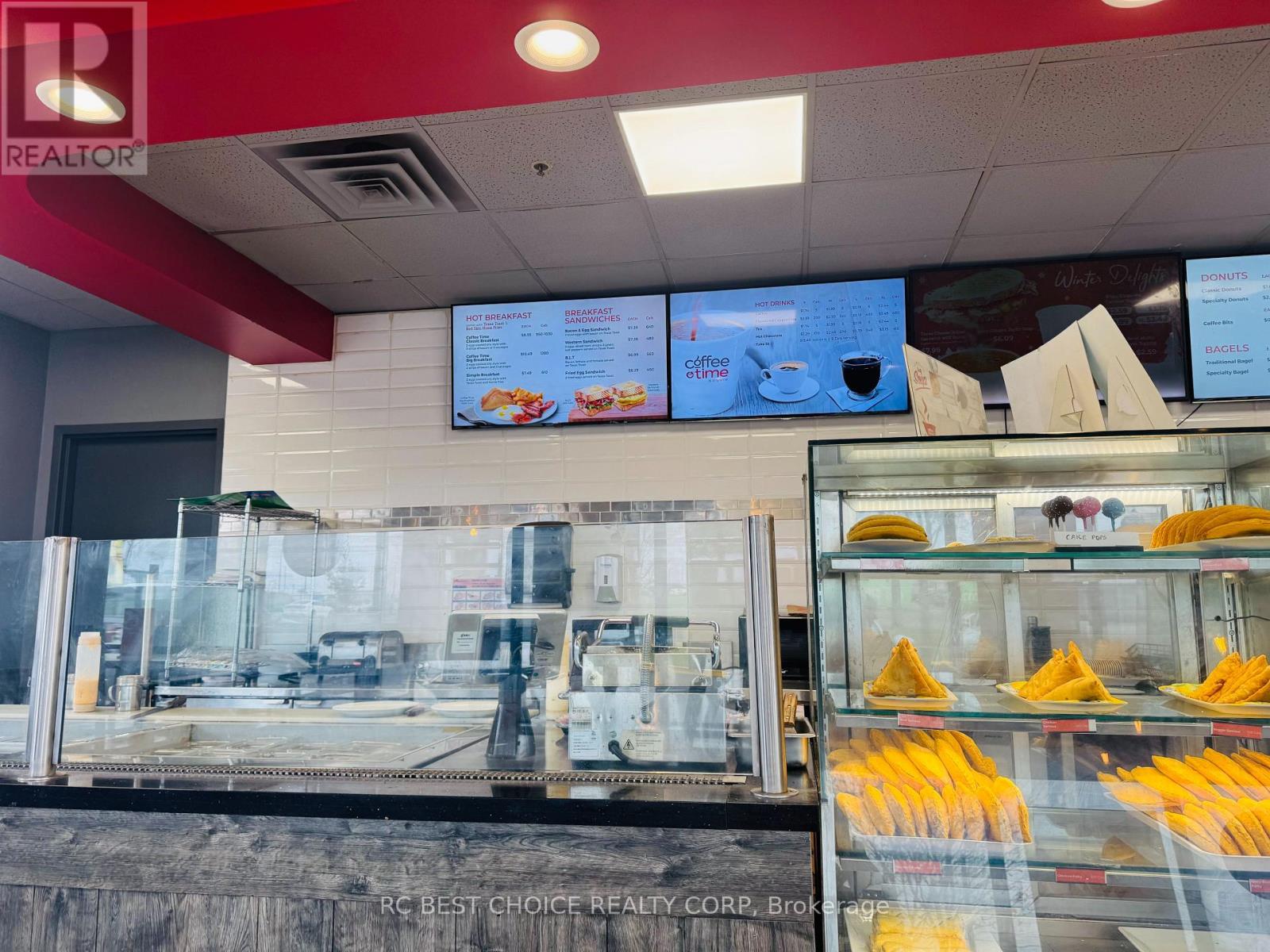 Well-established Coffee Time franchise in a high-exposure Etobicoke corridor beside Pearson Airport. Located at the Hwy 427-409 interchange with quick Hwy 401 access, offering strong drive-thru visibility and steady traffic from travelers, hotel guests, office staff, and logistics workers.2,500 sq.ft. unit with dine-in, take-out, and full drive-thru. Newly signed 5 + 5 long-term lease. Multiple income streams including a profitable OLG counter with fixed monthly net income and potential to add a CIBC ATM for additional rental revenue. Strong sales history with high Uber Eats and DoorDash order volume. Turnkey, stable franchise opportunity ideal for both owner-operators and investors in a proven, high-demand location. (id:64974)