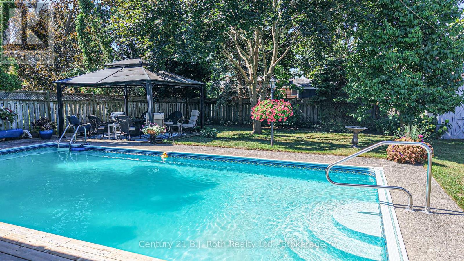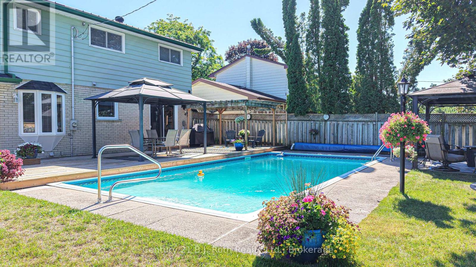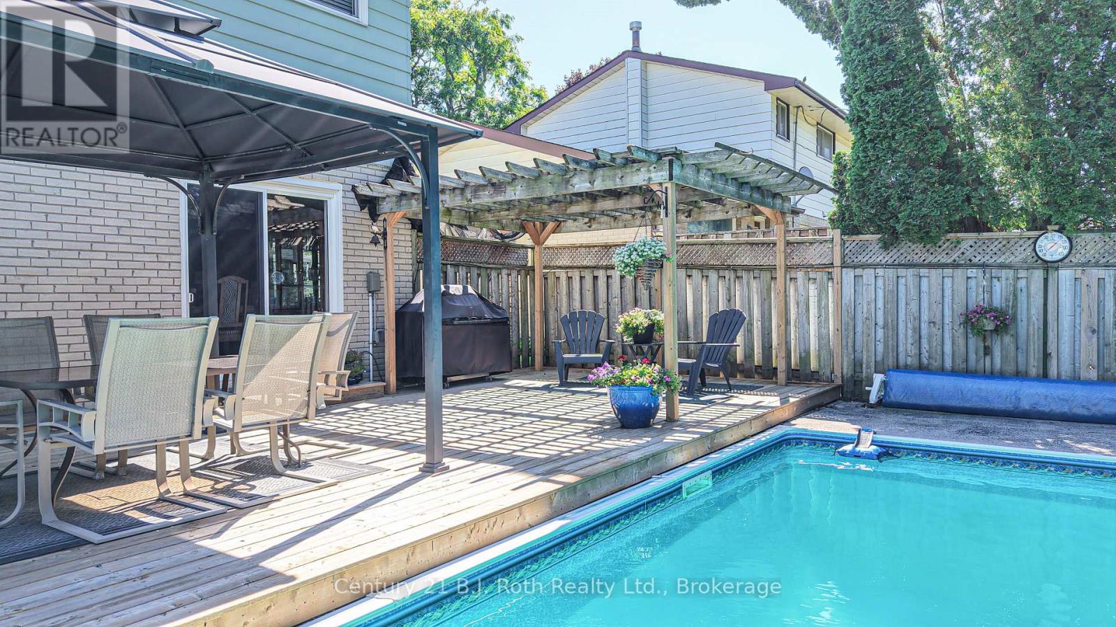 Now is your chance to raise your family in one of the most sought-after North Ward neighbourhoods! This well-maintained 4-bedroom, 1.5-bath, 2-storey home offers comfort, convenience, and fantastic outdoor living-perfect for today's busy family.A welcoming covered entry leads into the bright main floor featuring gleaming hardwood floors throughout. The spacious living room with bay window fills the space with natural light, while the adjacent dining area overlooks the picturesque back yard. The efficient galley-style kitchen boasts classic oak cabinetry, a cozy breakfast nook, and direct access to your fully fenced backyard oasis. A convenient 2-piece powder room is located on the main level. The original garage has been converted into a versatile space currently used as a main-floor laundry, but it would easily function as a playroom, home office, recreation room-or be converted back to a garage if desired. Upstairs, you'll find a beautifully updated 4-piece bathroom and four bedrooms, including one with a charming built-in desk/craft area and a spacious walk-in closet. The mostly finished basement offers a cozy family retreat complete with a gas fireplace and a bar area, ideal for relaxing or entertaining. Step outside to your private, treed, fully fenced backyard, featuring an expansive updated deck overlooking the inground pool, complete with a newer gas heater. Relax in the sunshine under the Pergola or choose to sit under one of the 2 Gazebos. It's the perfect setting for summer gatherings and family fun. Additional updates include windows & shingles. The home is equipped with natural gas heating and central air conditioning for year-round comfort. Located close to parks, schools, shopping, and just a short walk to downtown, this property offers the ideal blend of lifestyle and location. (id:64974)