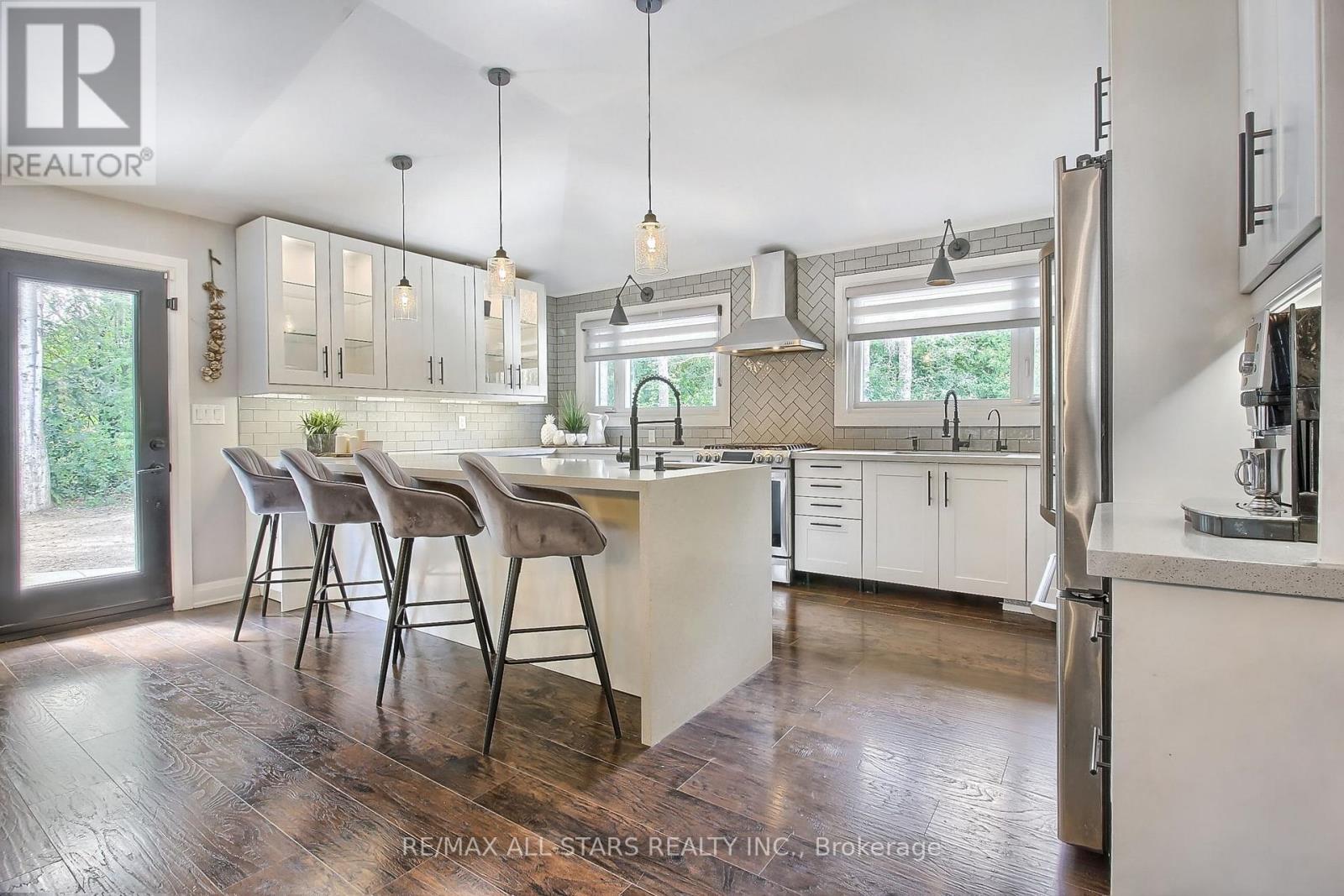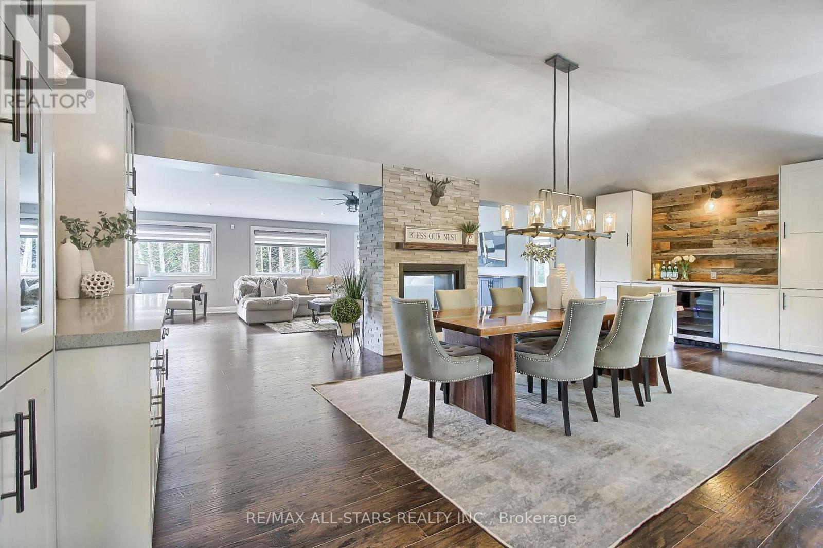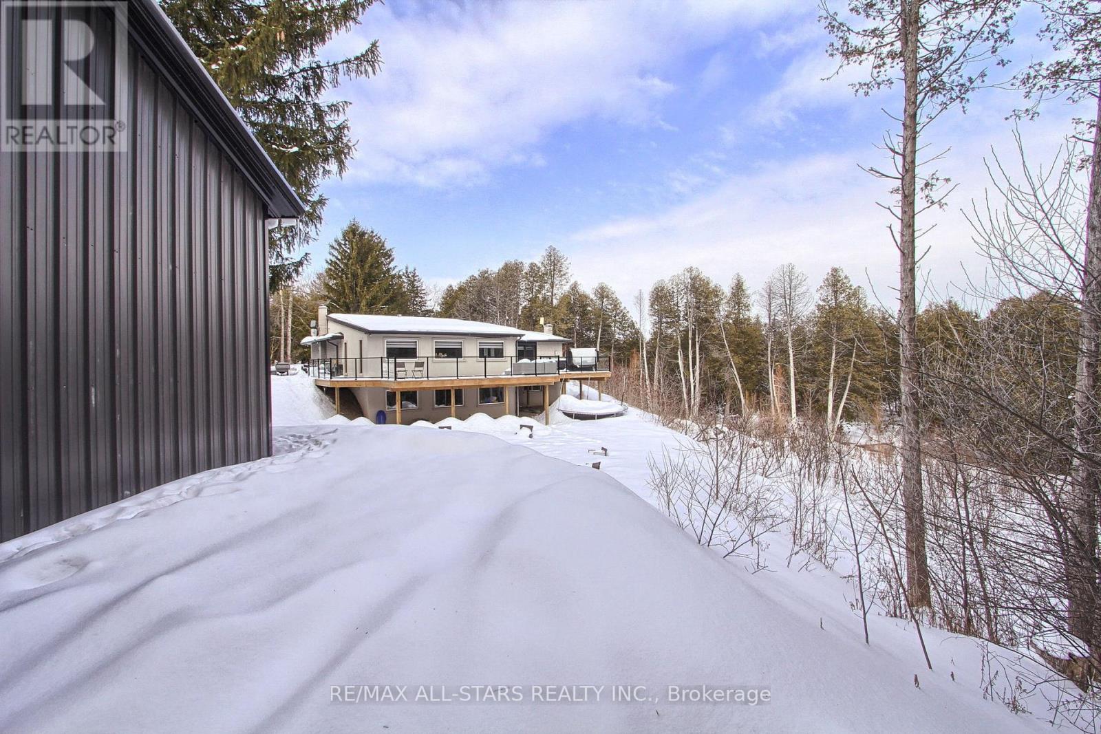 Drive thru your gated tree lined driveway to 10 acres of natures beauty- Generous sized 3 bedroom bungalow with a walk out basement. Beautifully designed with an open concept layout and multiple walkouts to a wrap around deck. This north facing home features custom barn door enclosed closets, hardwood thru out, custom window treatments, electric light fixtures, fancified washrooms with a floating vanity and hexagon tile work, live edge b/in cabinets and wood and stone feature walls. Breathtaking views from every window. Renovated kitchen with quartz countertops, seating for 4 at the breakfast bar and overlooking the dining room. Ideal for entertaining. Double sided fireplace!!! Fishing worthy creek on the east side and forest walking trails..Barn with water and electricity is ideal to house horses, donkeys, goats, chickens and sheep. Work shop is the ideal man/handyman cave. New Detached triple car garage 35 x 37 feet with car port.All this only 4 minutes from town, 407, Go Station and amenities. New WIndows, All new electricity running to the barn. (id:64974)